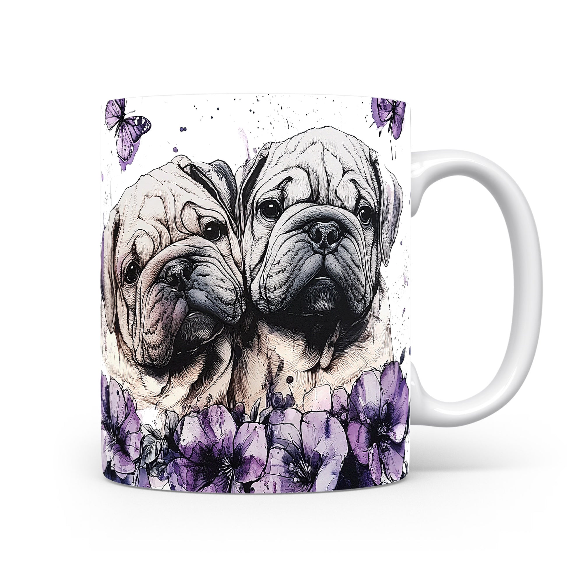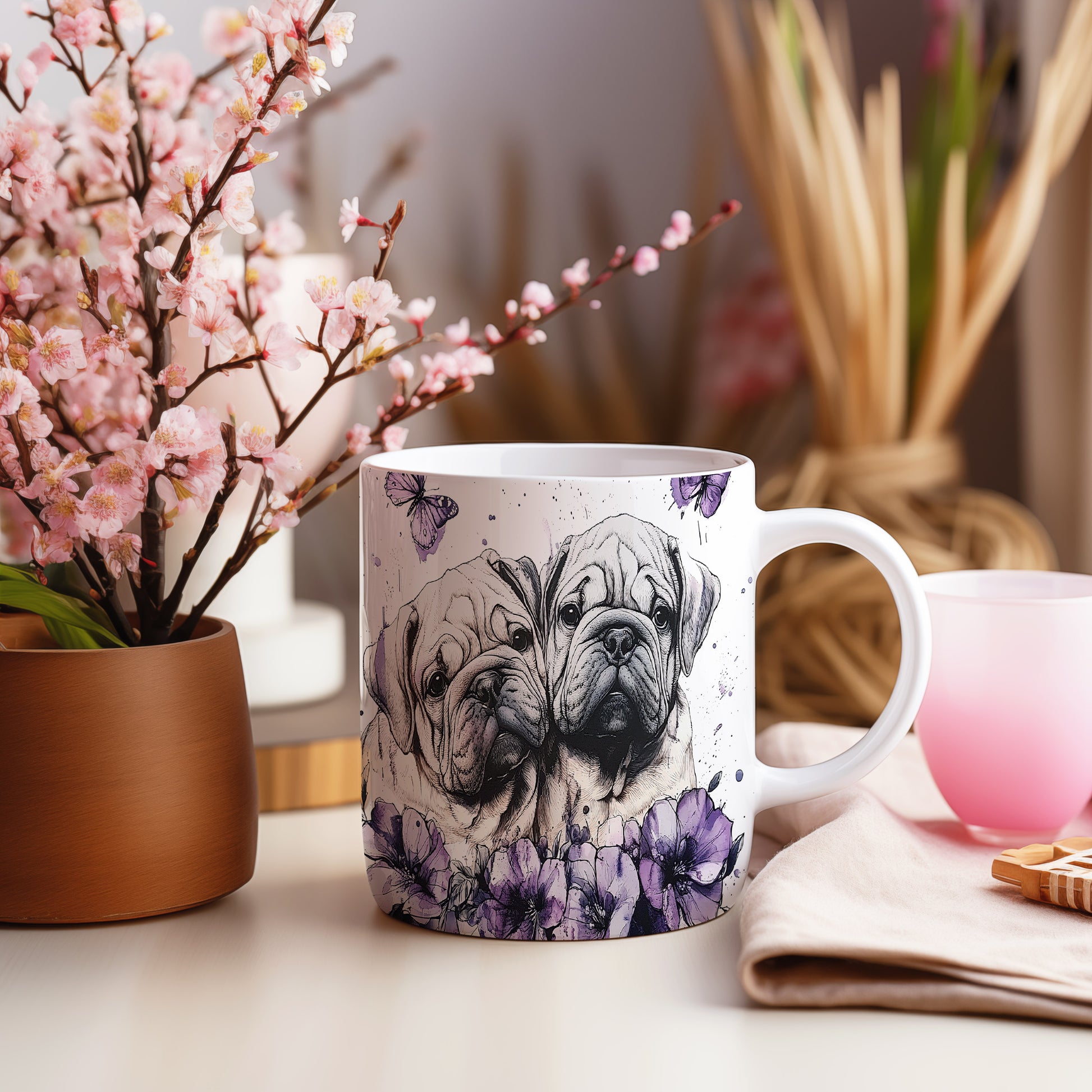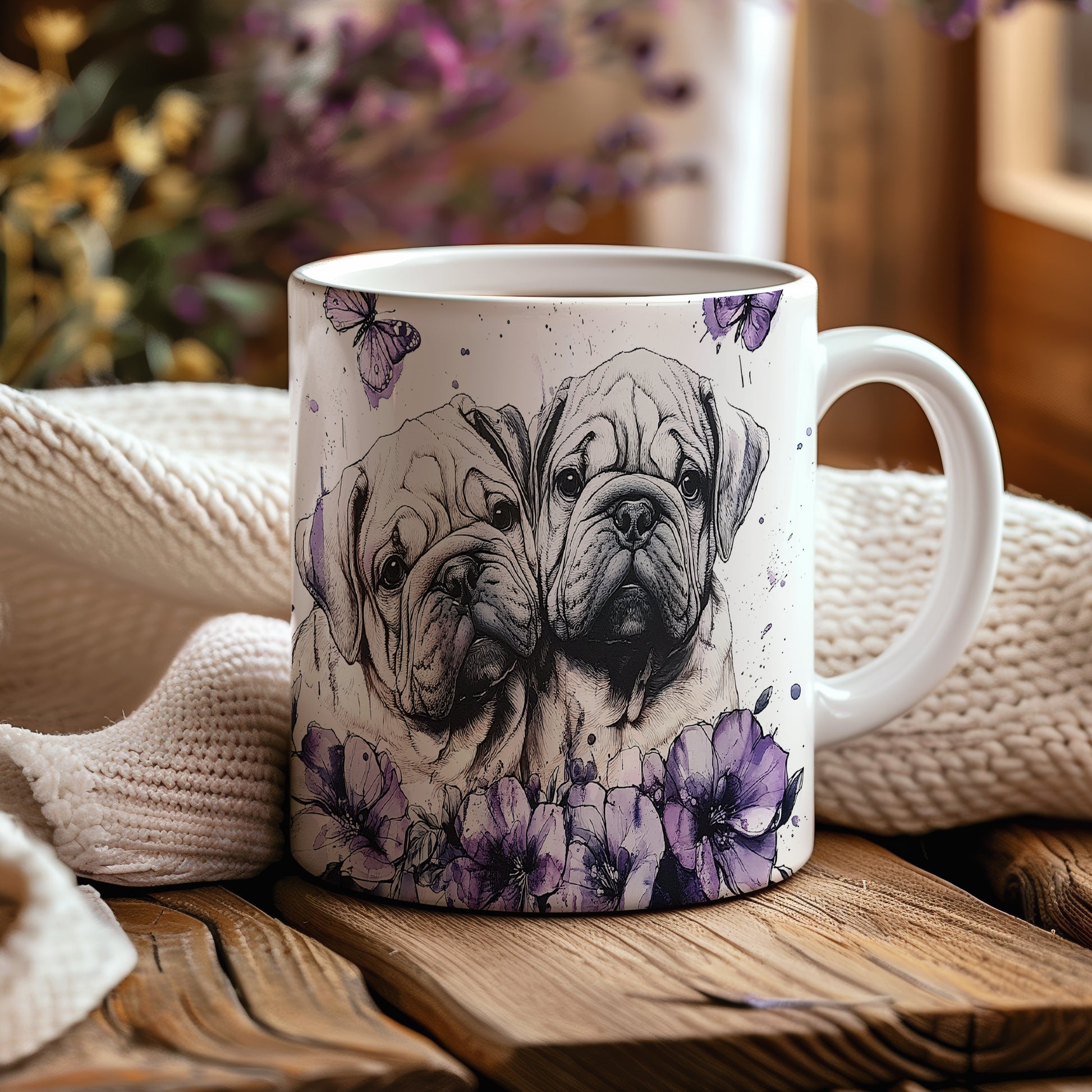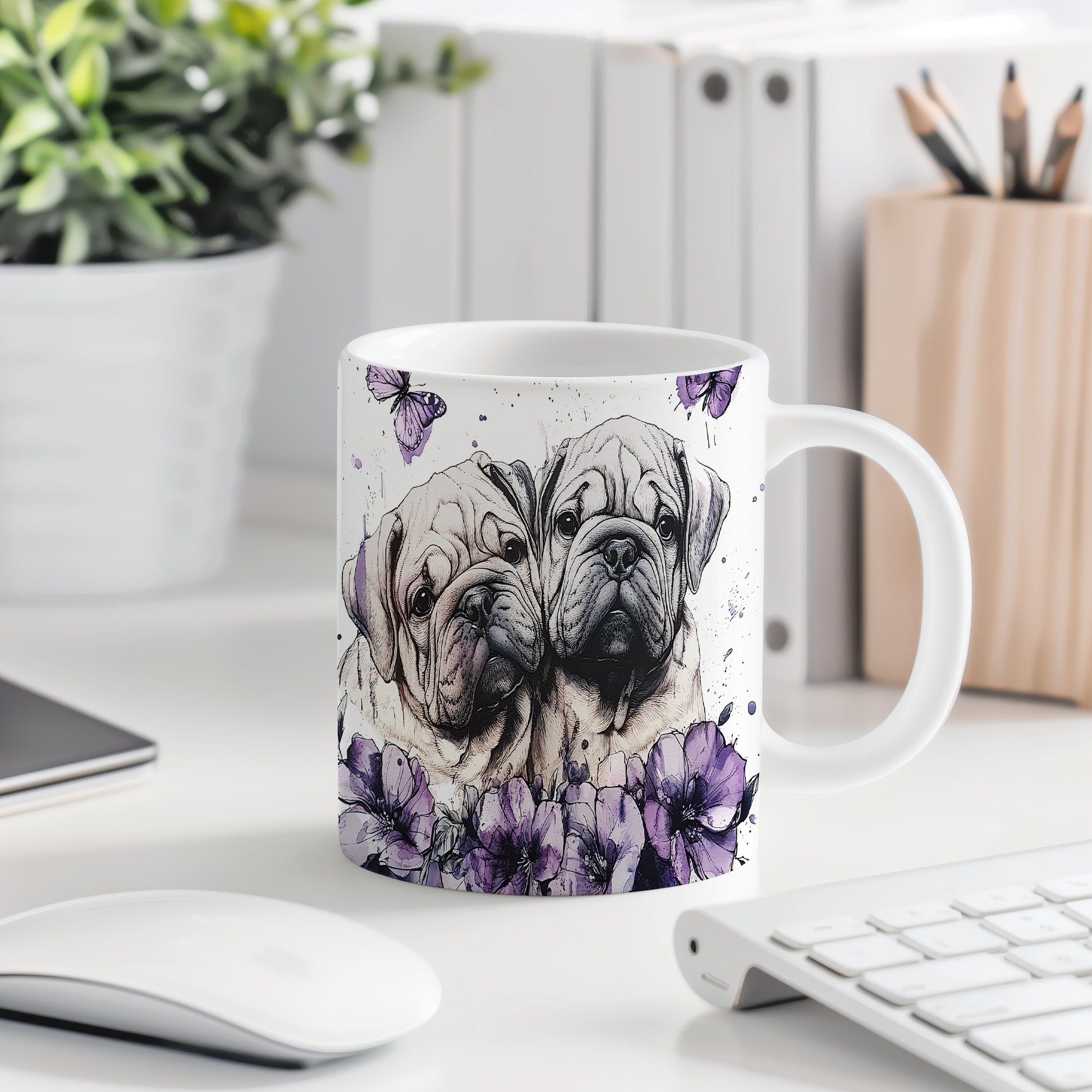 Hrnek s motivem dvou psů obklopených květinami a motýly. Tento stylový kousek je ideální pro milovníky zvířat a přírody, skvělý tip na dárek pro přátele nebo rodinu. Materiál: keramika. Objem: 330 ml. Vhodné do myčky i mikrovlnky. Užijte si každodenní kávu nebo čaj s tímto jedinečným hrnkem.