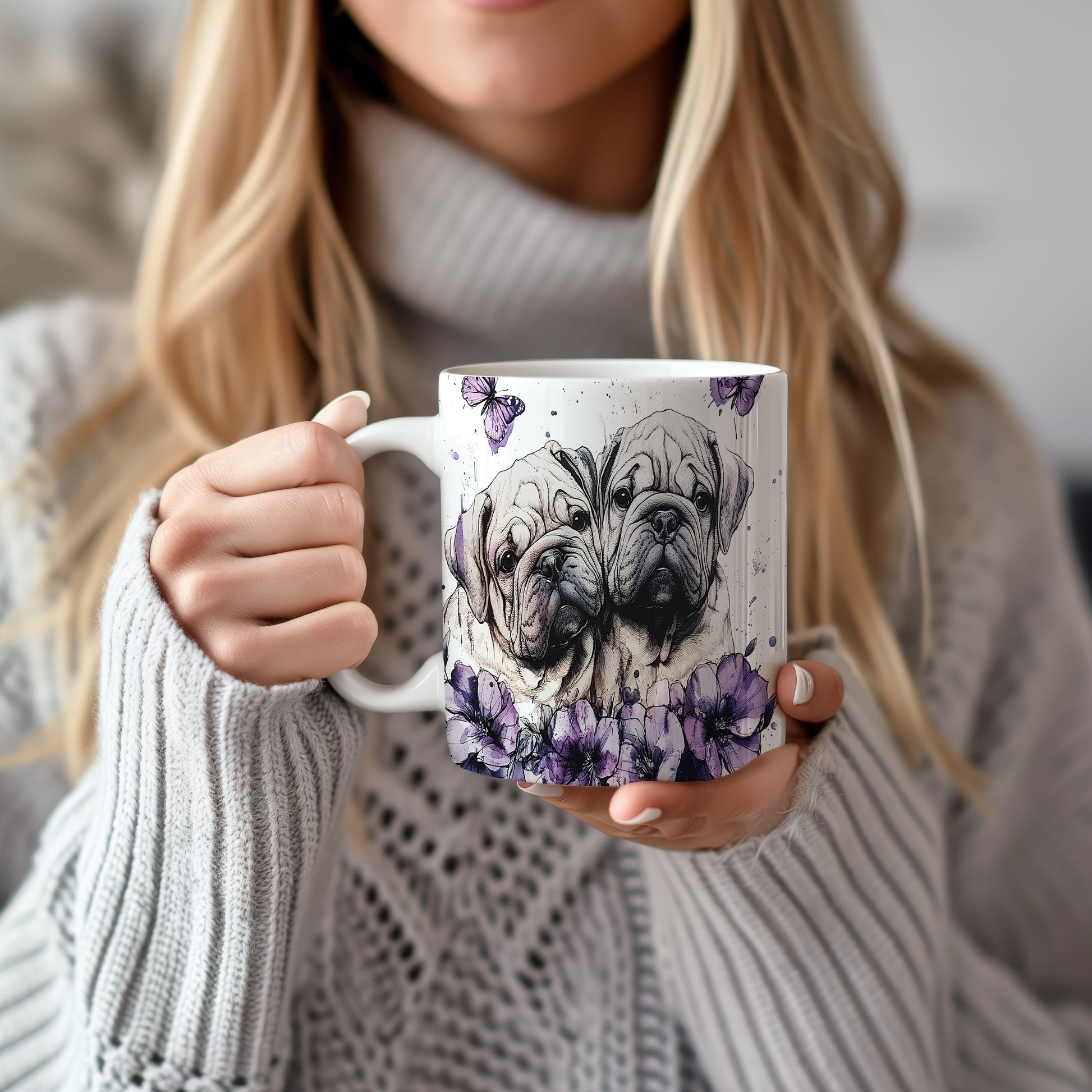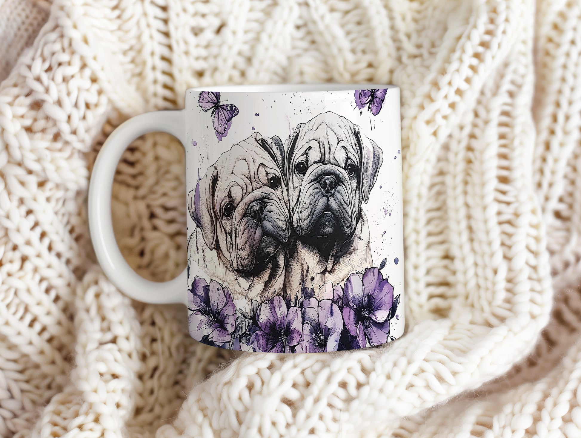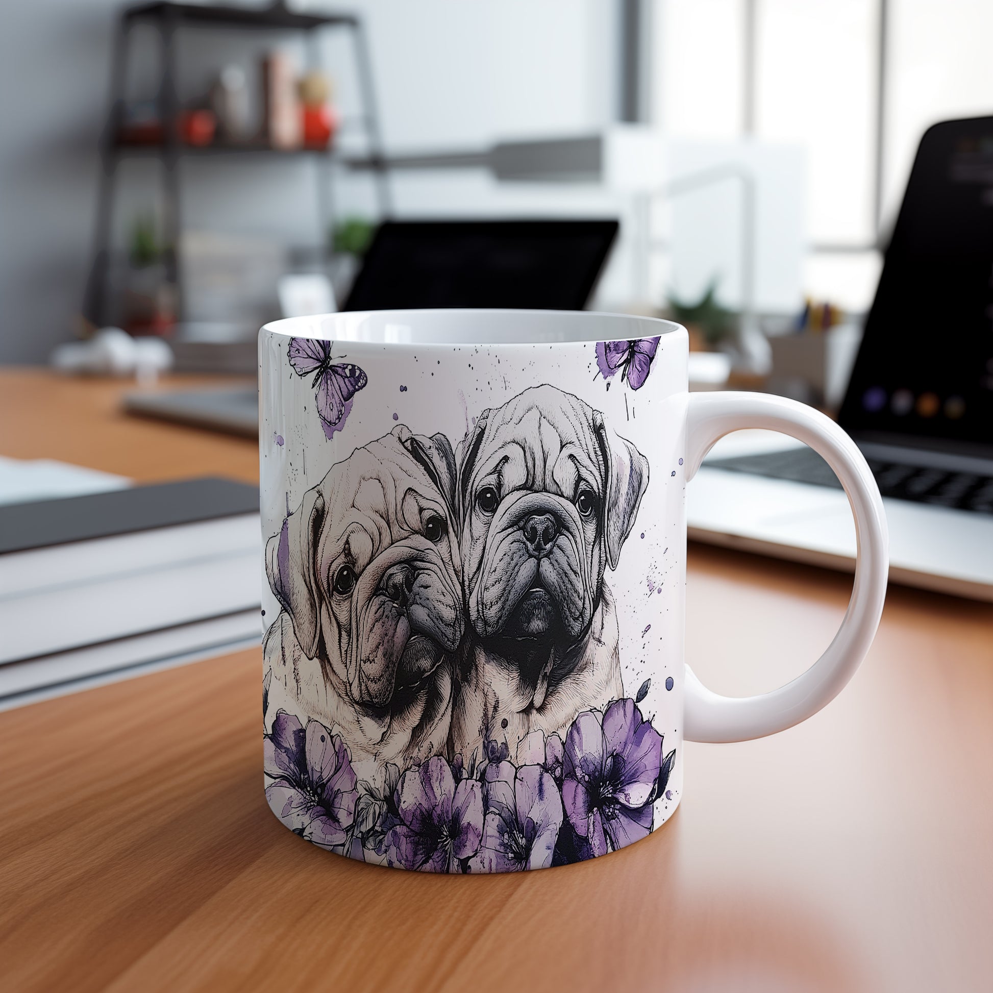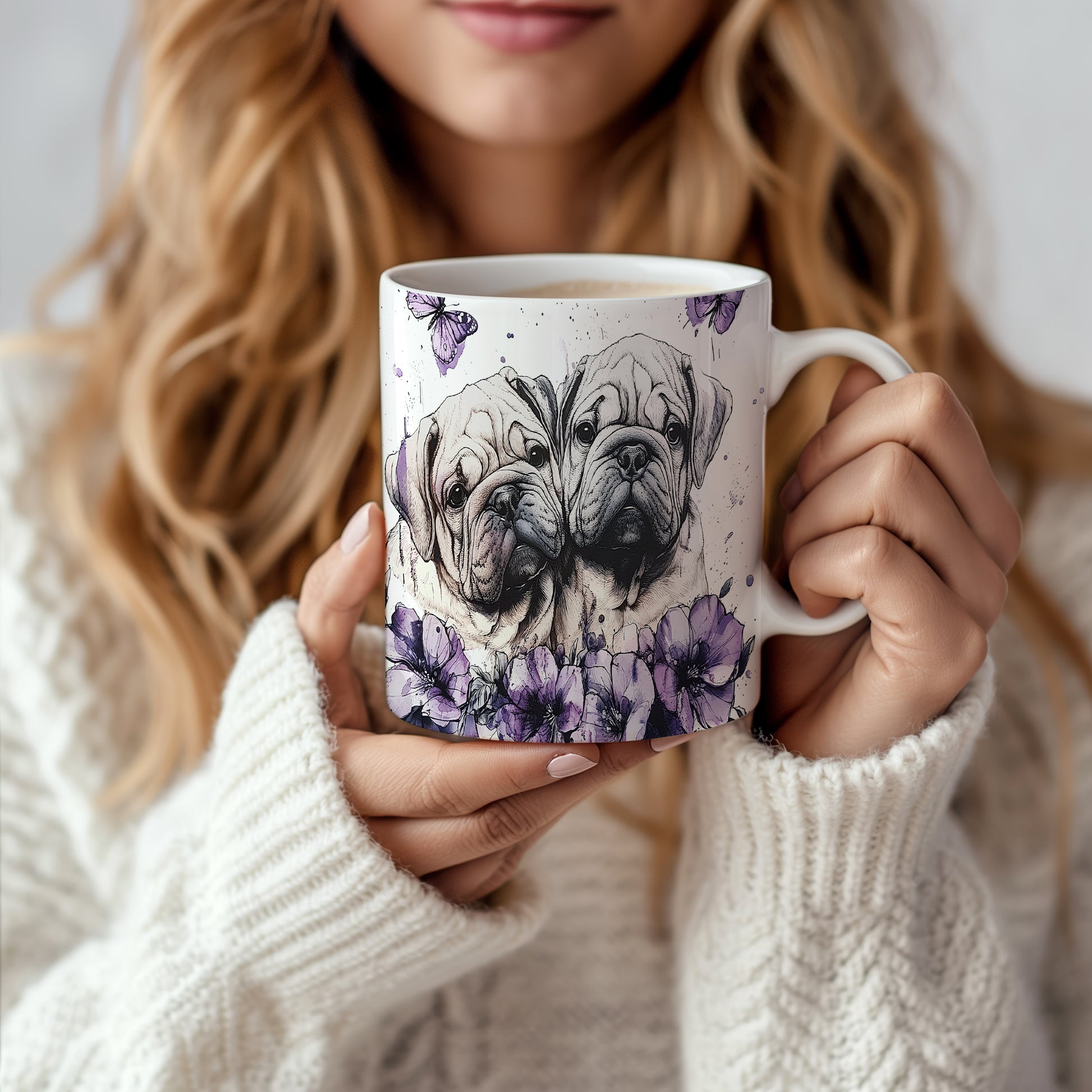 Hrnek s motivem dvou psů obklopených květinami a motýly. Tento stylový kousek je ideální pro milovníky zvířat a přírody, skvělý tip na dárek pro přátele nebo rodinu. Materiál: keramika. Objem: 330 ml. Vhodné do myčky i mikrovlnky. Užijte si každodenní kávu nebo čaj s tímto jedinečným hrnkem.