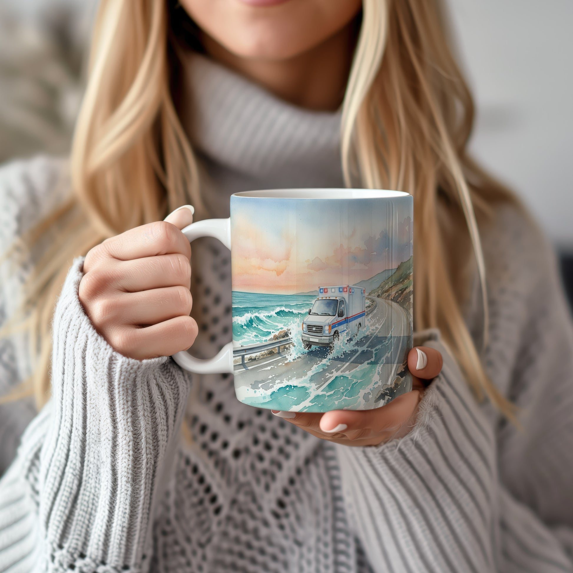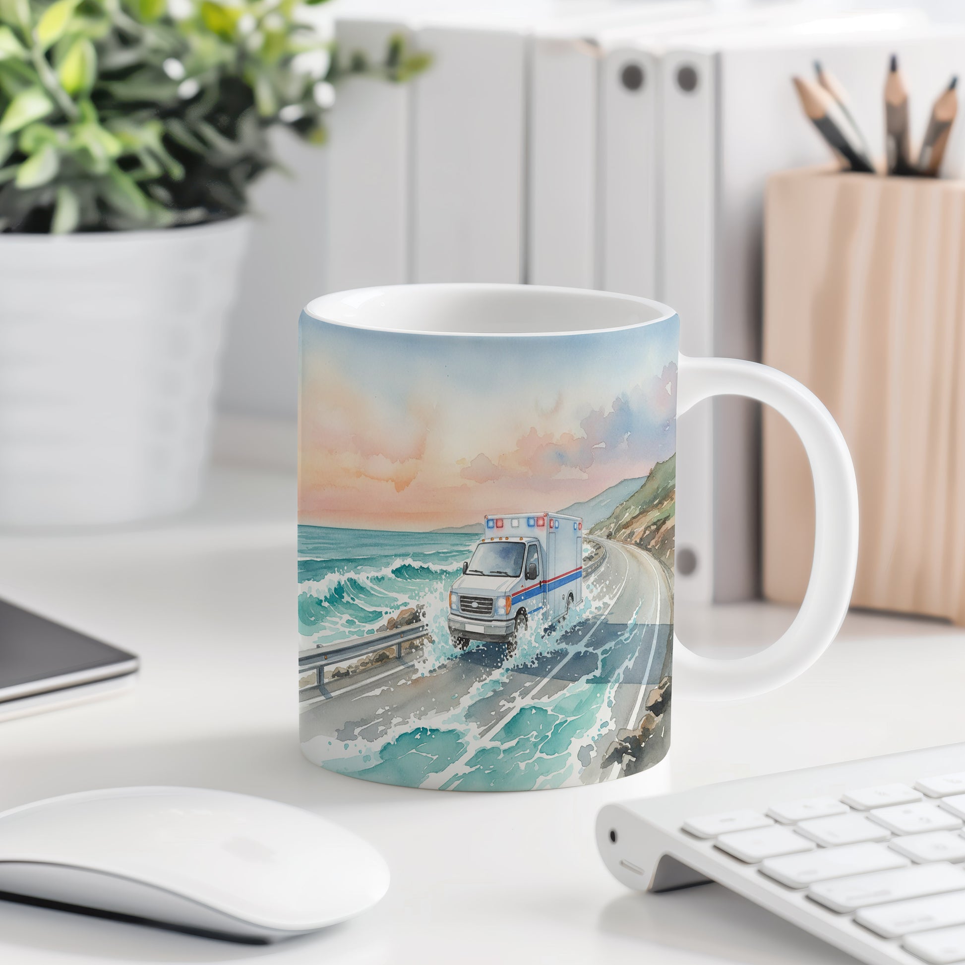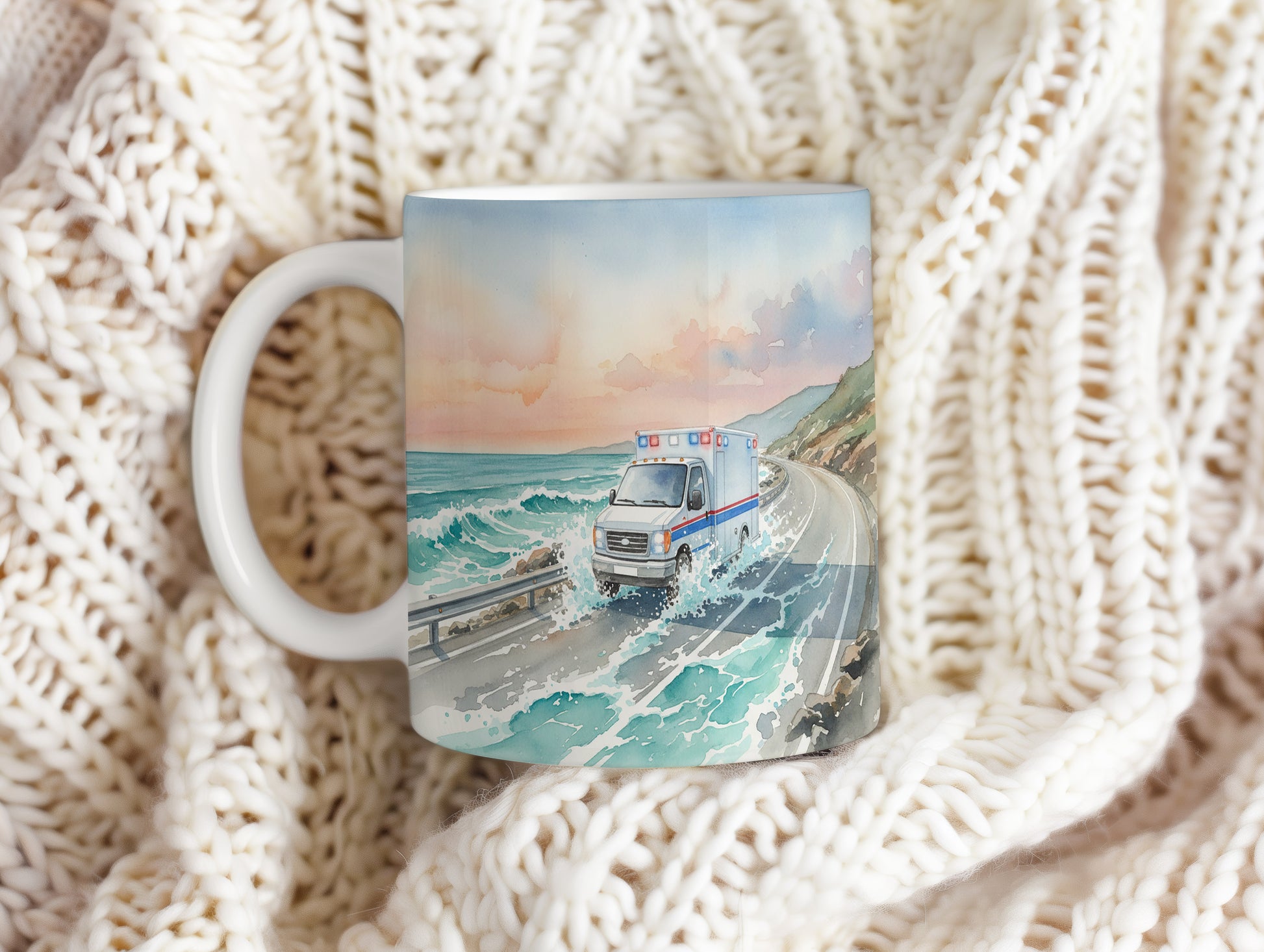 Prožijte vzrušující jízdu s naší sanitkou na pobřežní cestě při západu slunce. Akvarelový design zachycuje sílu vln a dynamiku pohybu. Hrnek 330 ml – vhodný do myčky i mikrovlnky.