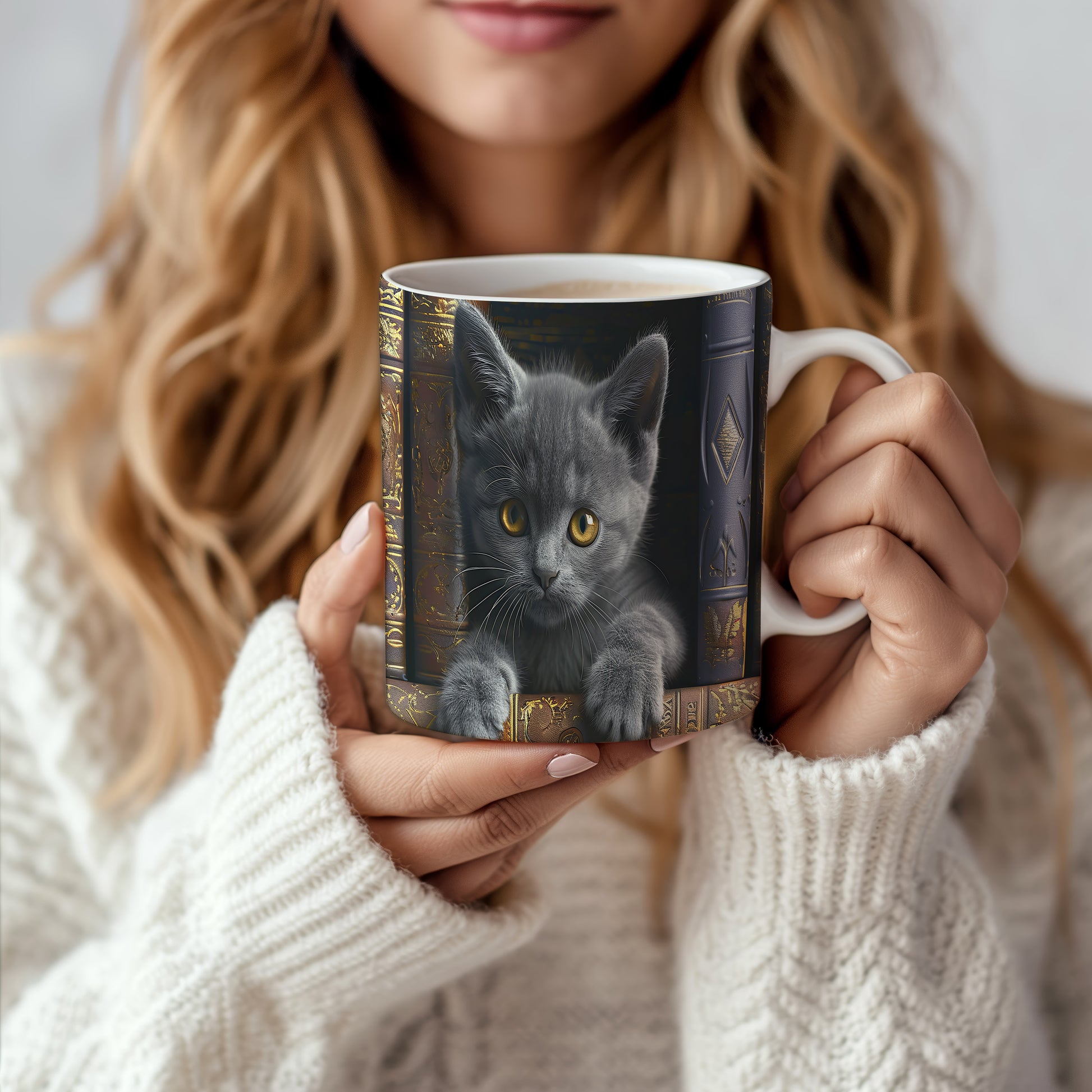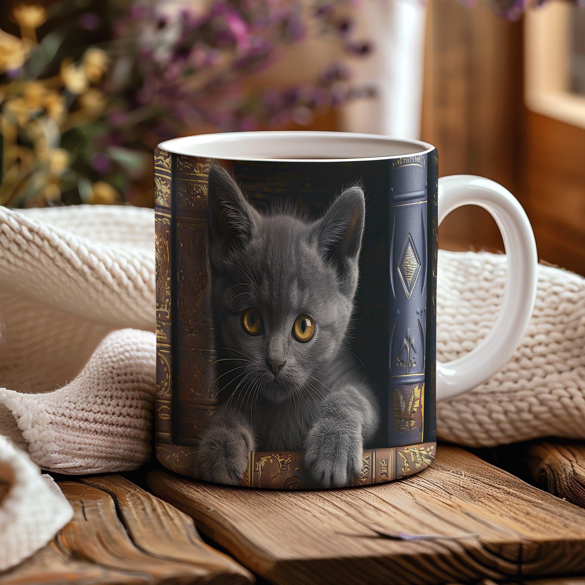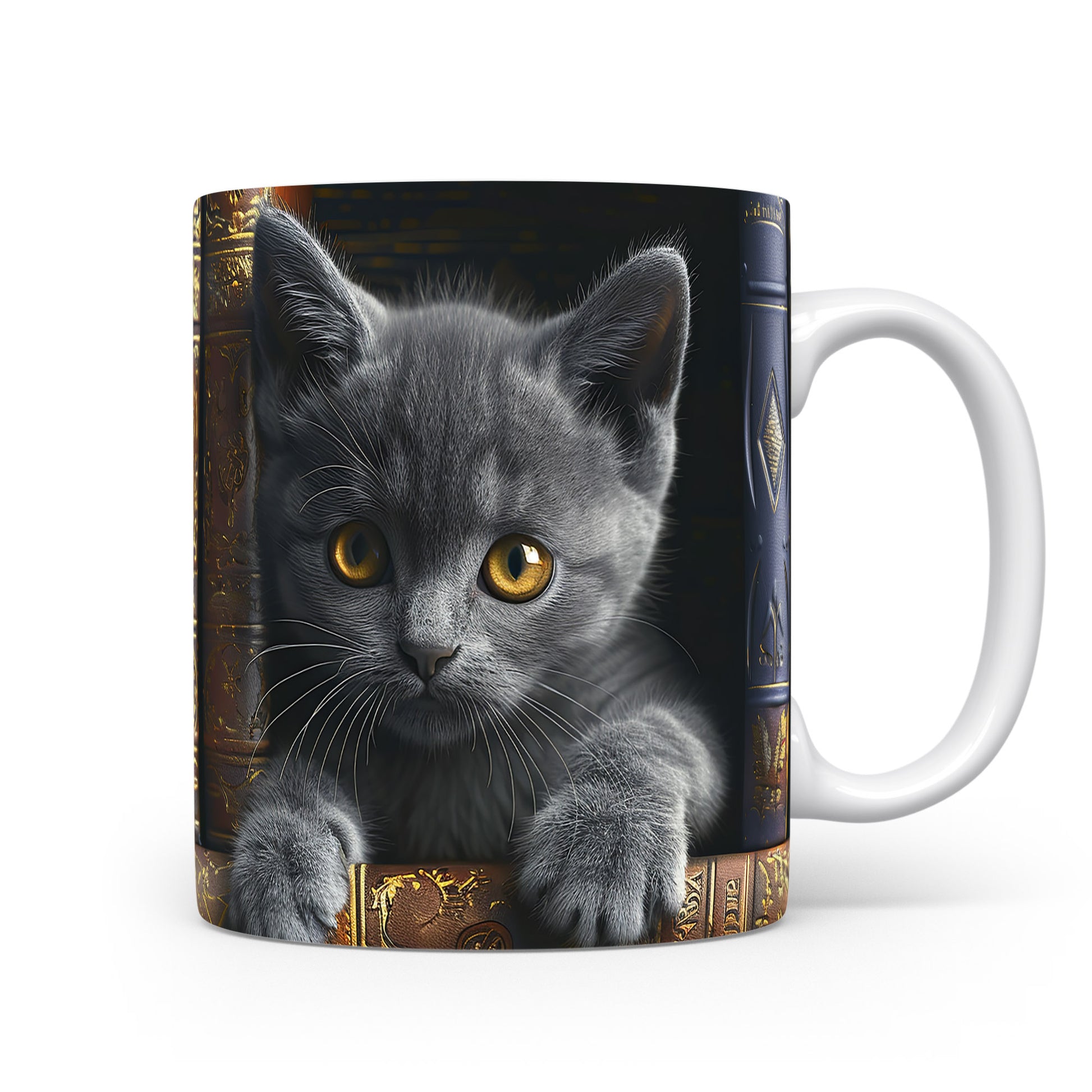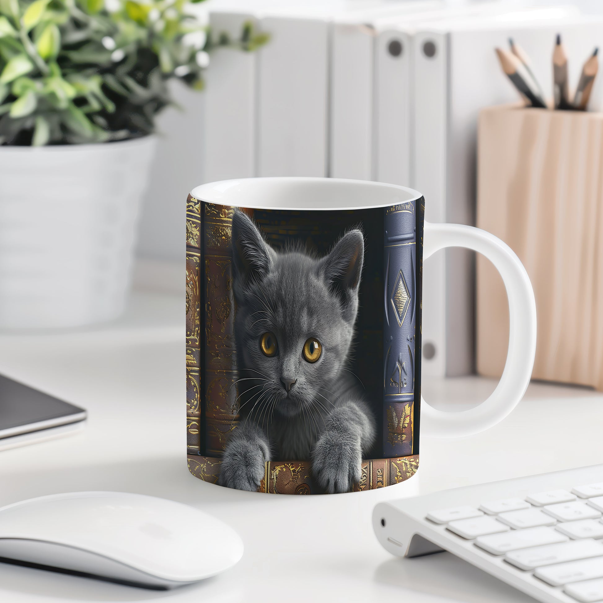 Tento hrnek zobrazuje šedou kočičku s velkýma očima, která se dívá zpoza knih. Je ideální pro milovníky koček a knih, skvěle poslouží jako dárek pro vaše blízké. Materiál: keramika. Objem: 330 ml. Vhodné do myčky i mikrovlnky. Užívejte si svůj oblíbený nápoj s tímto roztomilým motivem.