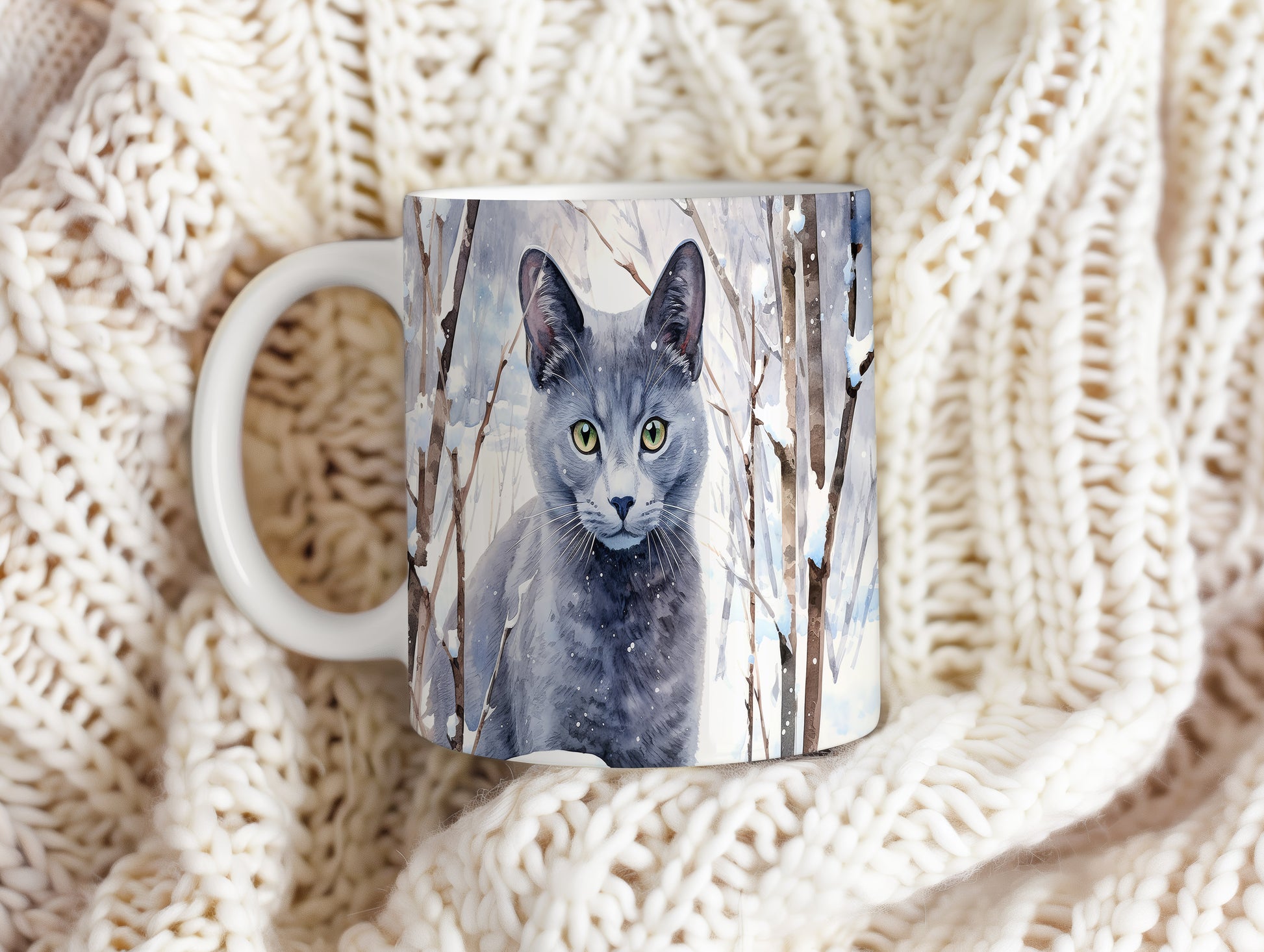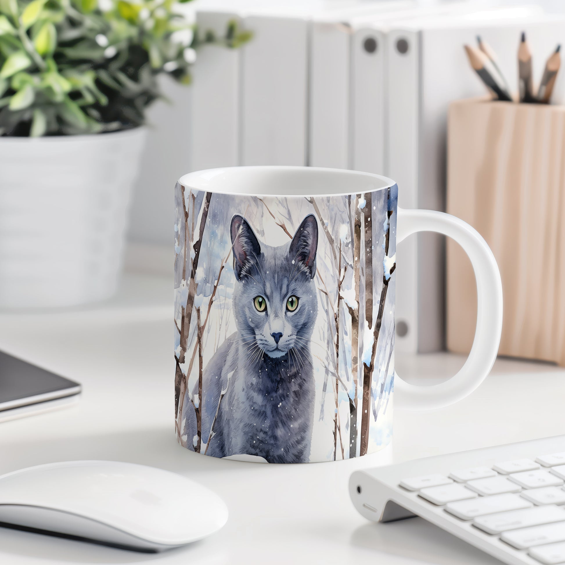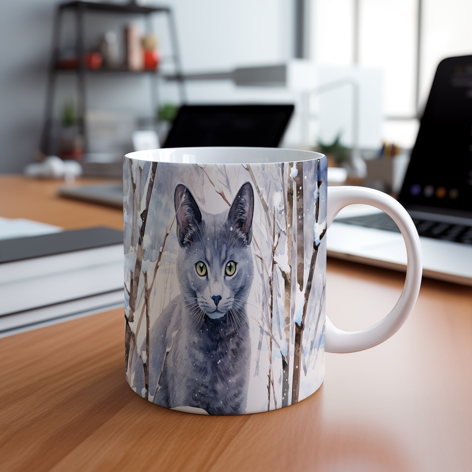 Elegantní hrnek s motivem šedé kočky na pozadí zasněženého lesa. Tento hrnek je ideální pro milovníky zvířat a skvělým dárkem pro každého, kdo ocení přírodu. Materiál: keramika. Objem: 330 ml. Vhodné do myčky i mikrovlnky. Používání tohoto hrnku přináší radost z každého doušku.