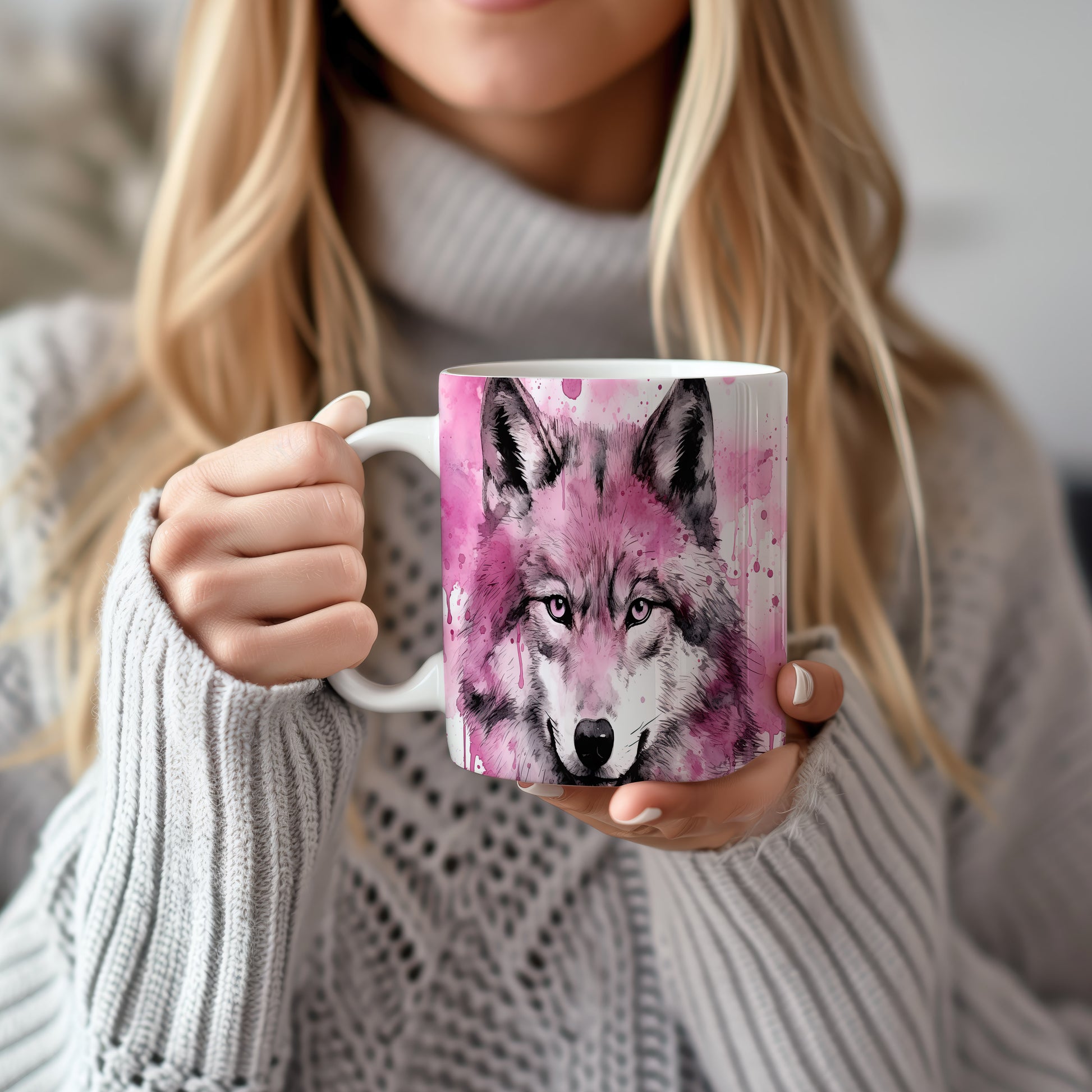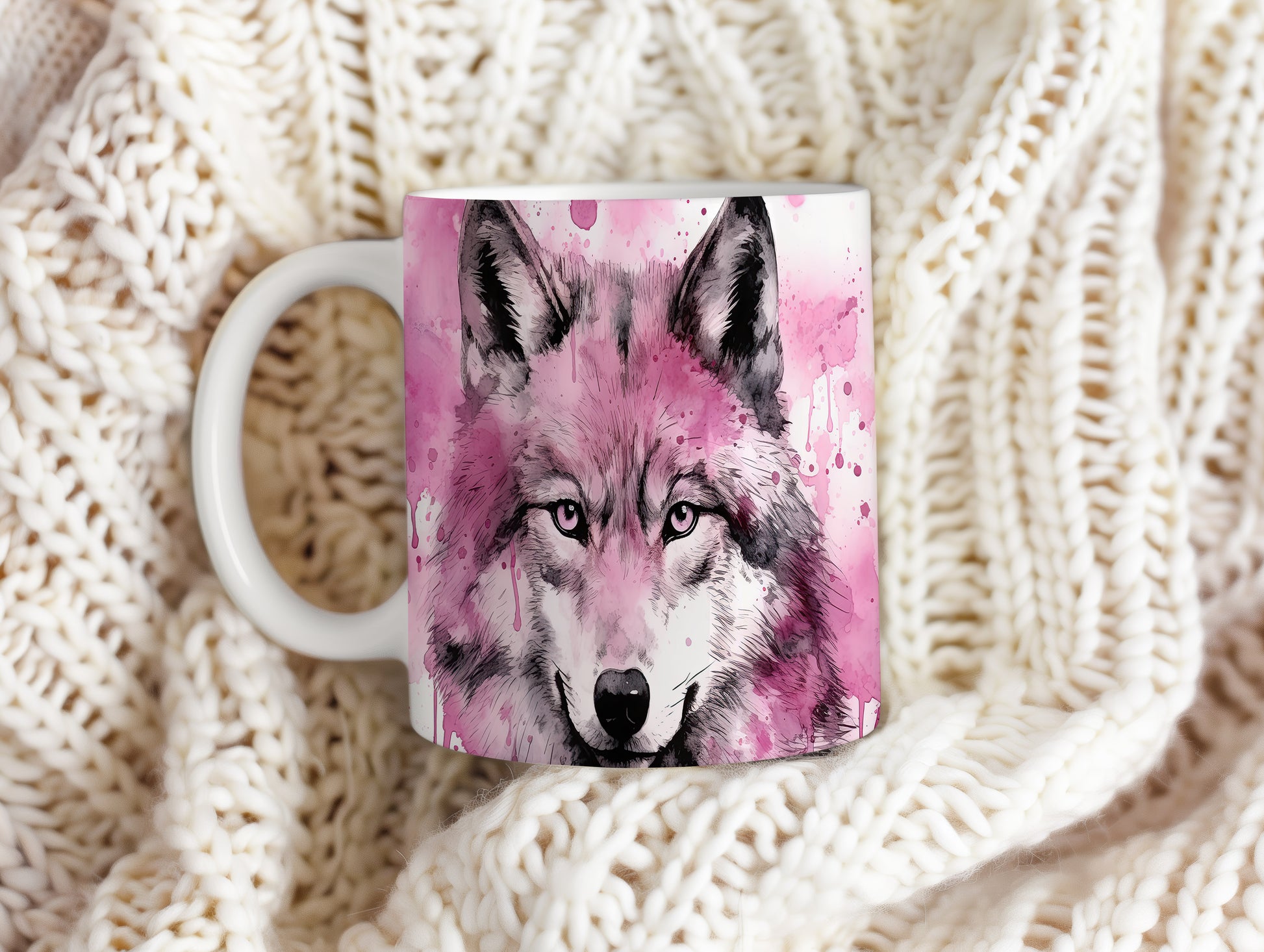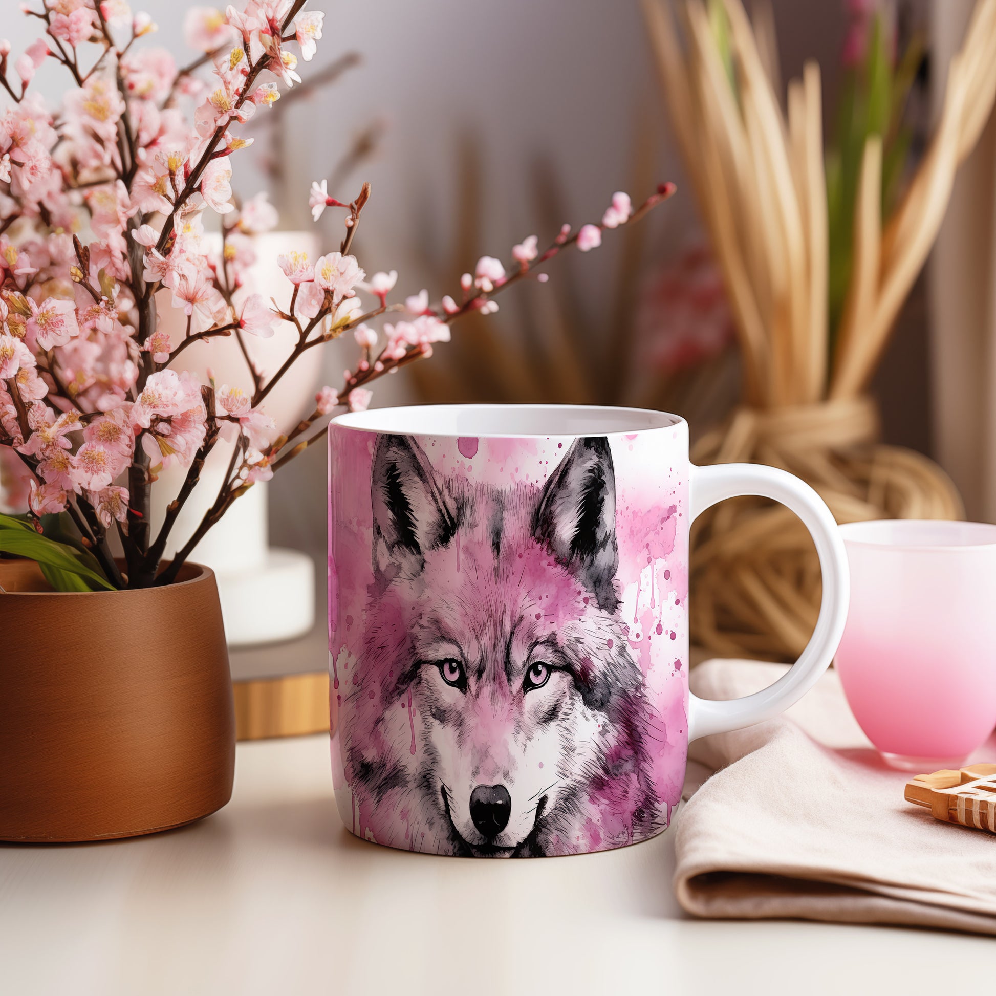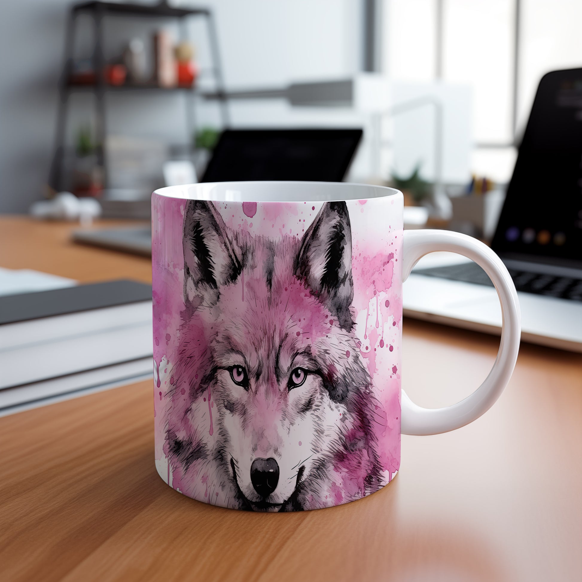 Hrnek se šedým vlkem na růžovém pozadí