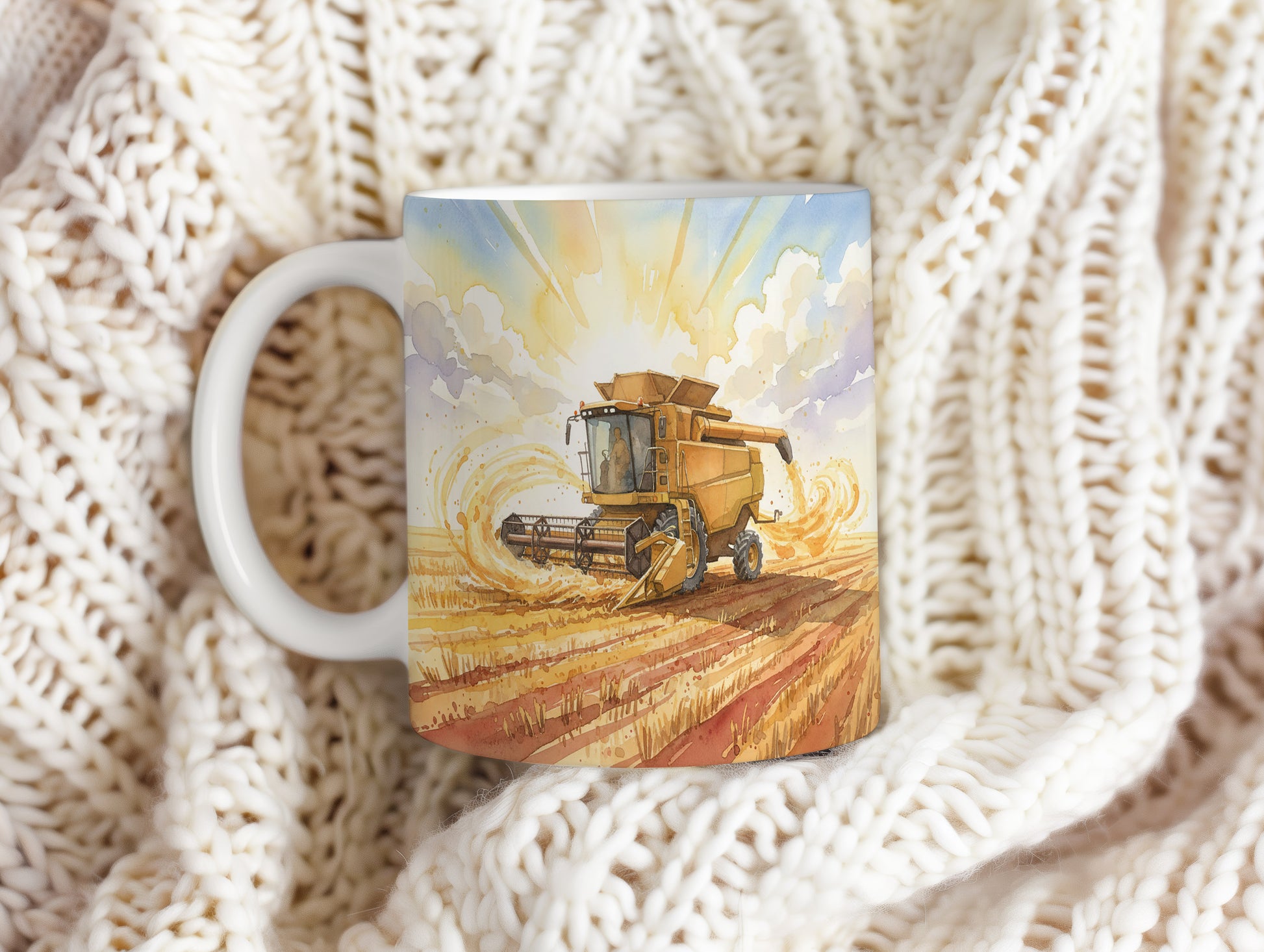 Objevte kouzlo sklízecí mlátičky v teplých barvách zapadajícího slunce. Ideální pro milovníky zemědělských strojů. Hrnek 330 ml – vhodný do myčky i mikrovlnky.