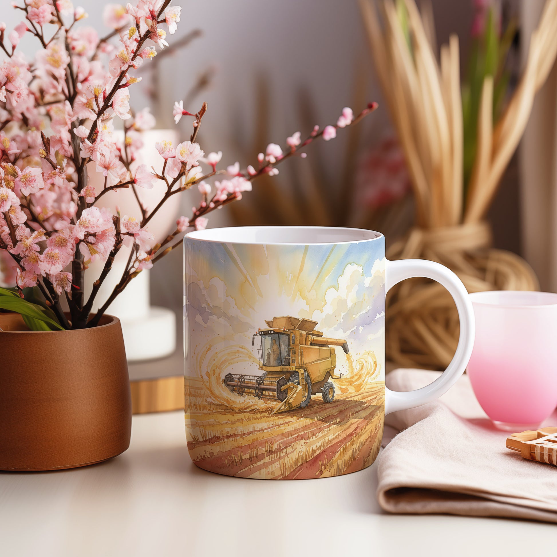 Hrnek se sklízecí mlátičkou v záři slunce