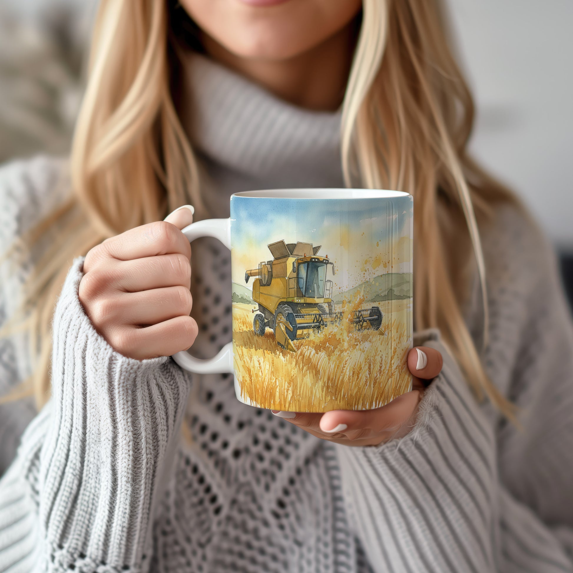 Objevte krásu venkova s akvarelovým motivem sklízecího kombajnu v obilném poli. Hrnek 330 ml – vhodný do myčky i mikrovlnky.