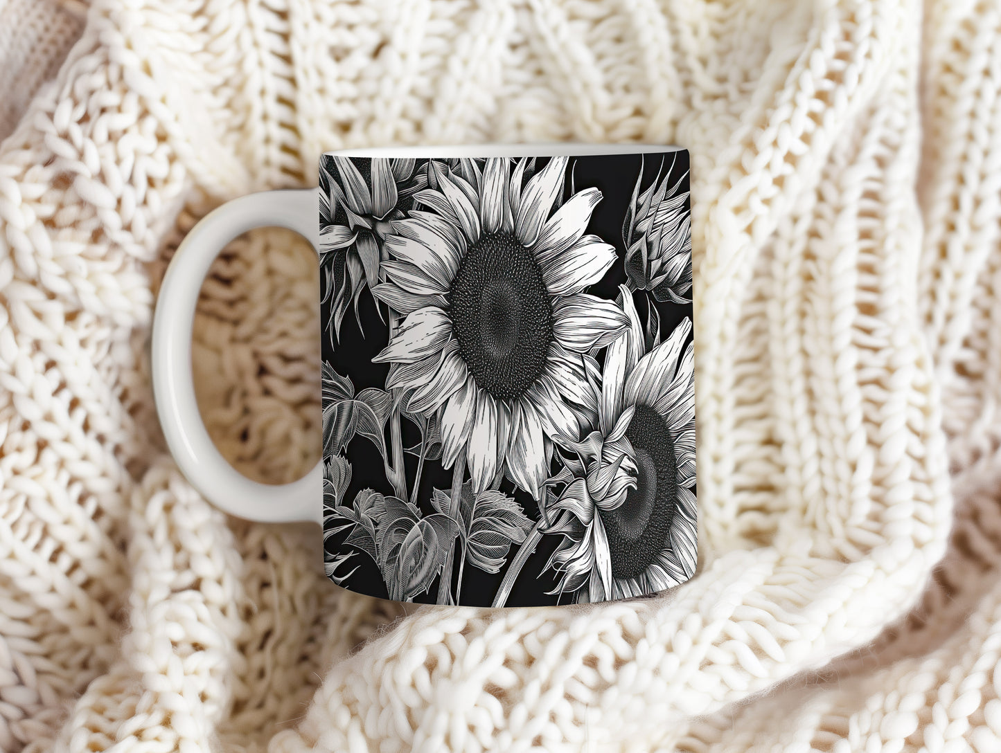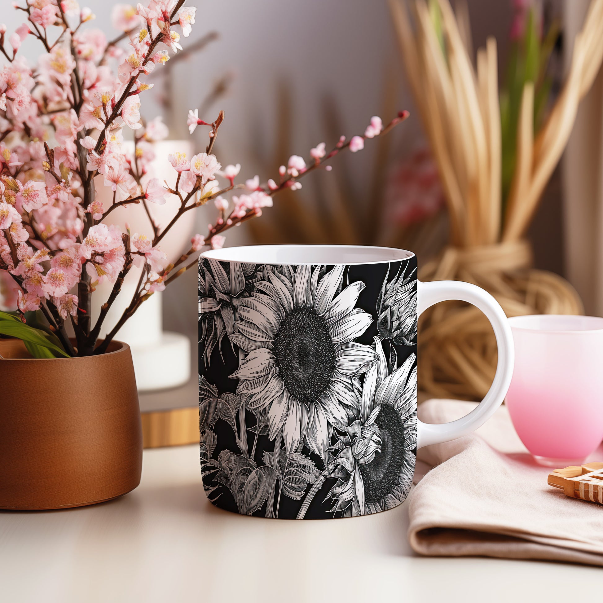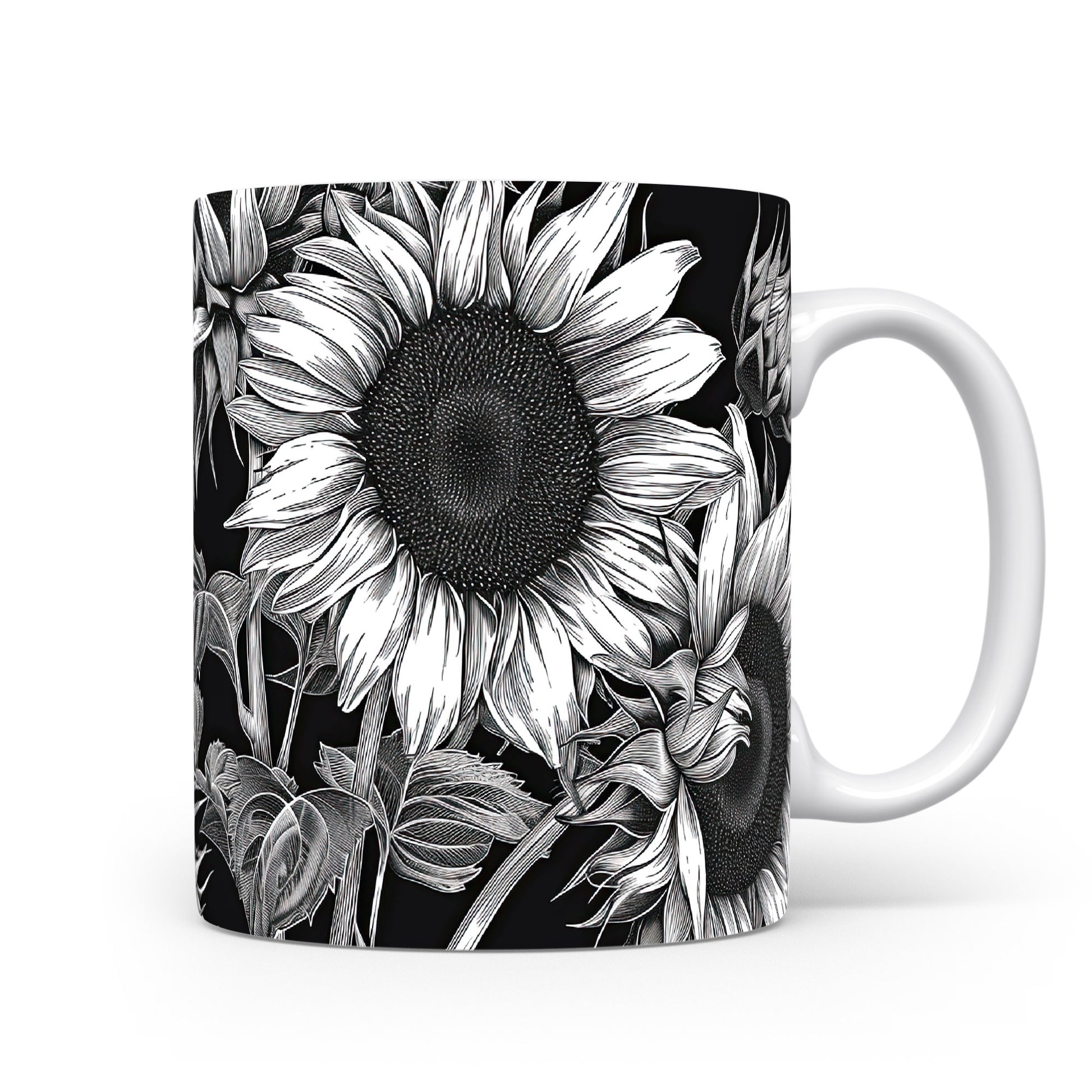 Hrnek se slunečnicemi na černém pozadí