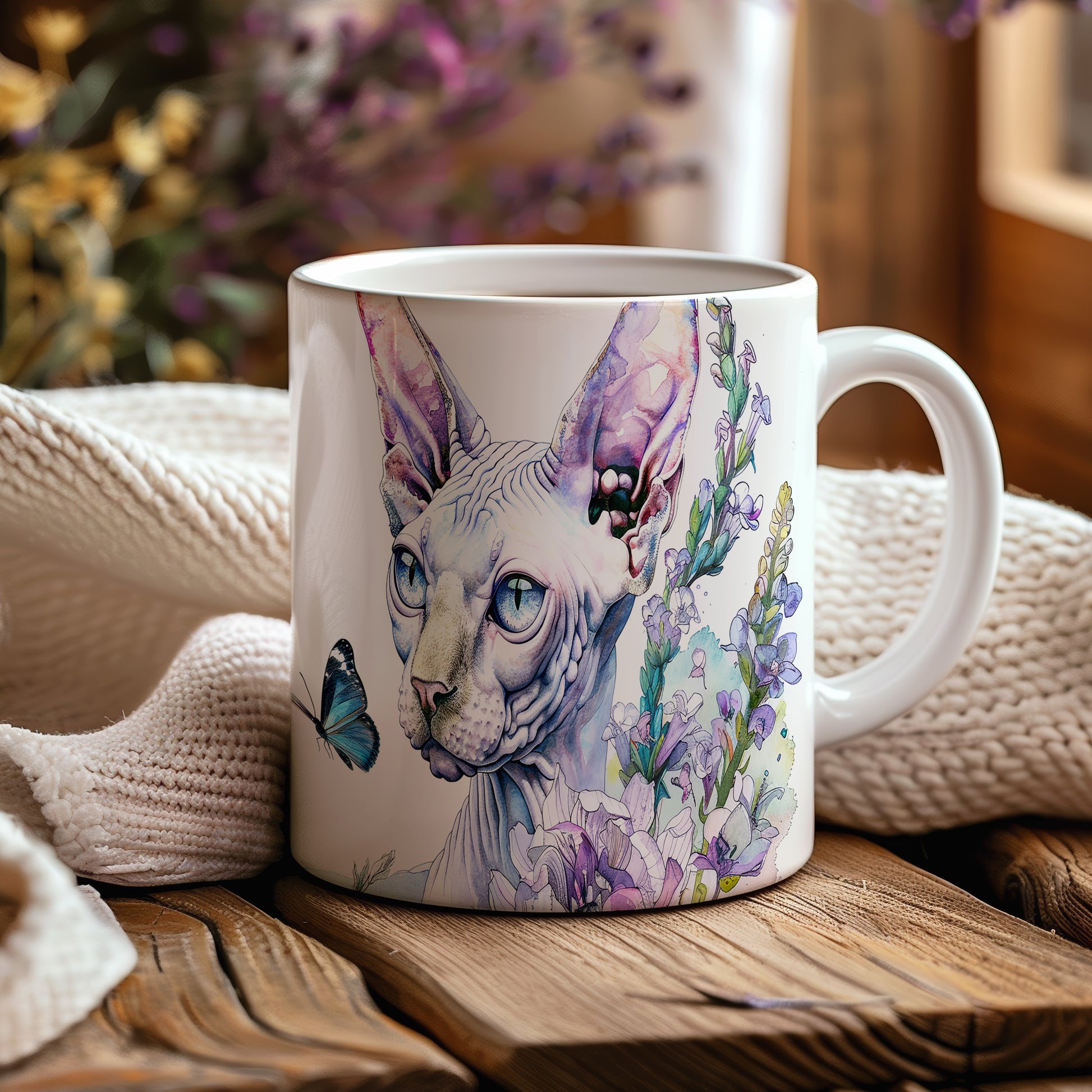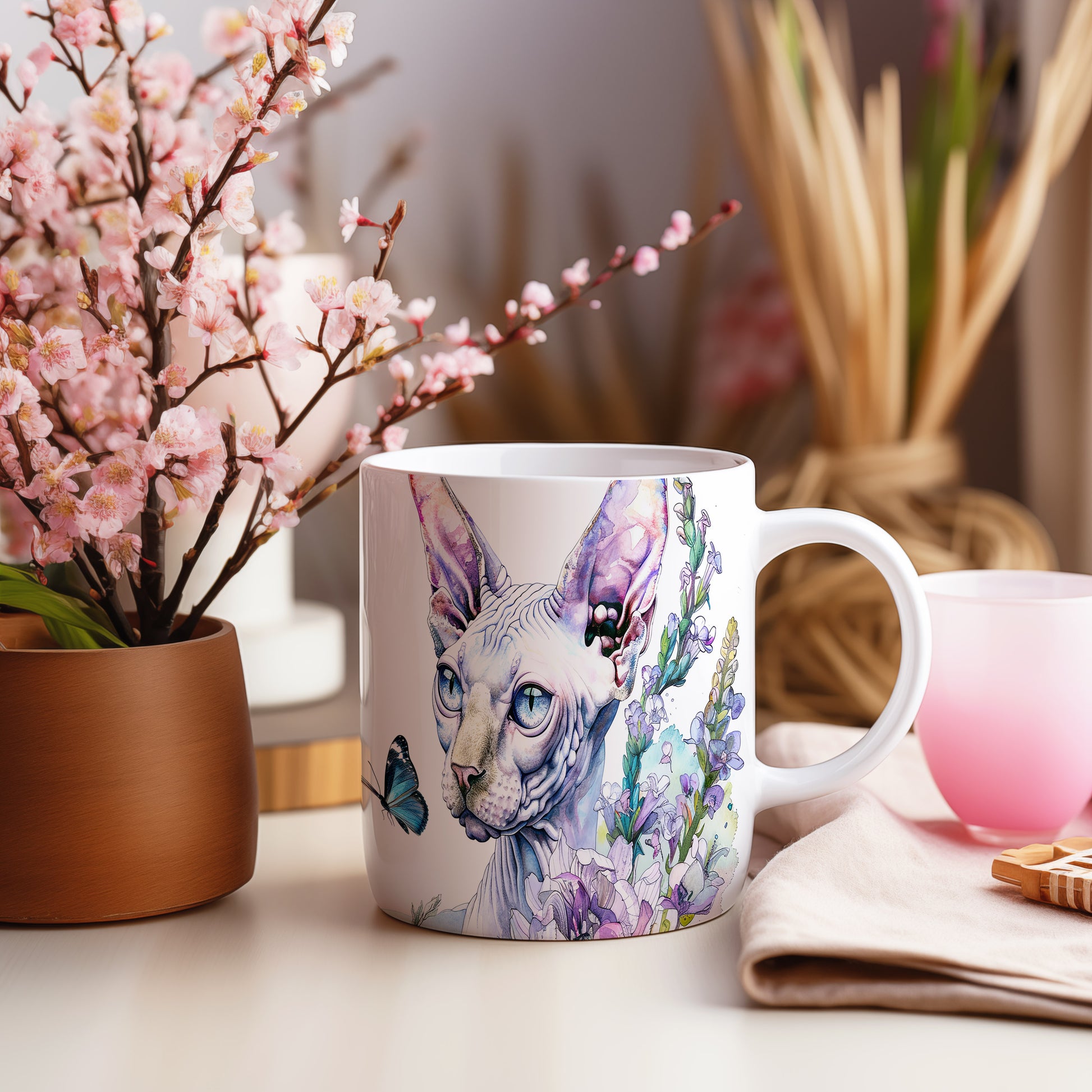 Keramický hrnek s motivem sphynx kočky obklopené květinami. Tento hrnek je ideální pro milovníky koček a skvělým dárkem pro každého, kdo má rád originální design. Materiál: keramika. Objem: 330 ml. Vhodné do myčky i mikrovlnky. Používání tohoto hrnku přináší radost z každého doušku.