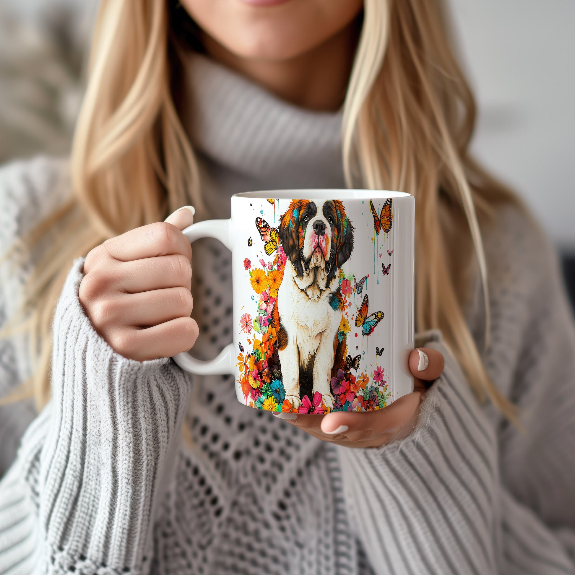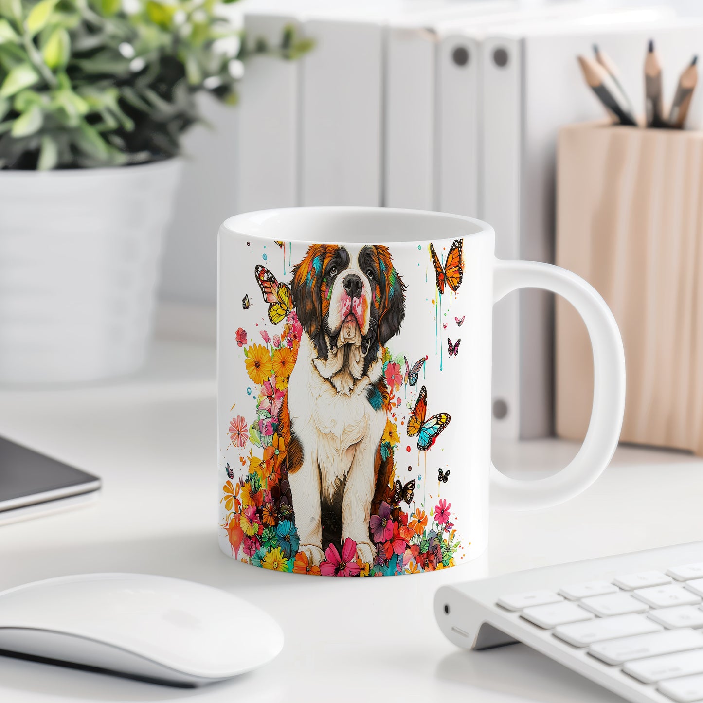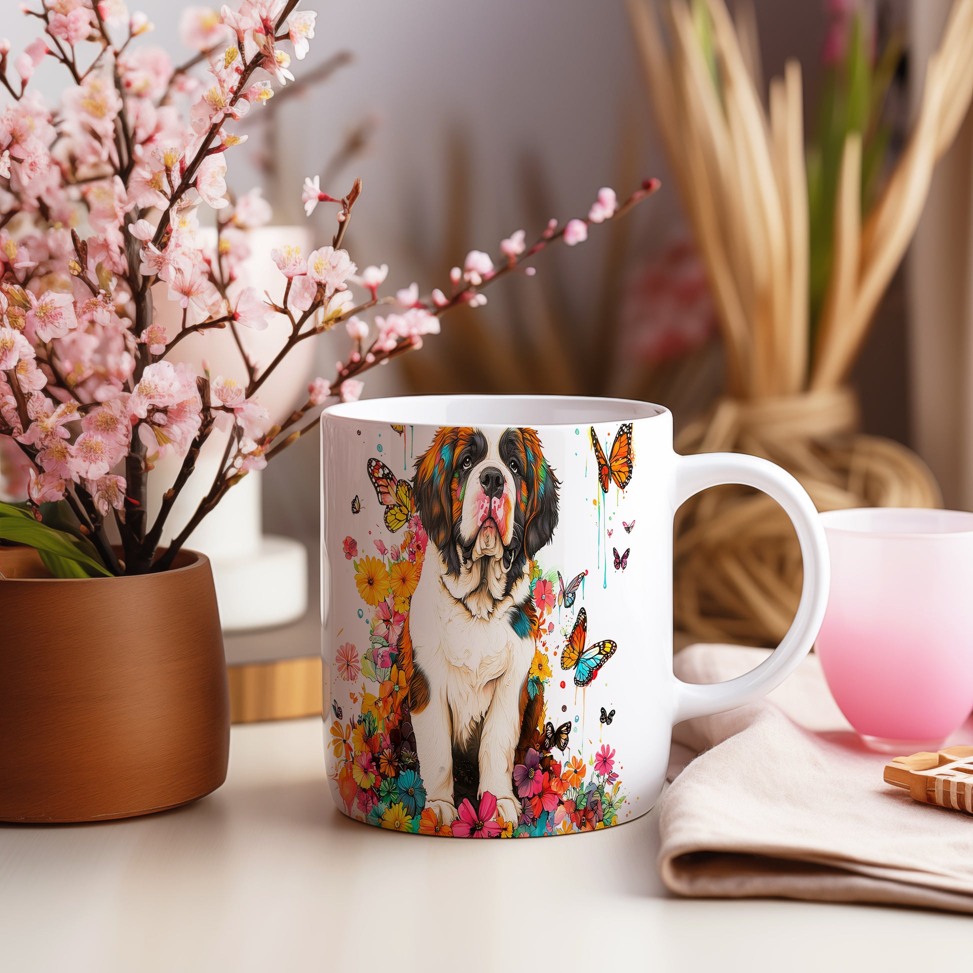 Tento keramický hrnek s motivem psa plemene St. Bernard a barevnými květinami přináší do každého dne radost a pohodu. Je ideální pro milovníky psů a přírody, skvělý tip na dárek pro přátele nebo rodinu. Materiál: keramika. Objem: 330 ml. Vhodné do myčky i mikrovlnky. Užívejte si svůj oblíbený nápoj s tímto stylovým hrnkem, který vám zpříjemní každou chvíli.