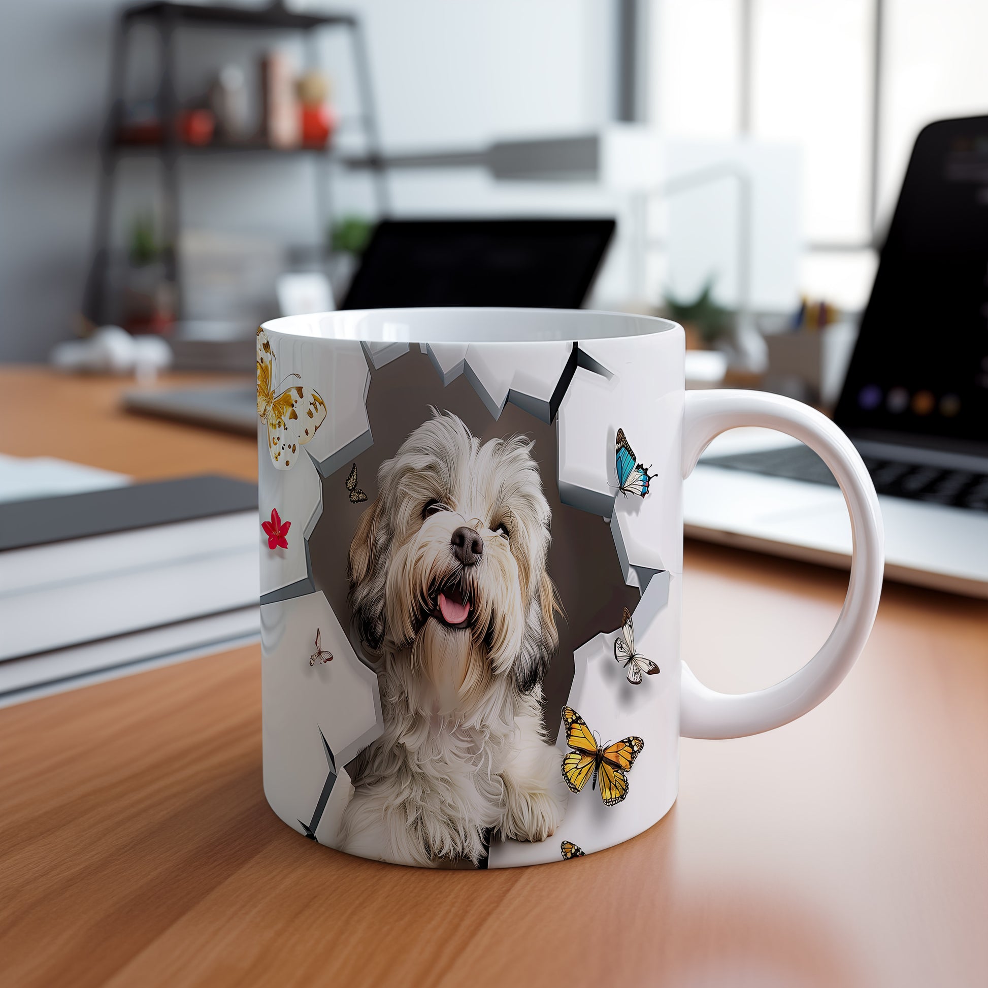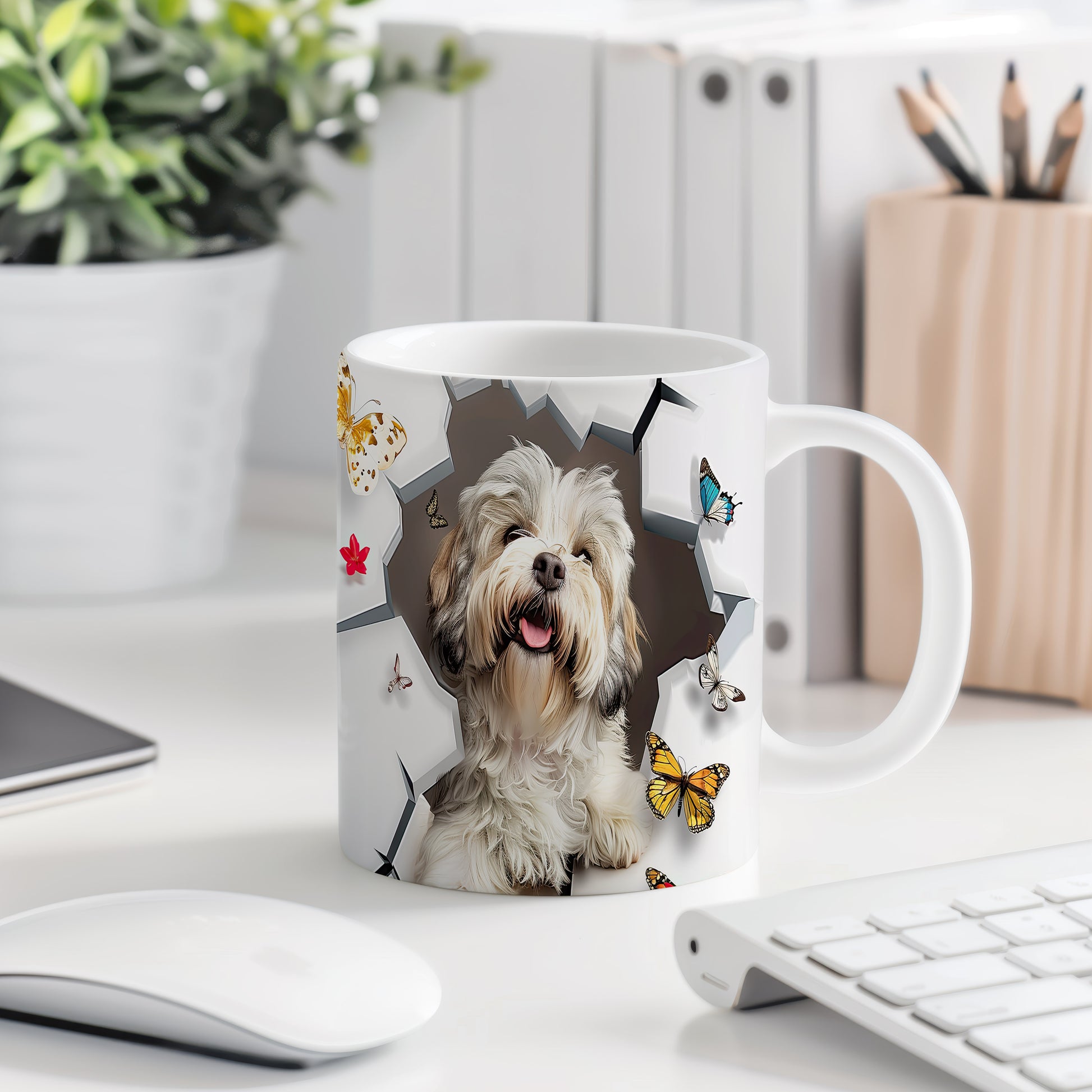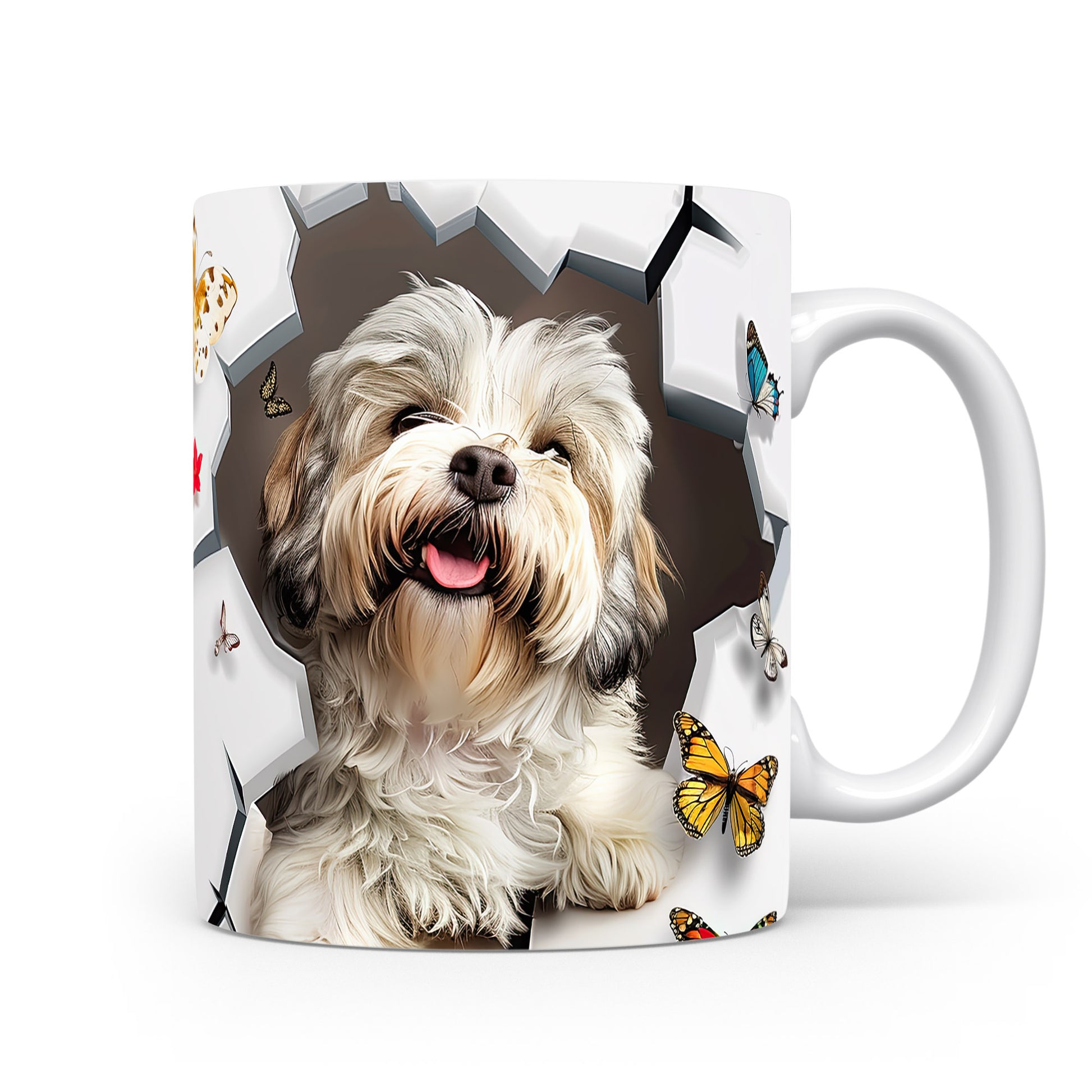 Tento keramický hrnek zobrazuje roztomilého pejska s veselým úsměvem a barevnými motýly. Je ideální pro milovníky zvířat a skvělým dárkem pro přátele či rodinu. Materiál: keramika. Objem: 330 ml. Vhodné do myčky i mikrovlnky. Používání tohoto hrnku přináší radost do každodenního pití.