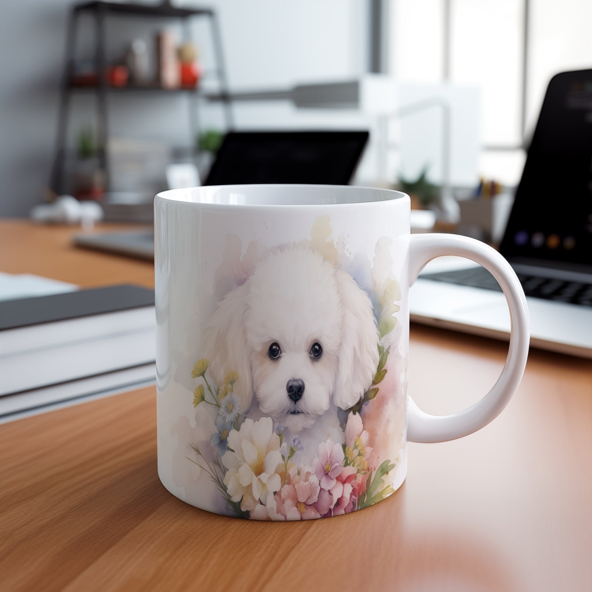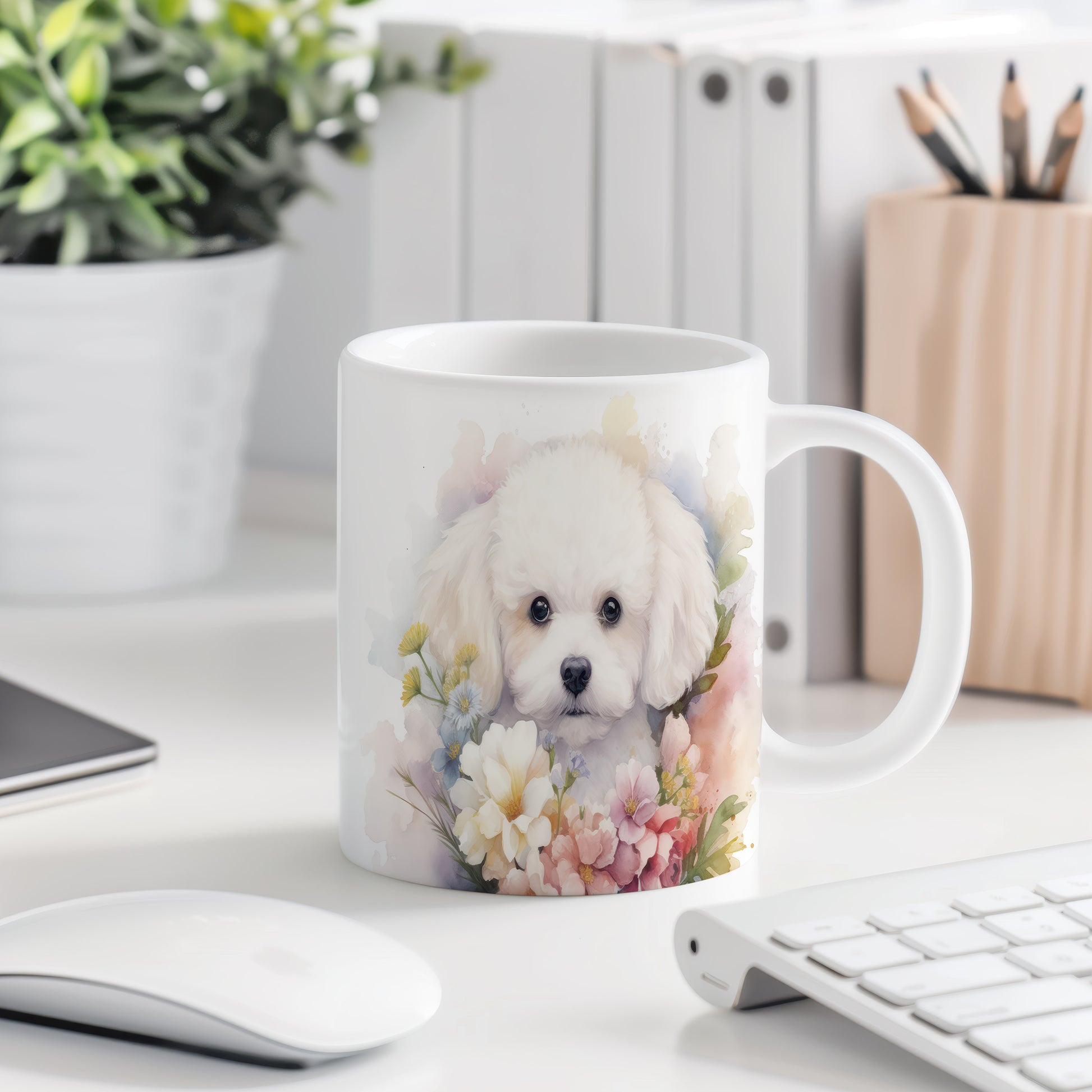 Hrnek se štěňátkem obklopeným květinami je roztomilý a veselý kousek, který potěší každého milovníka psů. Skvělý tip na dárek pro přátele nebo rodinu, kteří mají rádi zvířata. Materiál: keramika. Objem: 330 ml. Vhodné do myčky i mikrovlnky. Tento hrnek přináší radost při každém doušku vašeho oblíbeného nápoje.