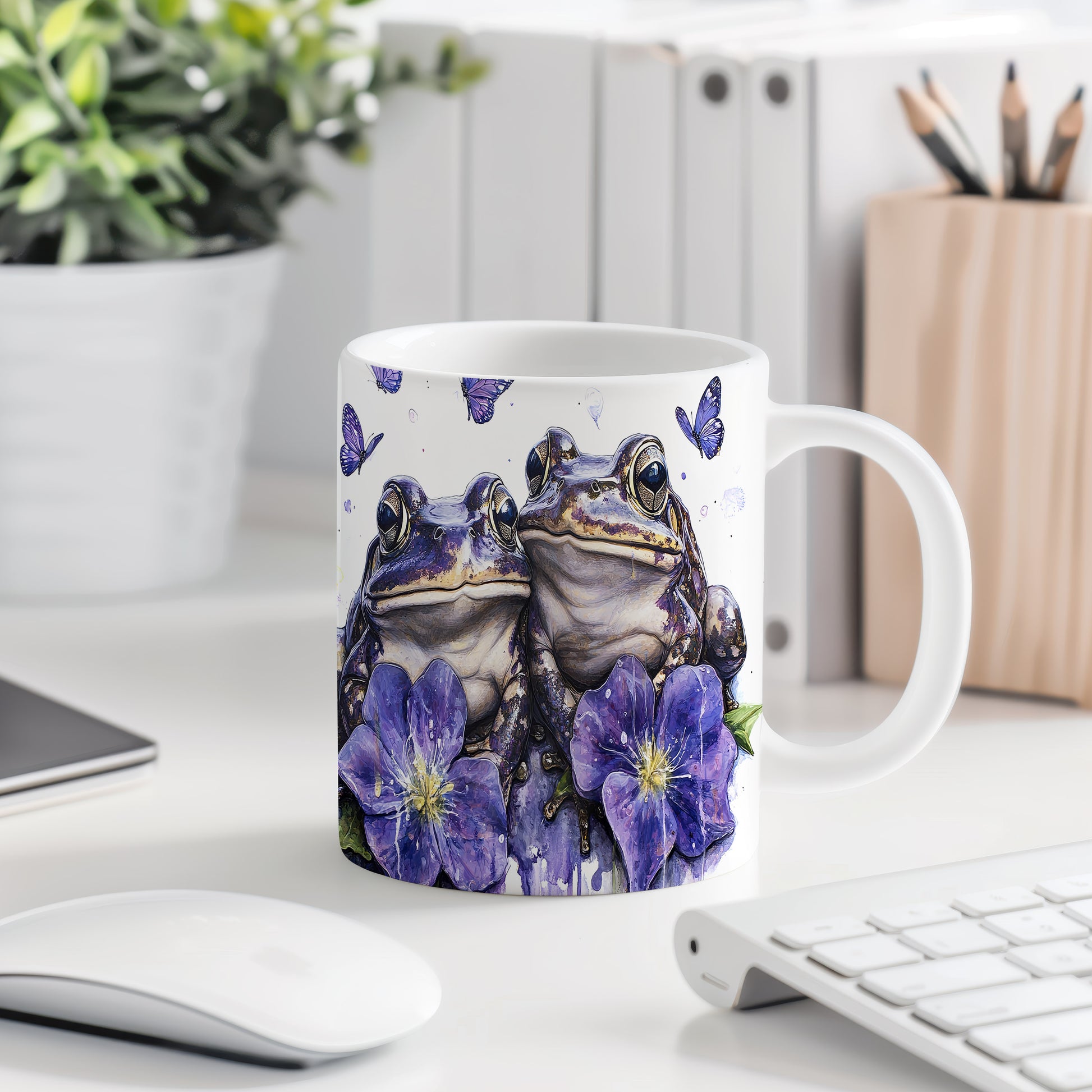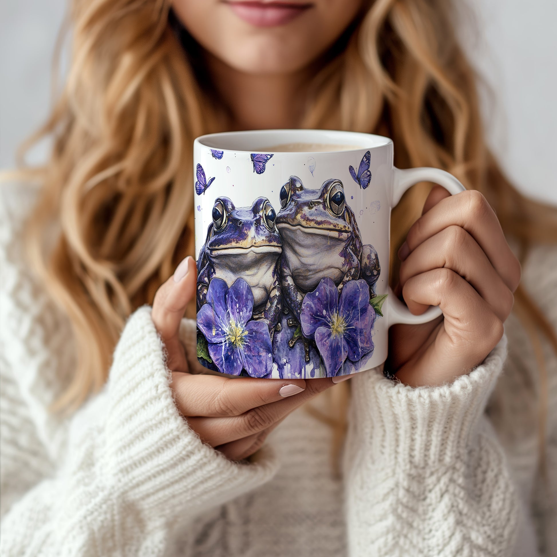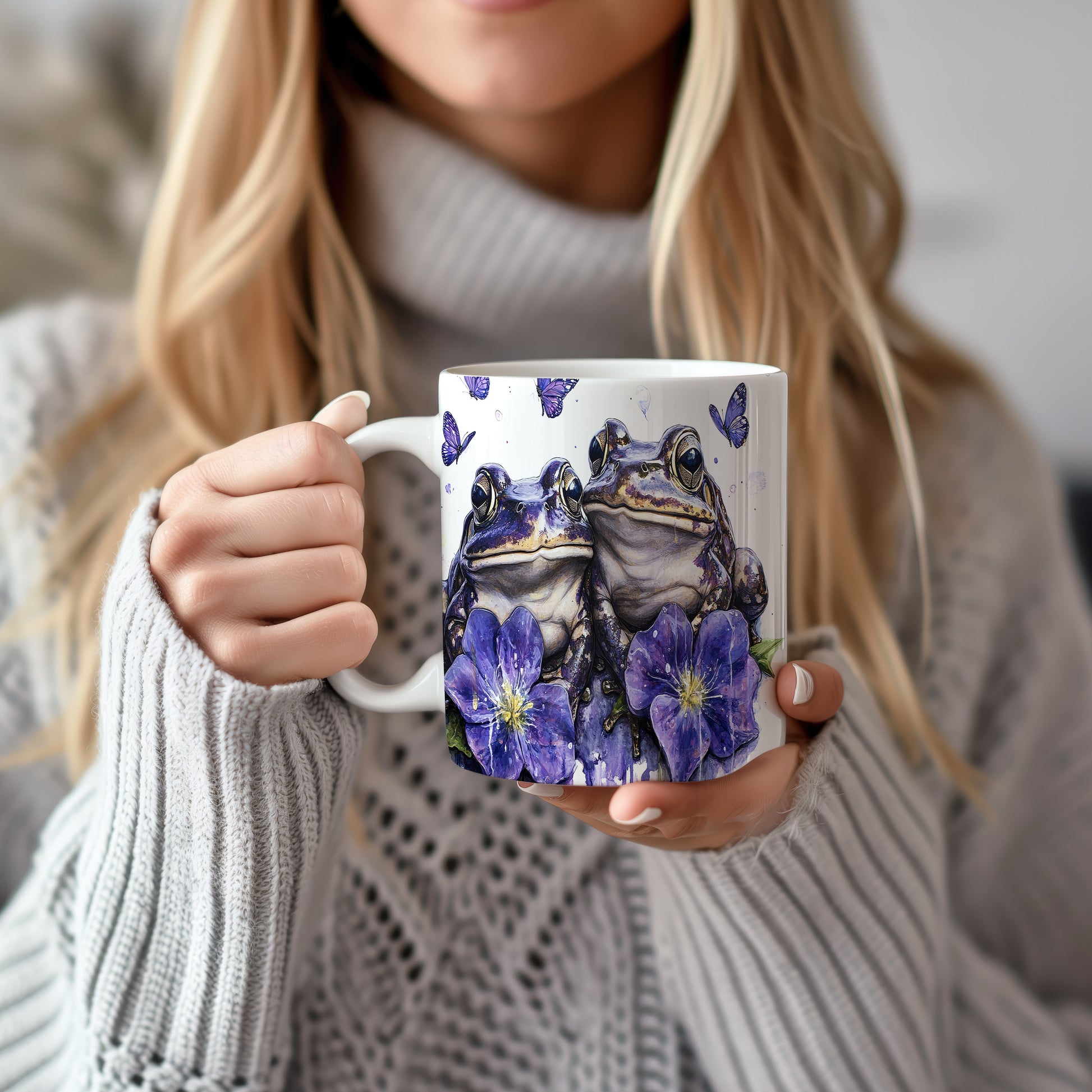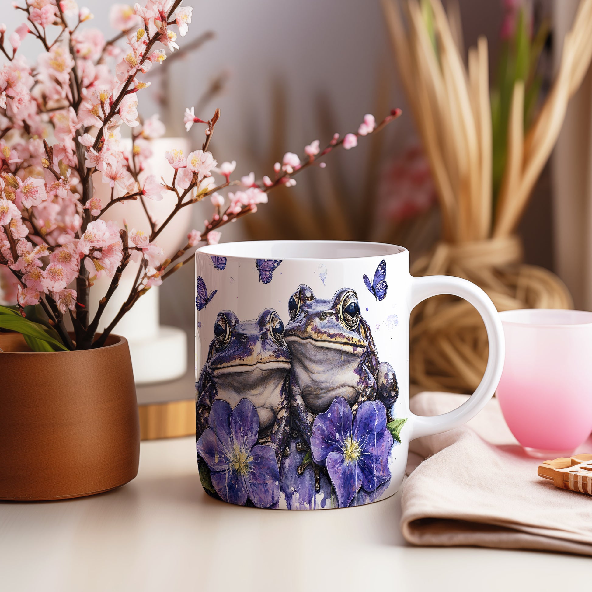 Tento hrnek s motivem žab a fialových květin přináší jedinečný design, který potěší každého milovníka přírody. Je ideálním dárkem pro přátele nebo rodinu, kteří ocení krásu přírody. Materiál: keramika. Objem: 330 ml. Vhodné do myčky i mikrovlnky. Používání tohoto hrnku přidá vašemu stolování osobitý nádech.