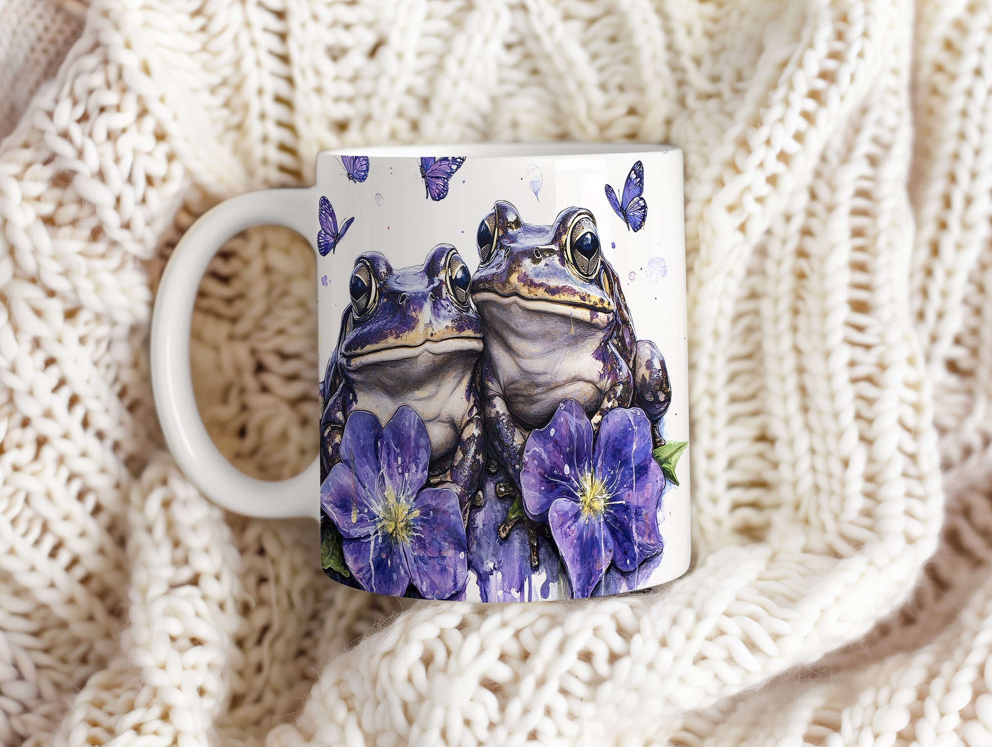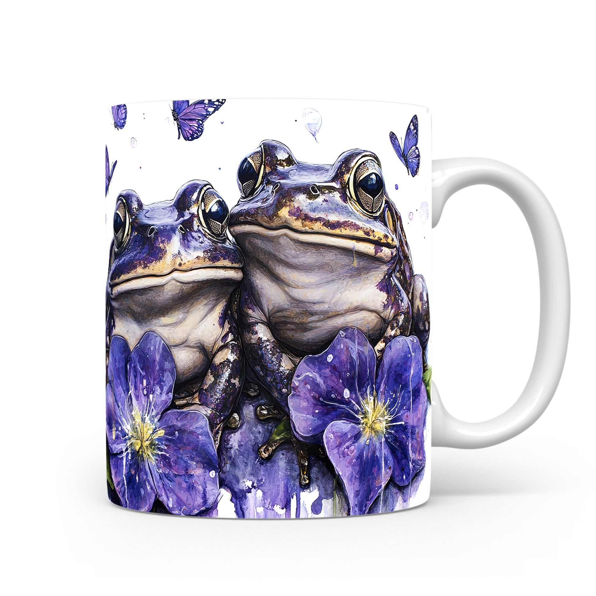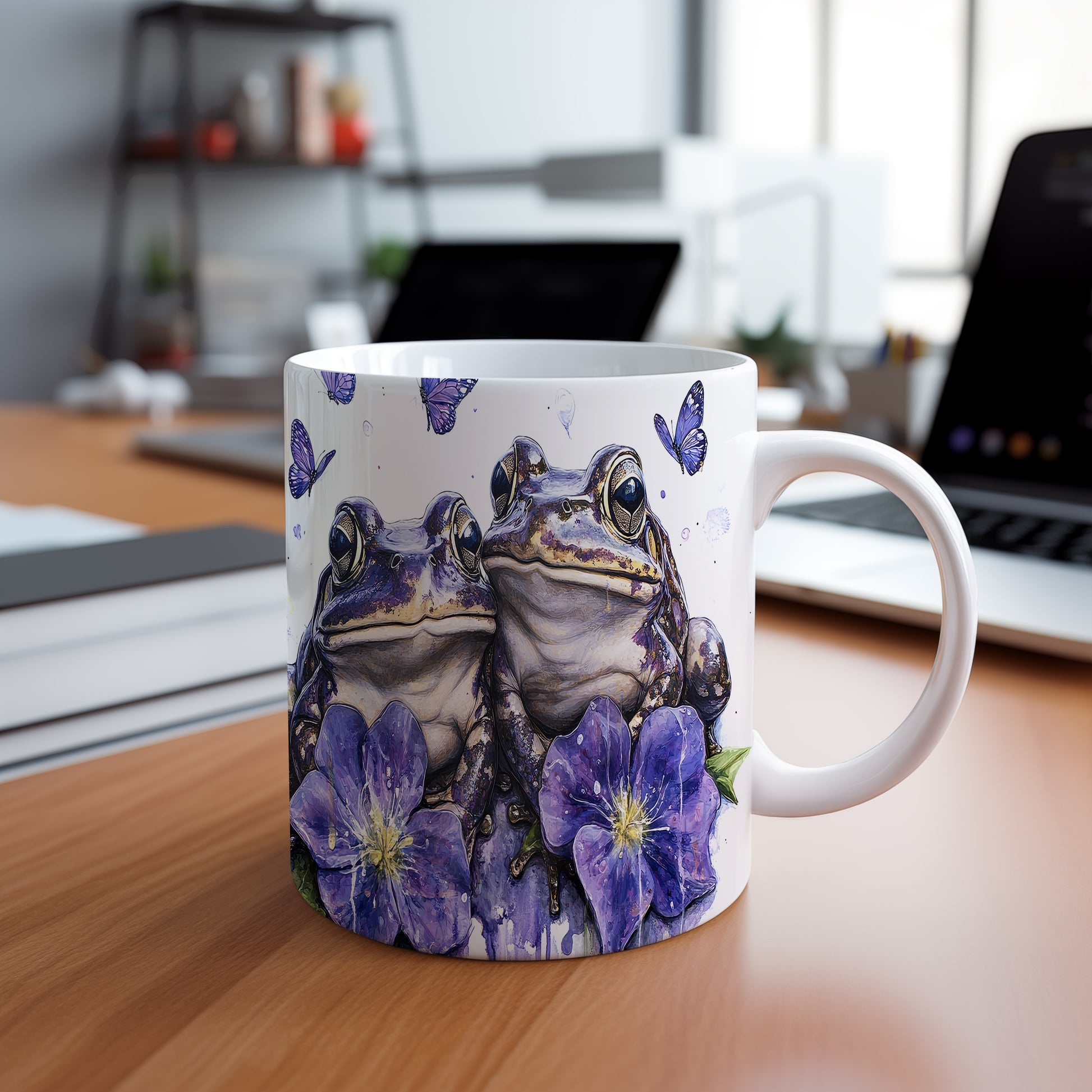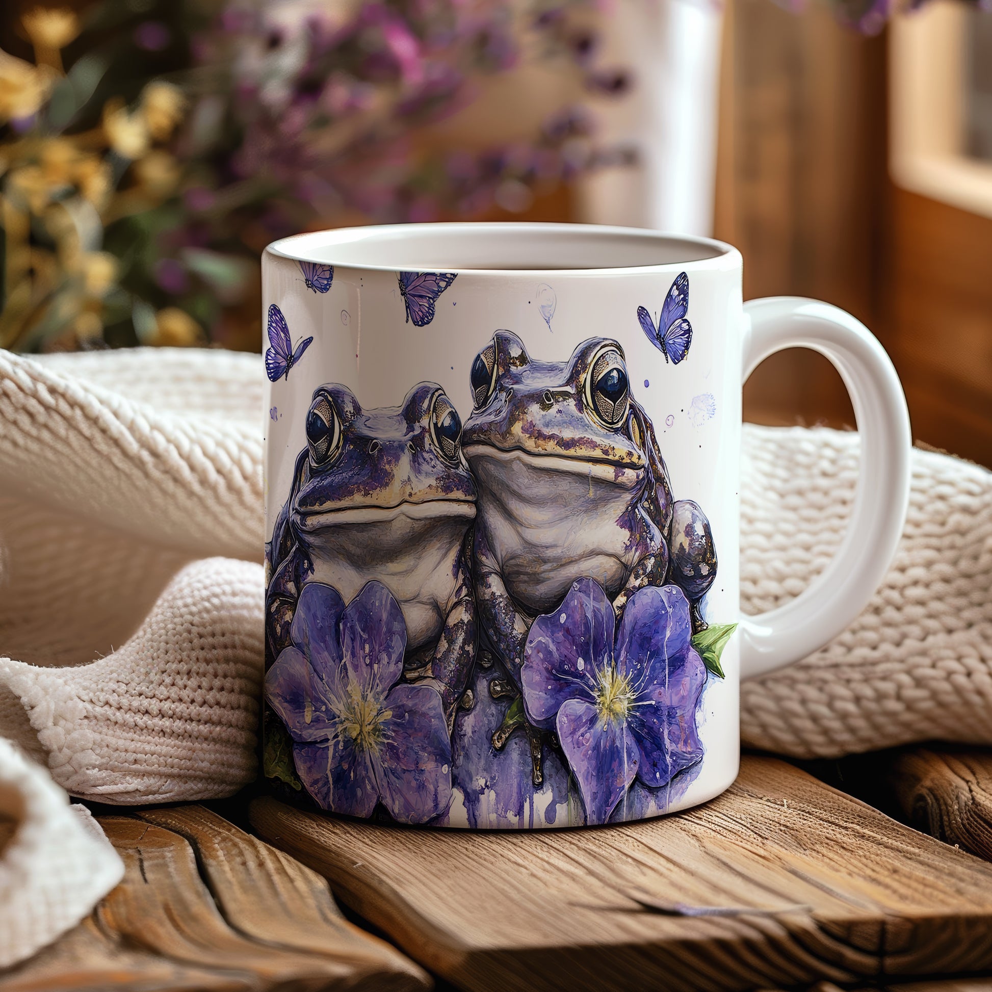 Tento hrnek s motivem žab a fialových květin přináší jedinečný design, který potěší každého milovníka přírody. Je ideálním dárkem pro přátele nebo rodinu, kteří ocení krásu přírody. Materiál: keramika. Objem: 330 ml. Vhodné do myčky i mikrovlnky. Používání tohoto hrnku přidá vašemu stolování osobitý nádech.