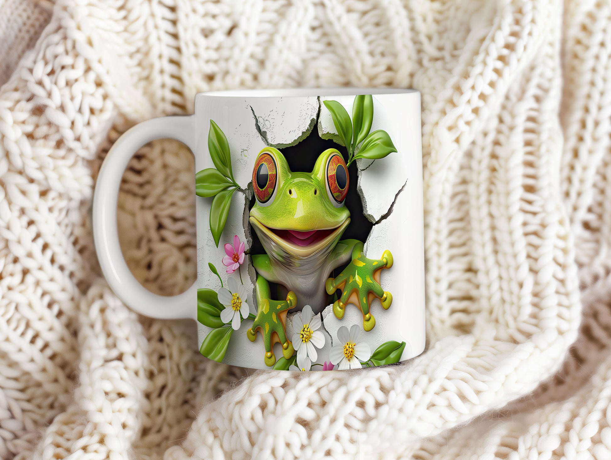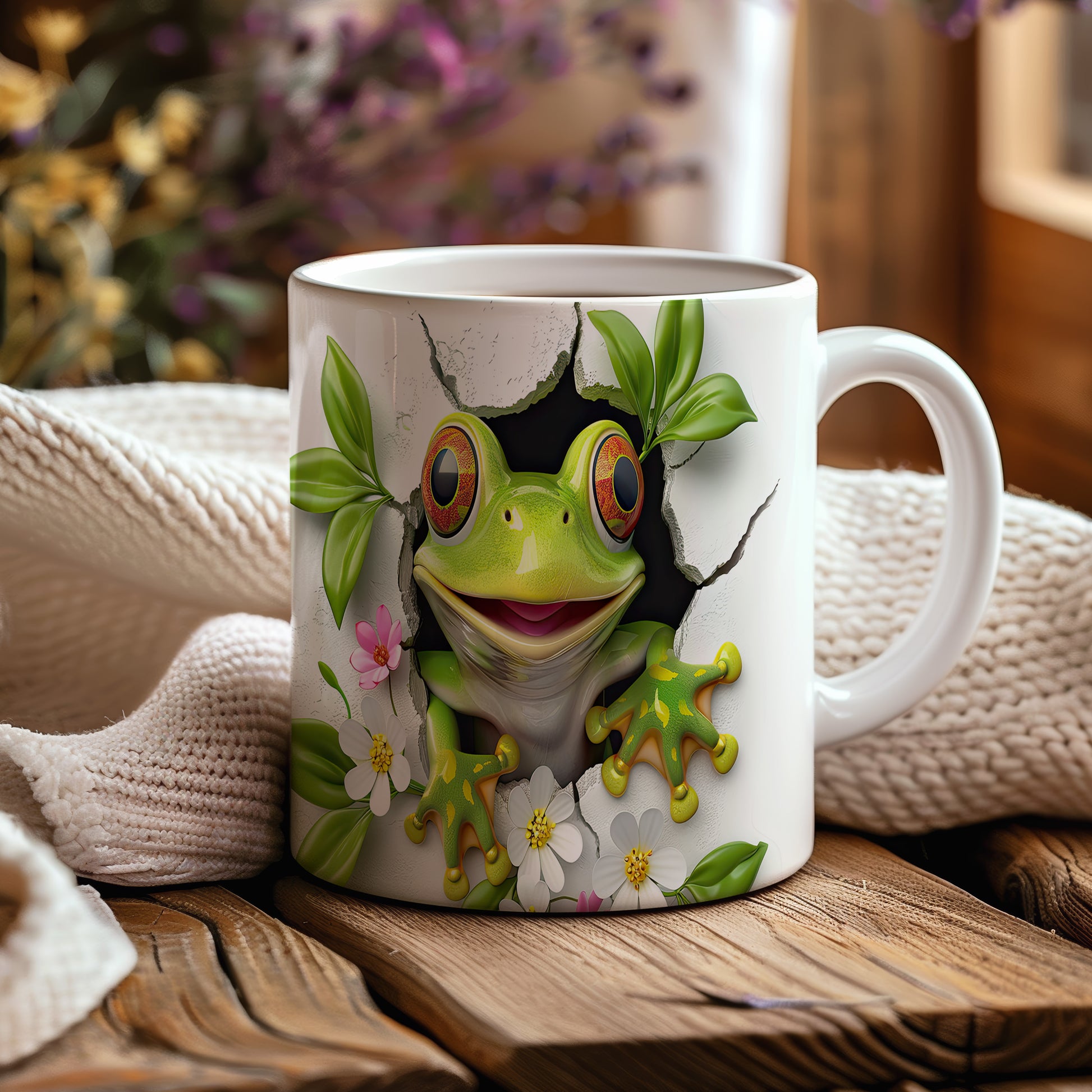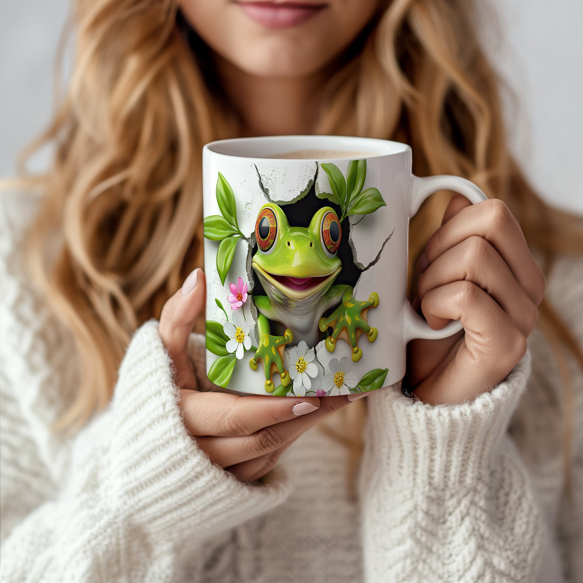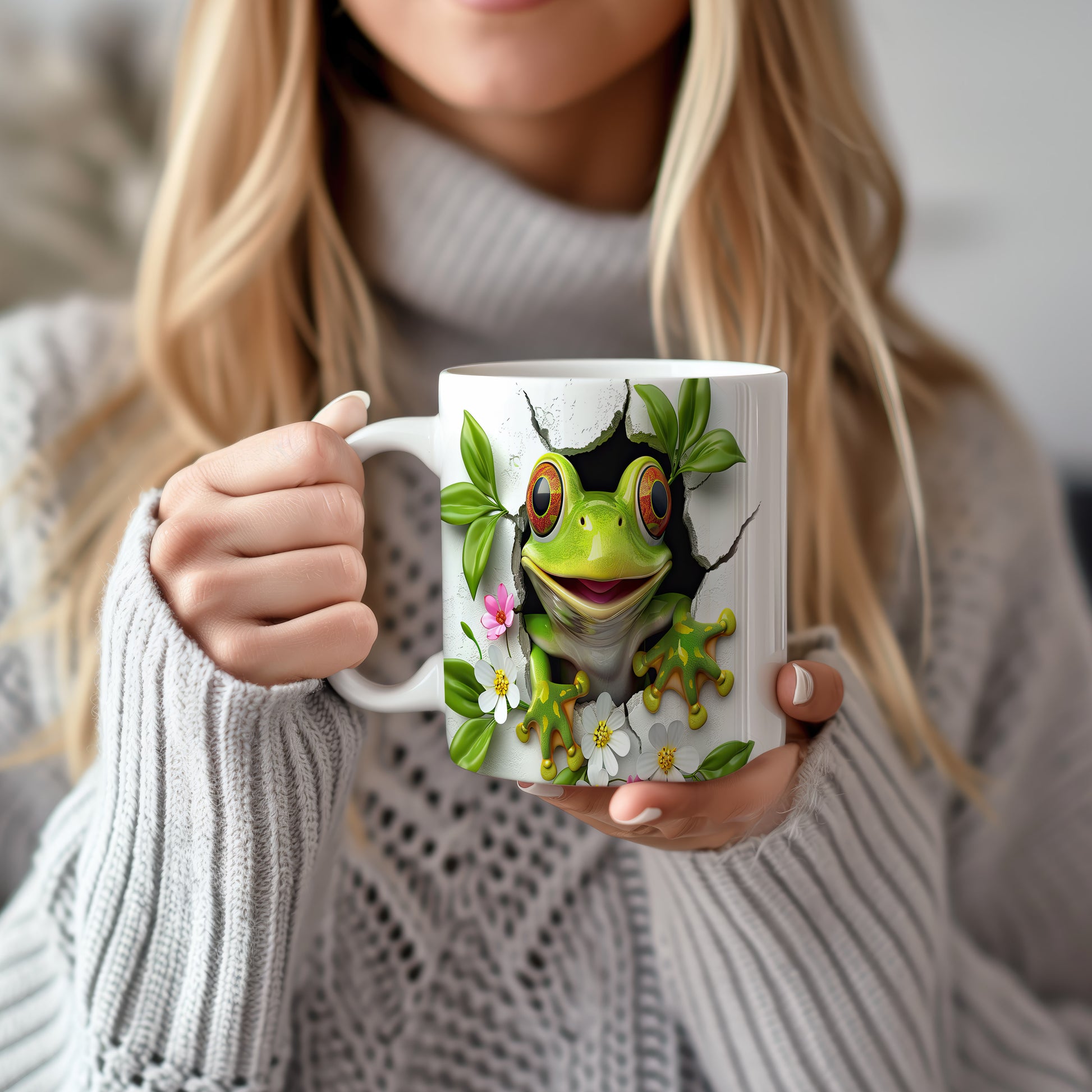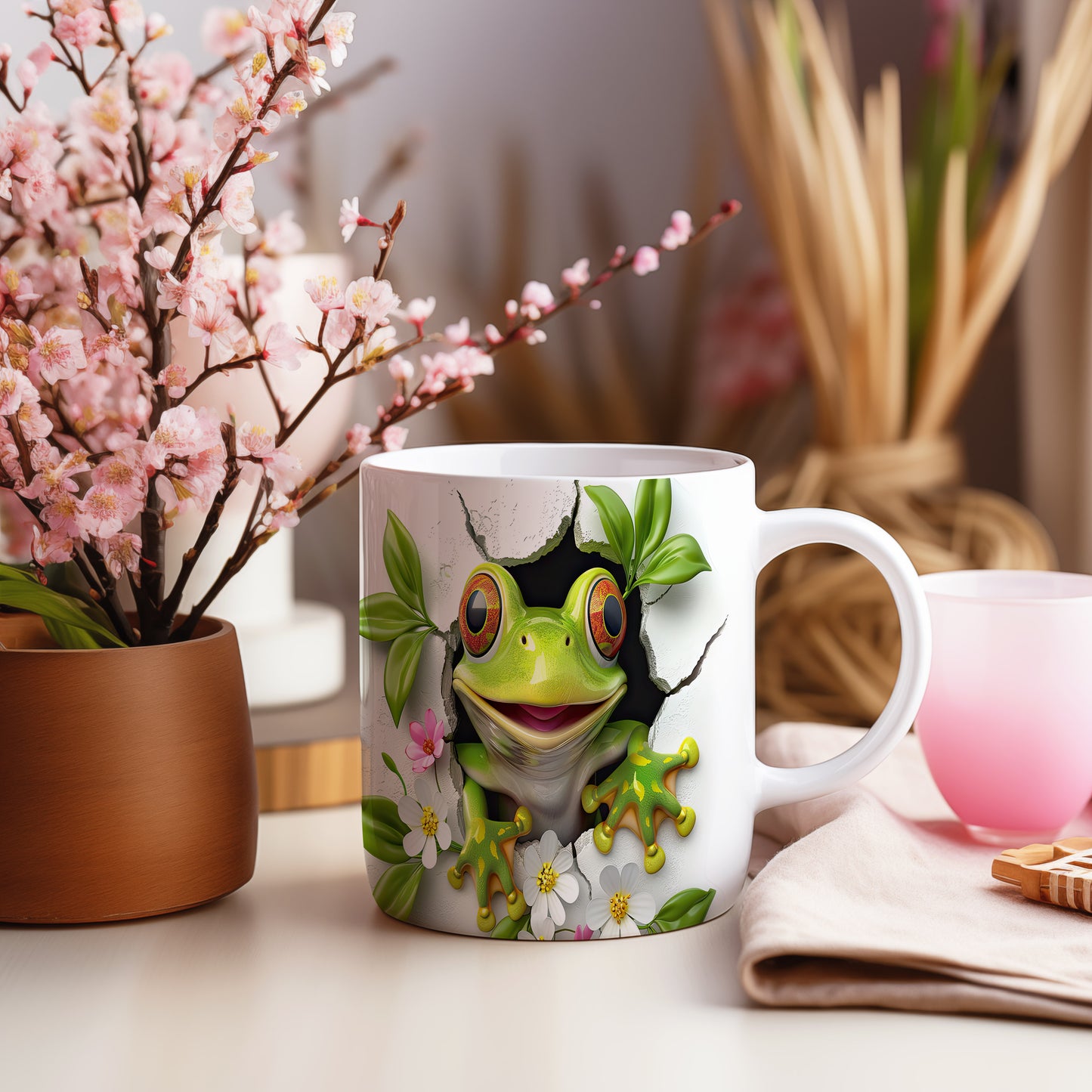 Tento hrnek zobrazuje veselou žabku, která vykukuje z 3D efektu obklopená kvetoucími rostlinami. Je ideální pro milovníky přírody a zvířat, skvělý tip na dárek pro každého, kdo má rád originální design. Materiál: keramika. Objem: 330 ml. Vhodné do myčky i mikrovlnky. Používání tohoto hrnku přináší radost a oživí každé pití.