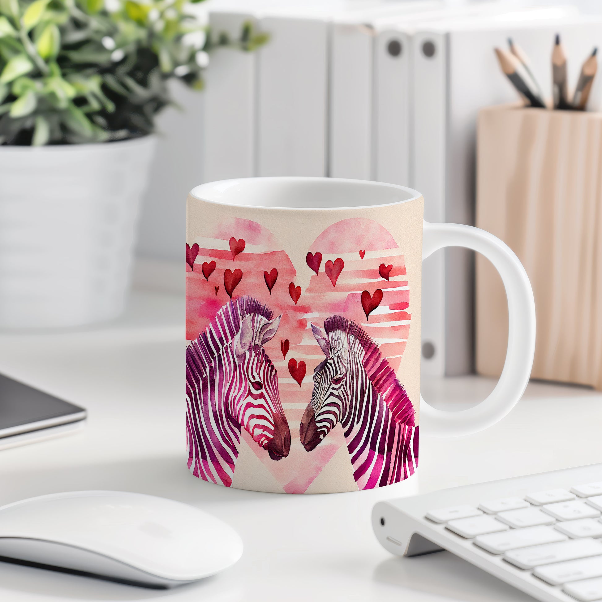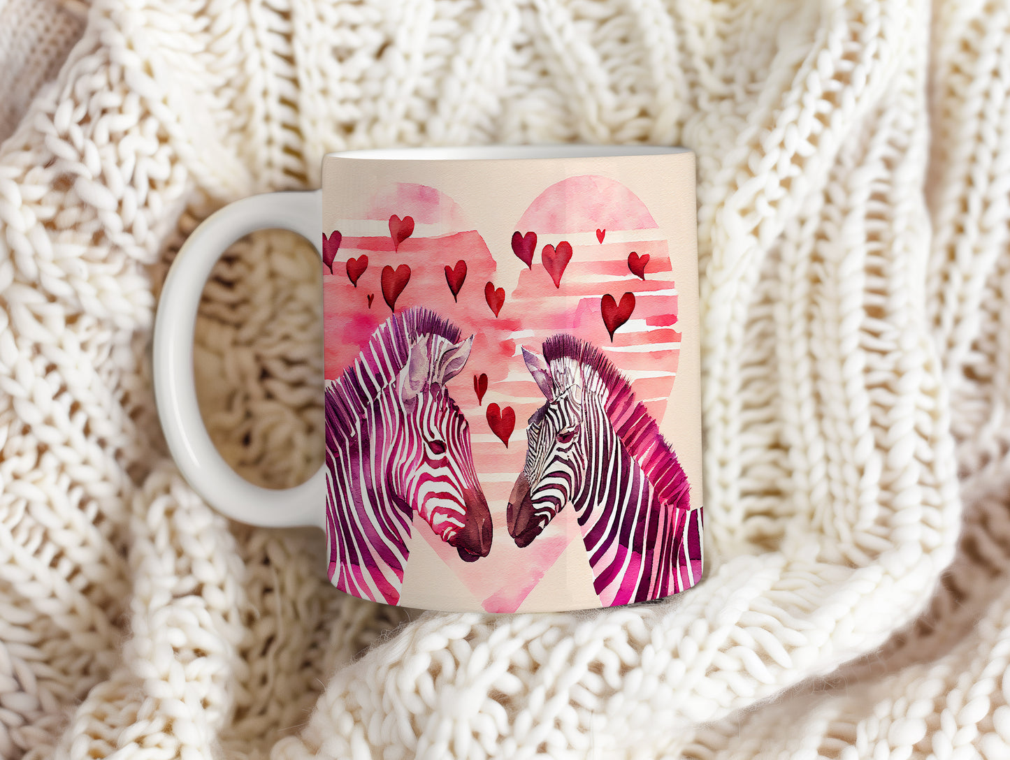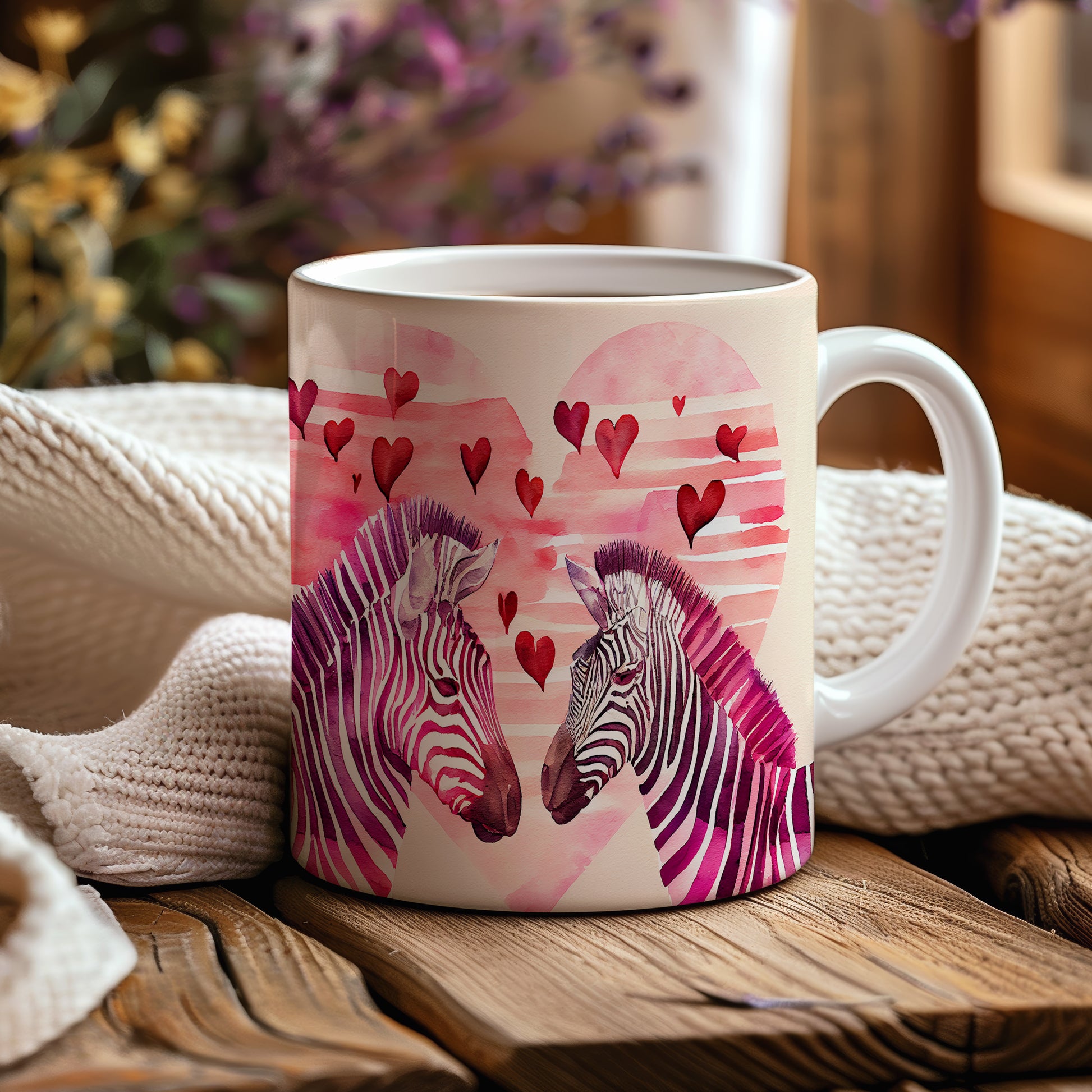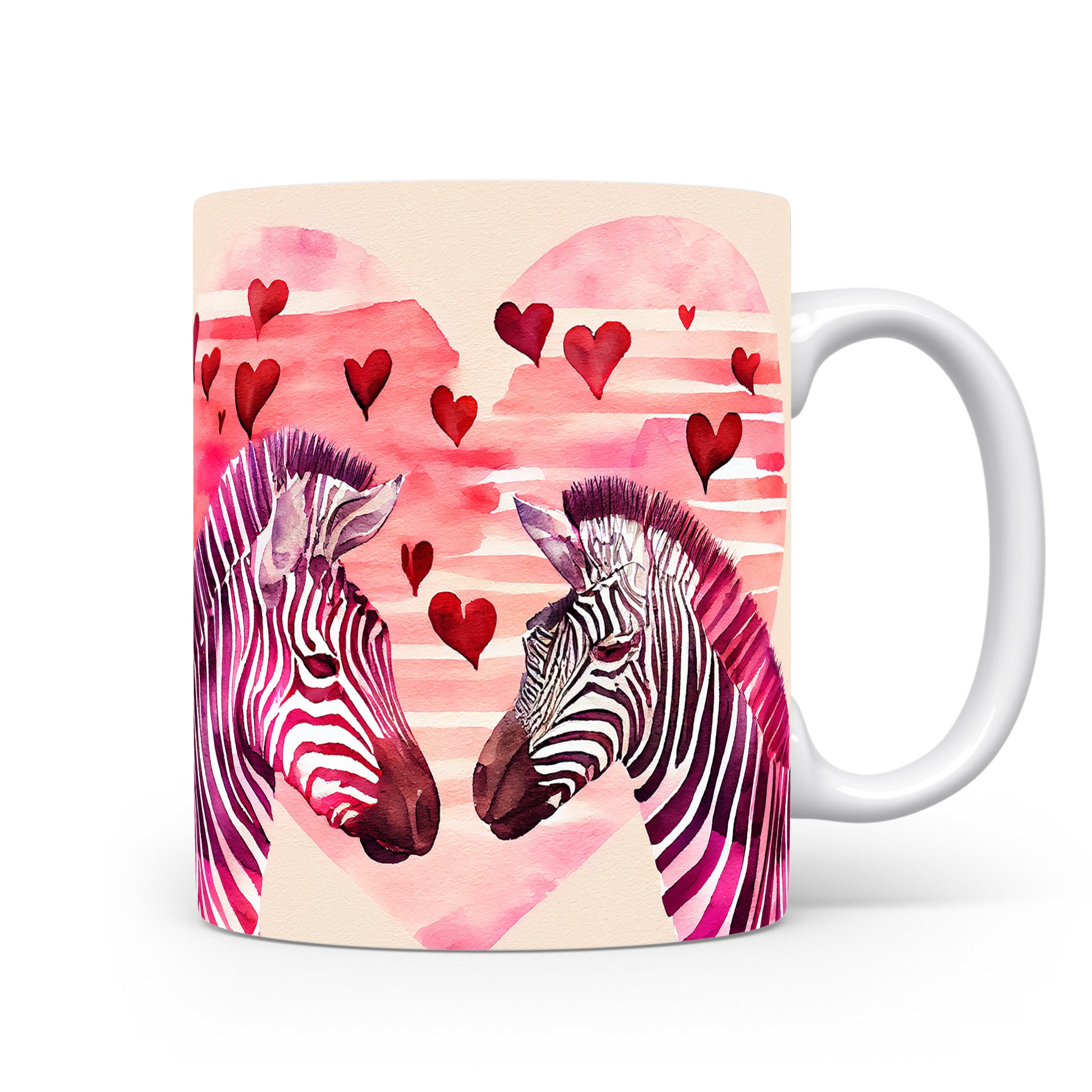 Tento hrnek zobrazuje zebry v romantickém motivu, obklopené srdíčky. Je ideální pro milovníky zvířat a originálního designu, skvělý tip na dárek pro vaše blízké. Materiál: keramika. Objem: 330 ml. Vhodné do myčky i mikrovlnky. Používání tohoto hrnku přináší radost a oživí každé pití.