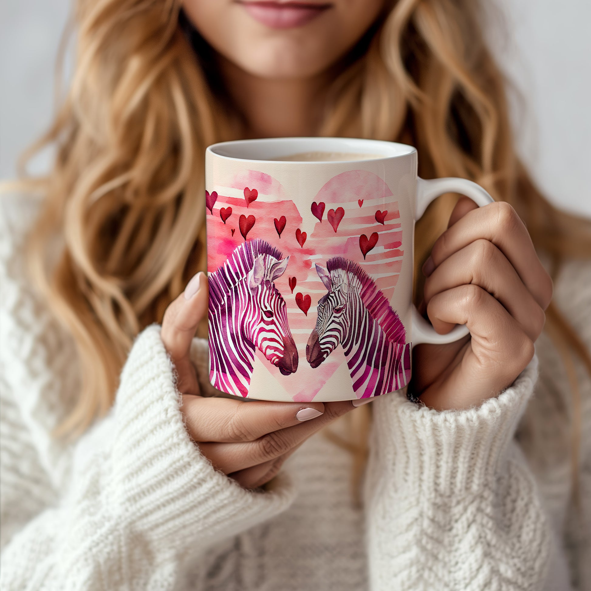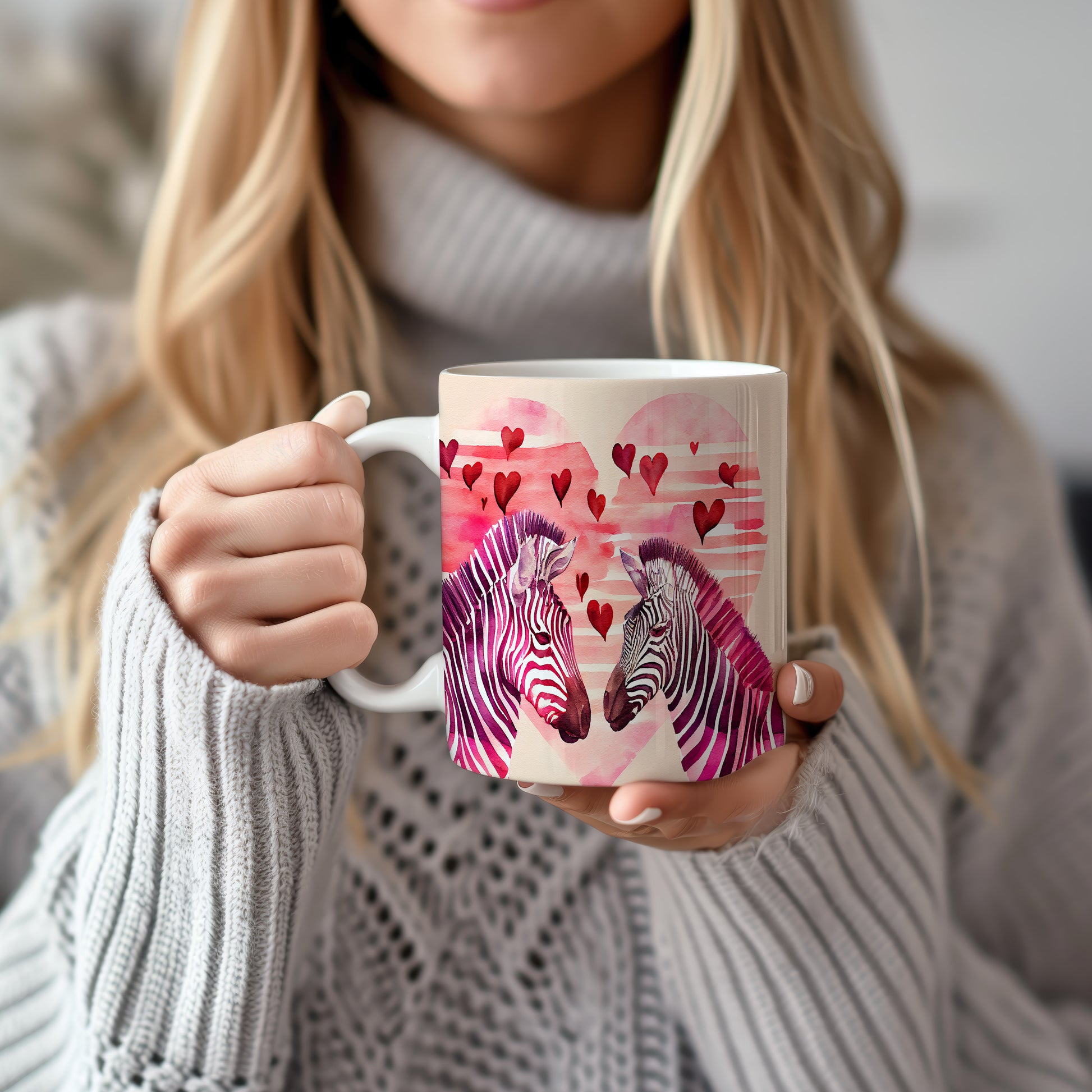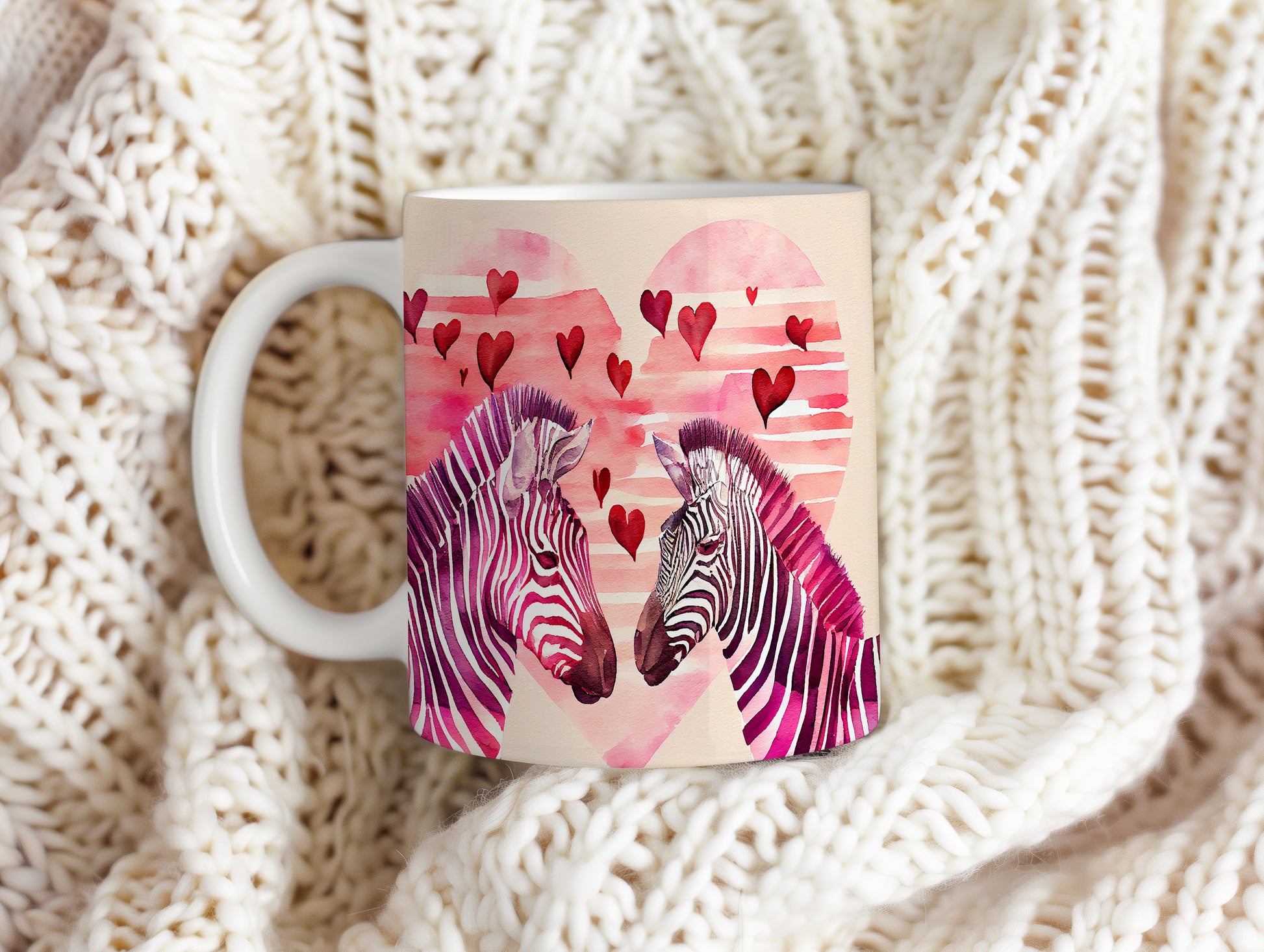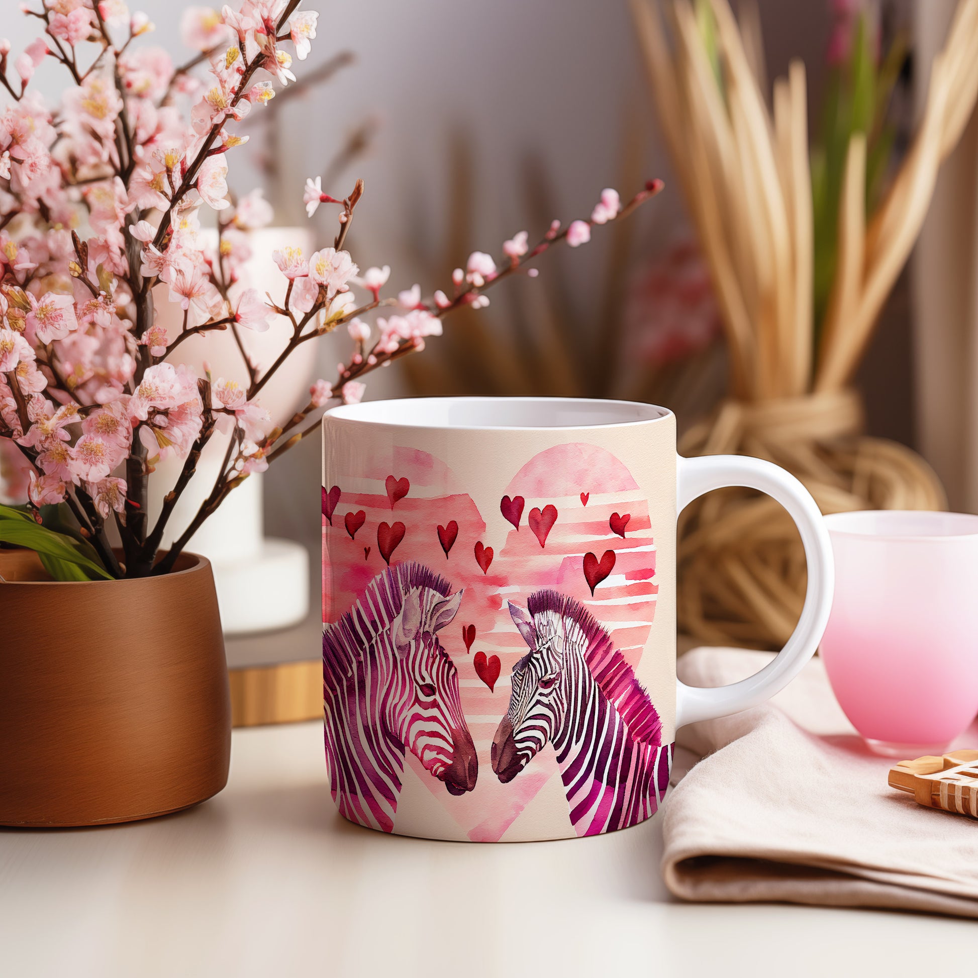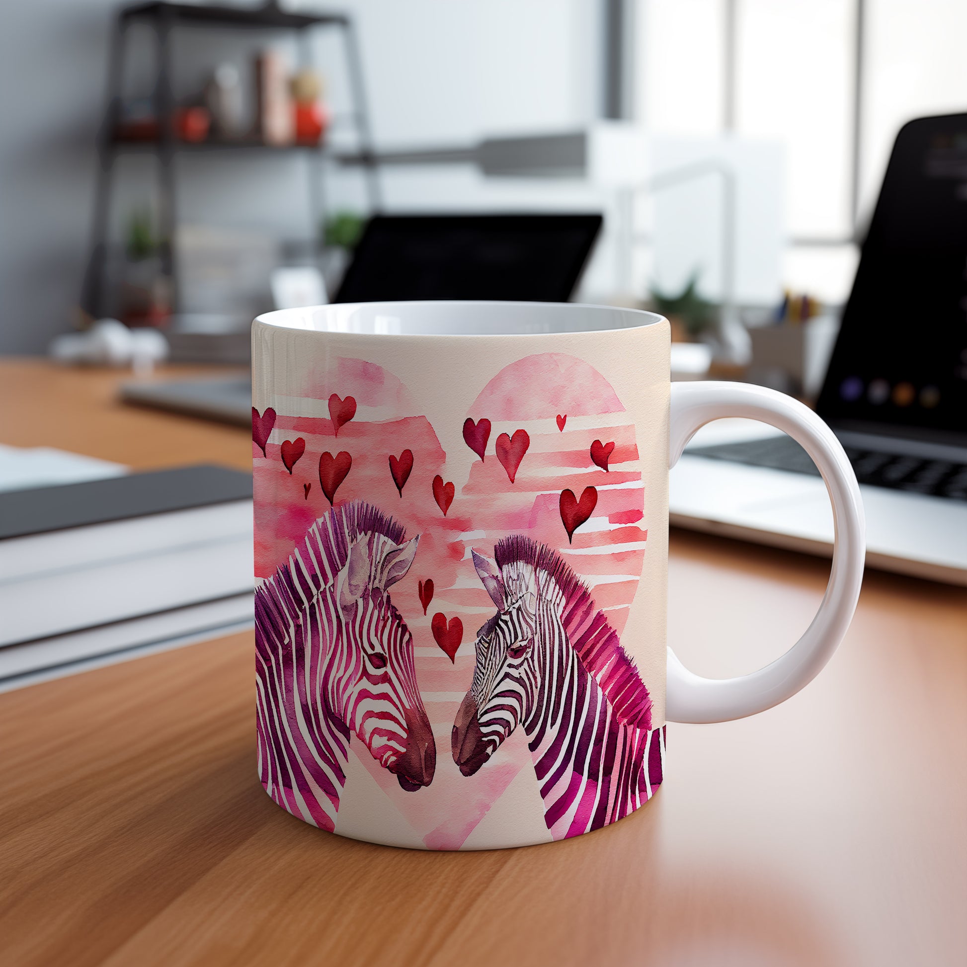 Tento hrnek zobrazuje zebry v romantickém motivu, obklopené srdíčky. Je ideální pro milovníky zvířat a originálního designu, skvělý tip na dárek pro vaše blízké. Materiál: keramika. Objem: 330 ml. Vhodné do myčky i mikrovlnky. Používání tohoto hrnku přináší radost a oživí každé pití.