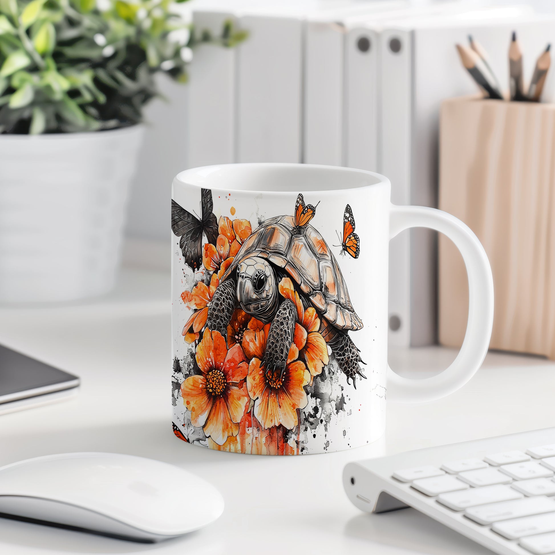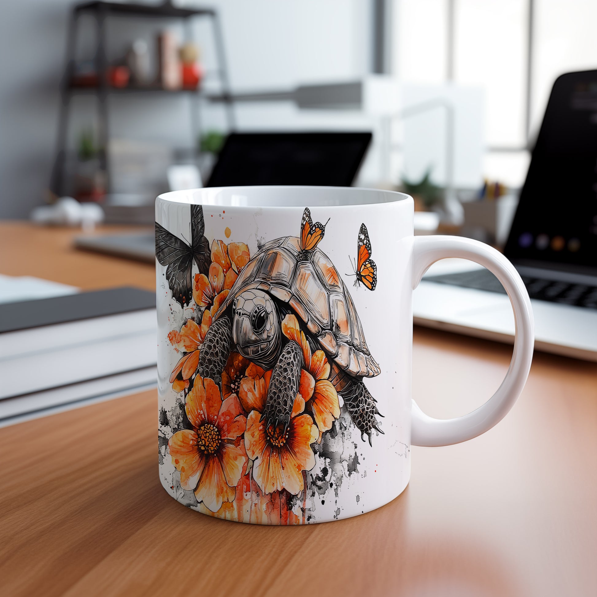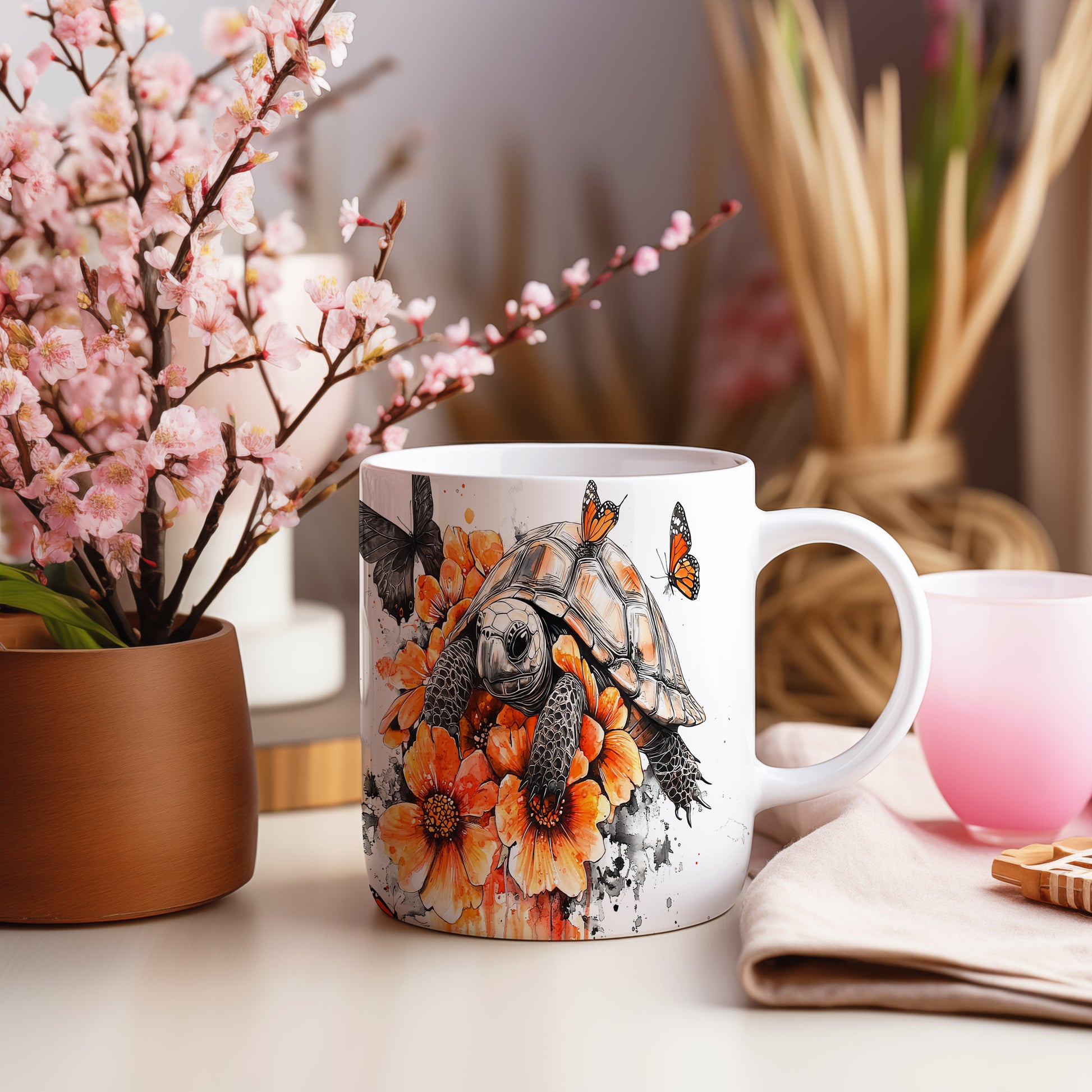 Tento hrnek s motivem želvy a květin je skvělým kouskem pro milovníky přírody a zvířat. Je ideální jako dárek pro přátele nebo rodinu, kteří ocení originální design. Materiál: keramika. Objem: 330 ml. Vhodné do myčky i mikrovlnky. Díky svému stylovému vzhledu přináší radost do každodenního pití.