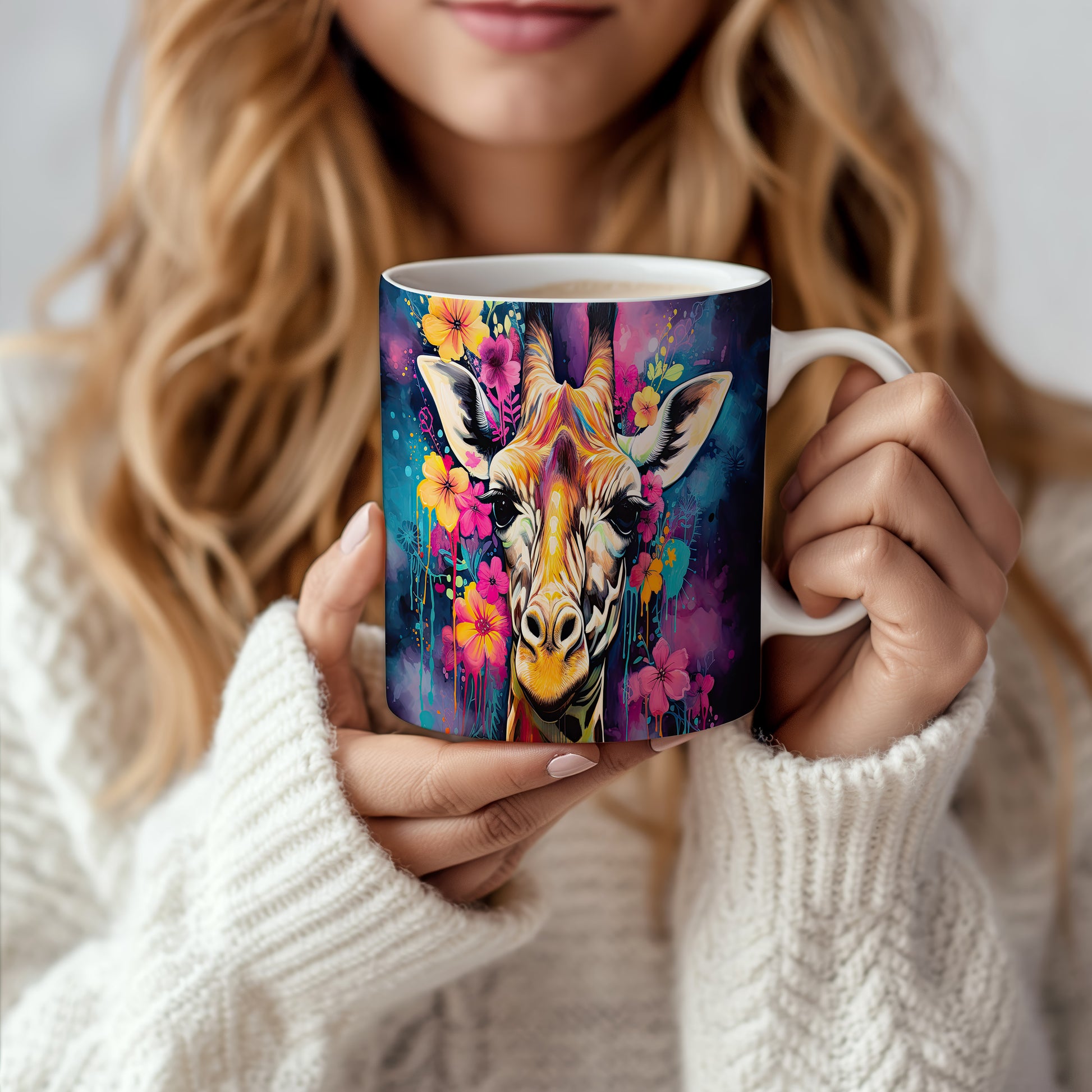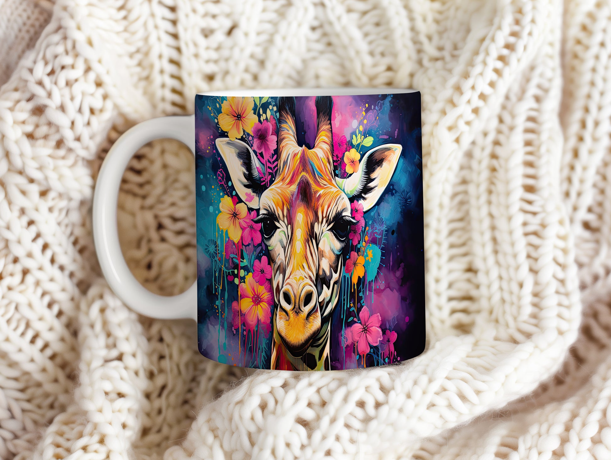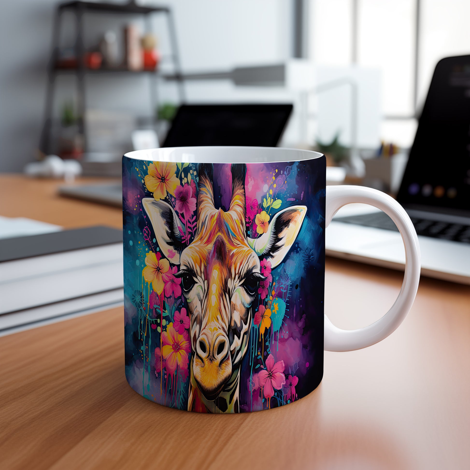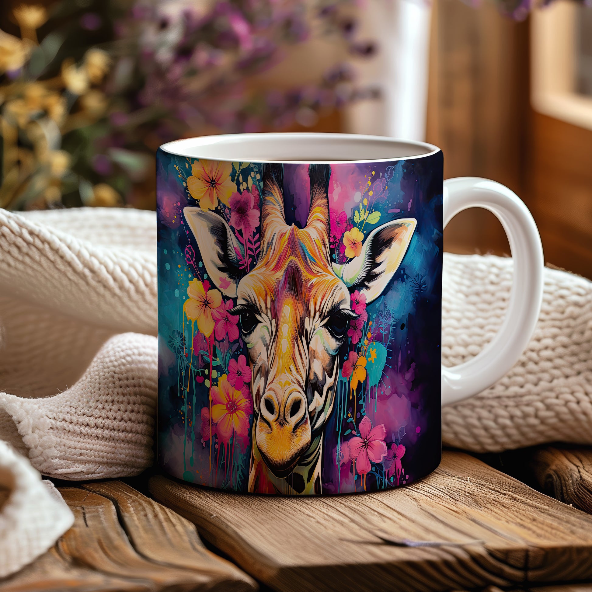 Hrnek se žirafou a květinovým motivem – malířským vzhledem