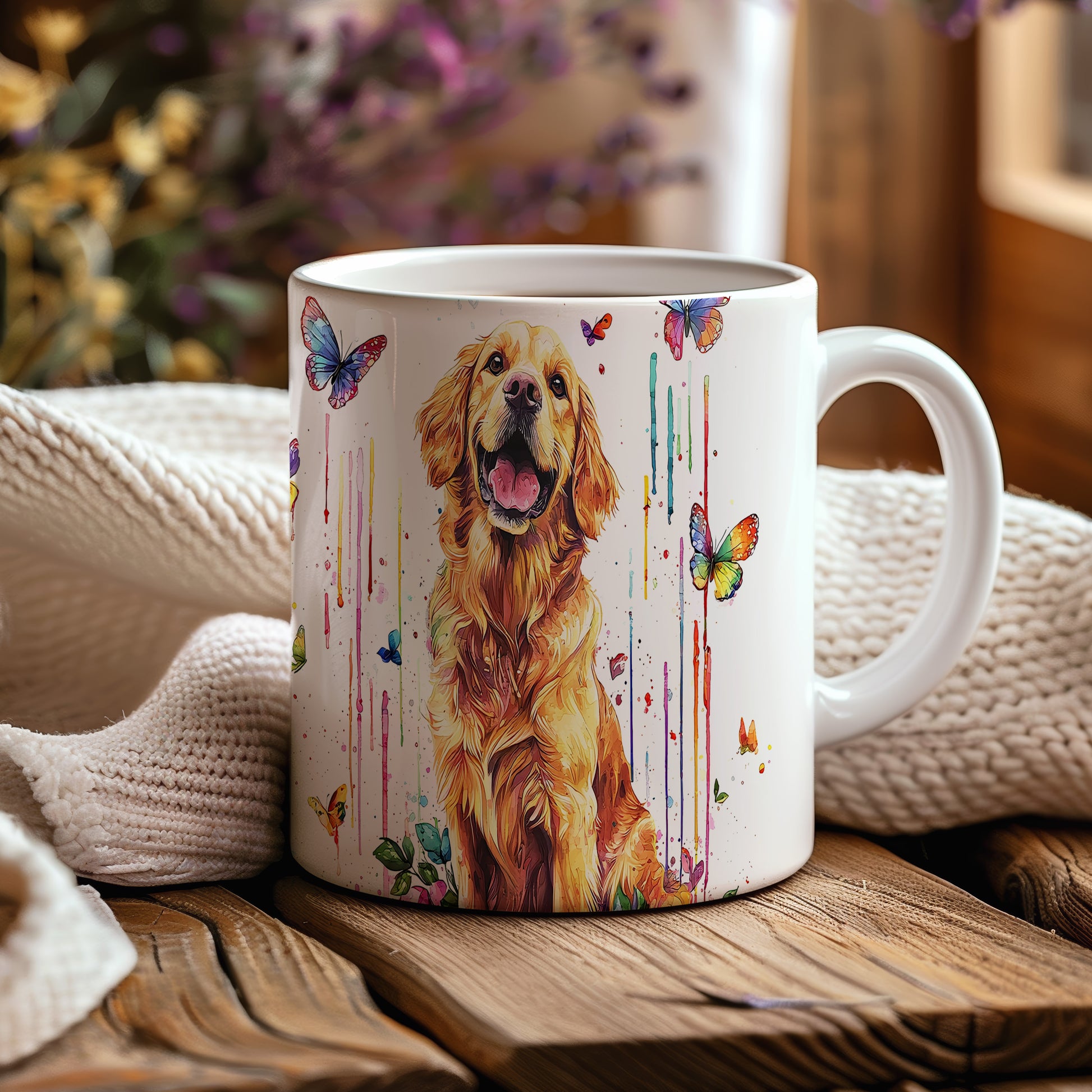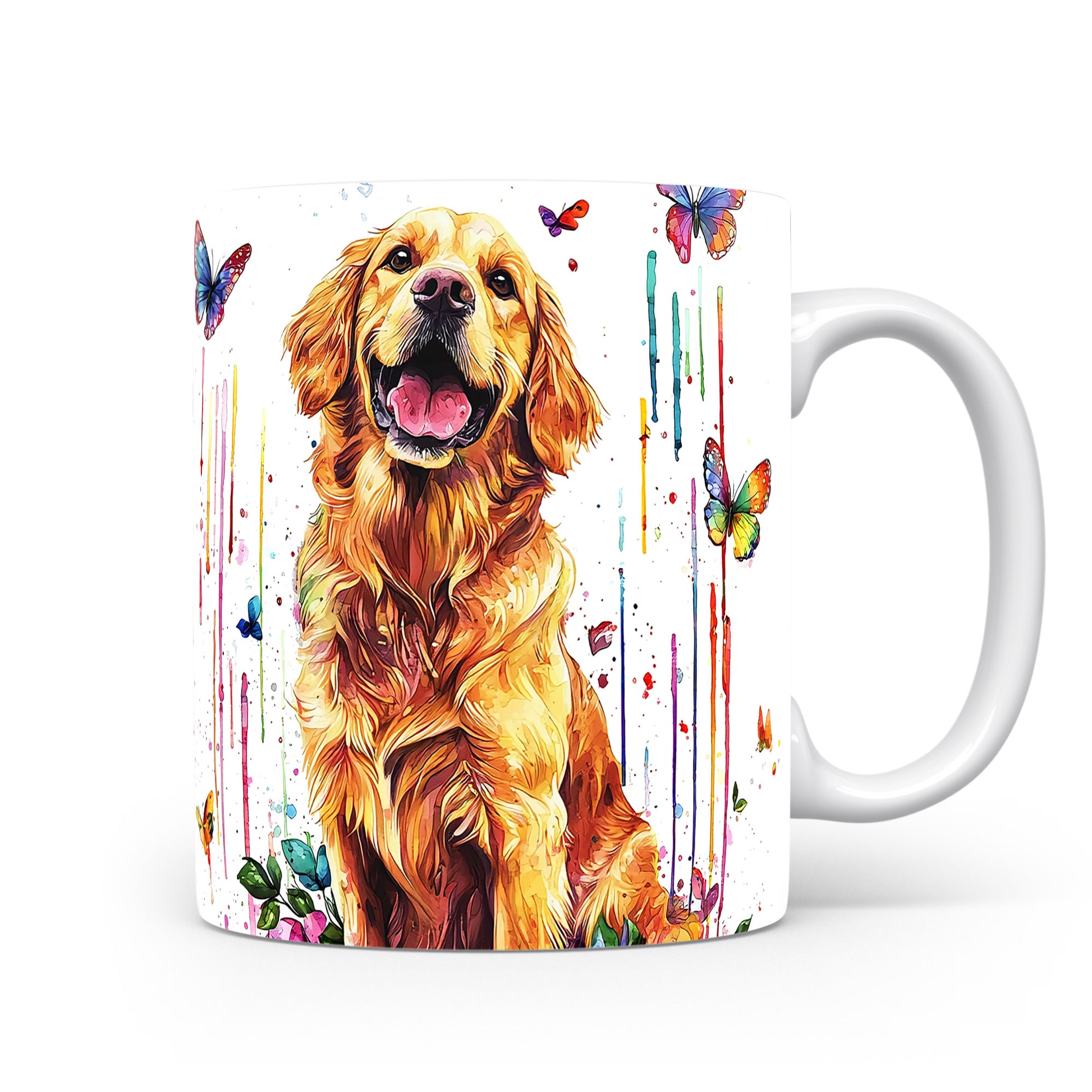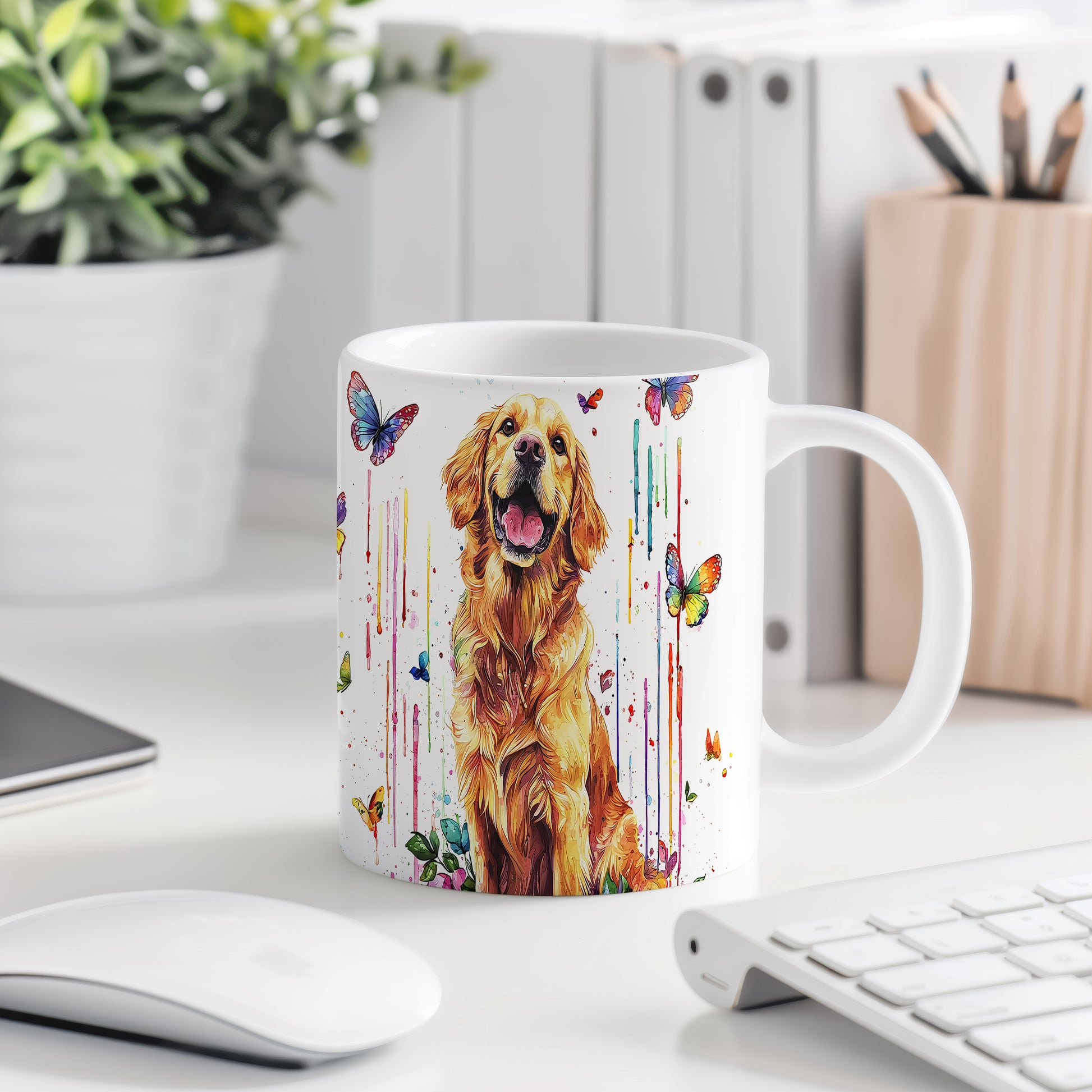 Tento keramický hrnek s motivem zlatého retrívra a barevných motýlů přináší radost a pozitivní energii. Je ideální pro milovníky psů a skvělý tip na dárek pro každého, kdo ocení veselou atmosféru. Materiál: keramika. Objem: 330 ml. Vhodné do myčky i mikrovlnky. Používáním tohoto hrnku si zpříjemníte každé pití a dodáte mu osobitý styl.