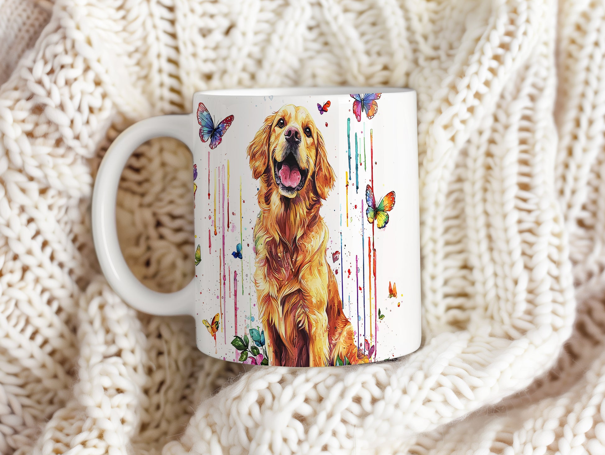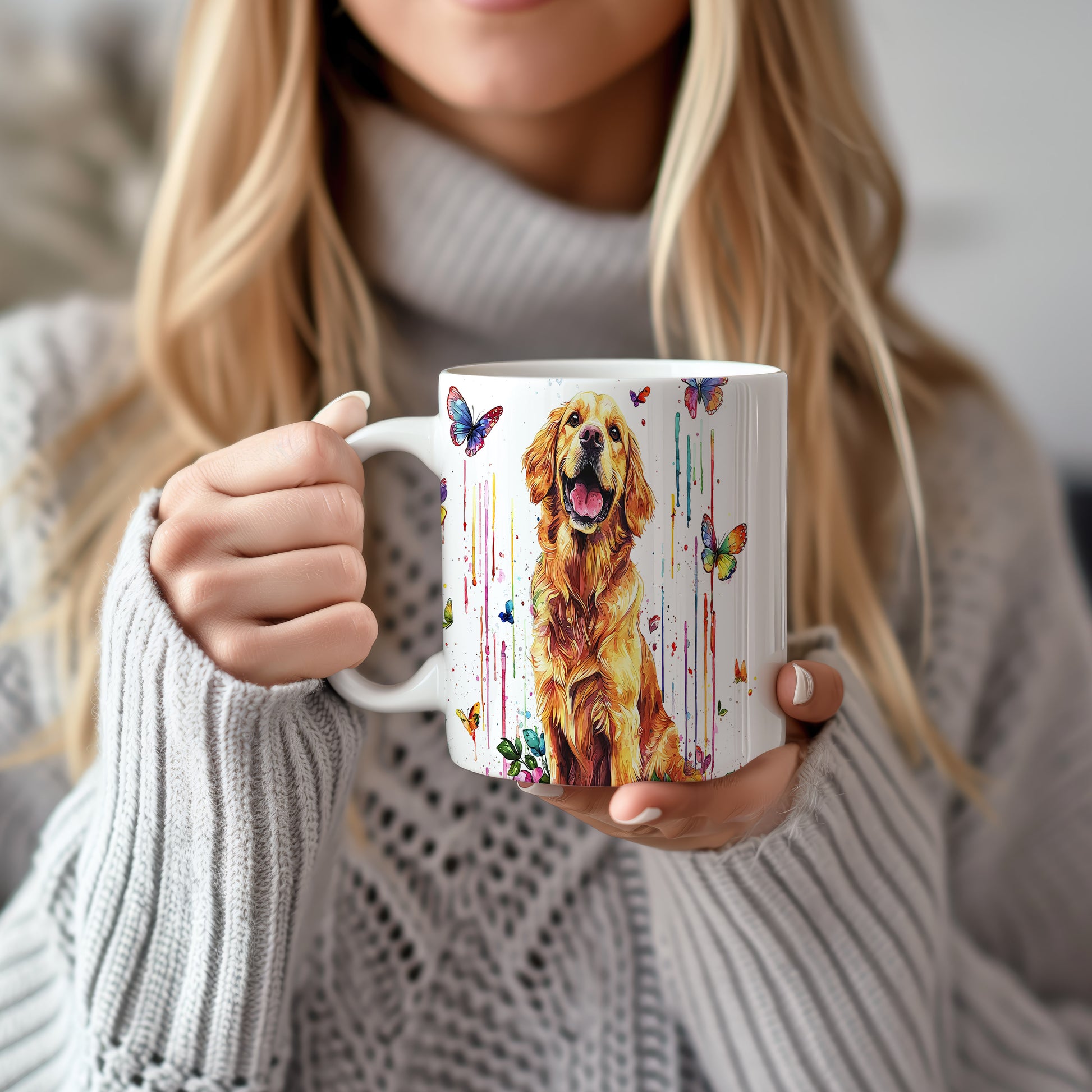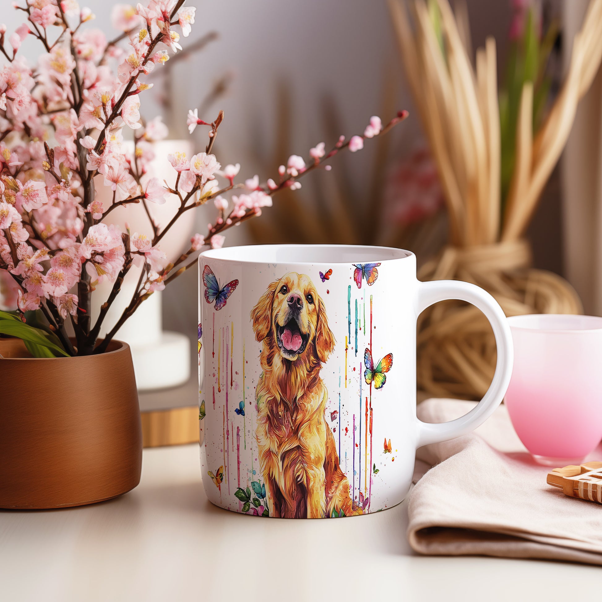 Tento keramický hrnek s motivem zlatého retrívra a barevných motýlů přináší radost a pozitivní energii. Je ideální pro milovníky psů a skvělý tip na dárek pro každého, kdo ocení veselou atmosféru. Materiál: keramika. Objem: 330 ml. Vhodné do myčky i mikrovlnky. Používáním tohoto hrnku si zpříjemníte každé pití a dodáte mu osobitý styl.