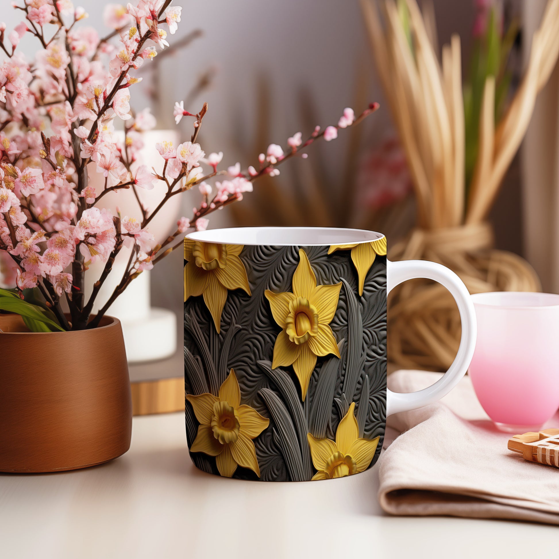 Hrnek se žlutými květy narcisů
