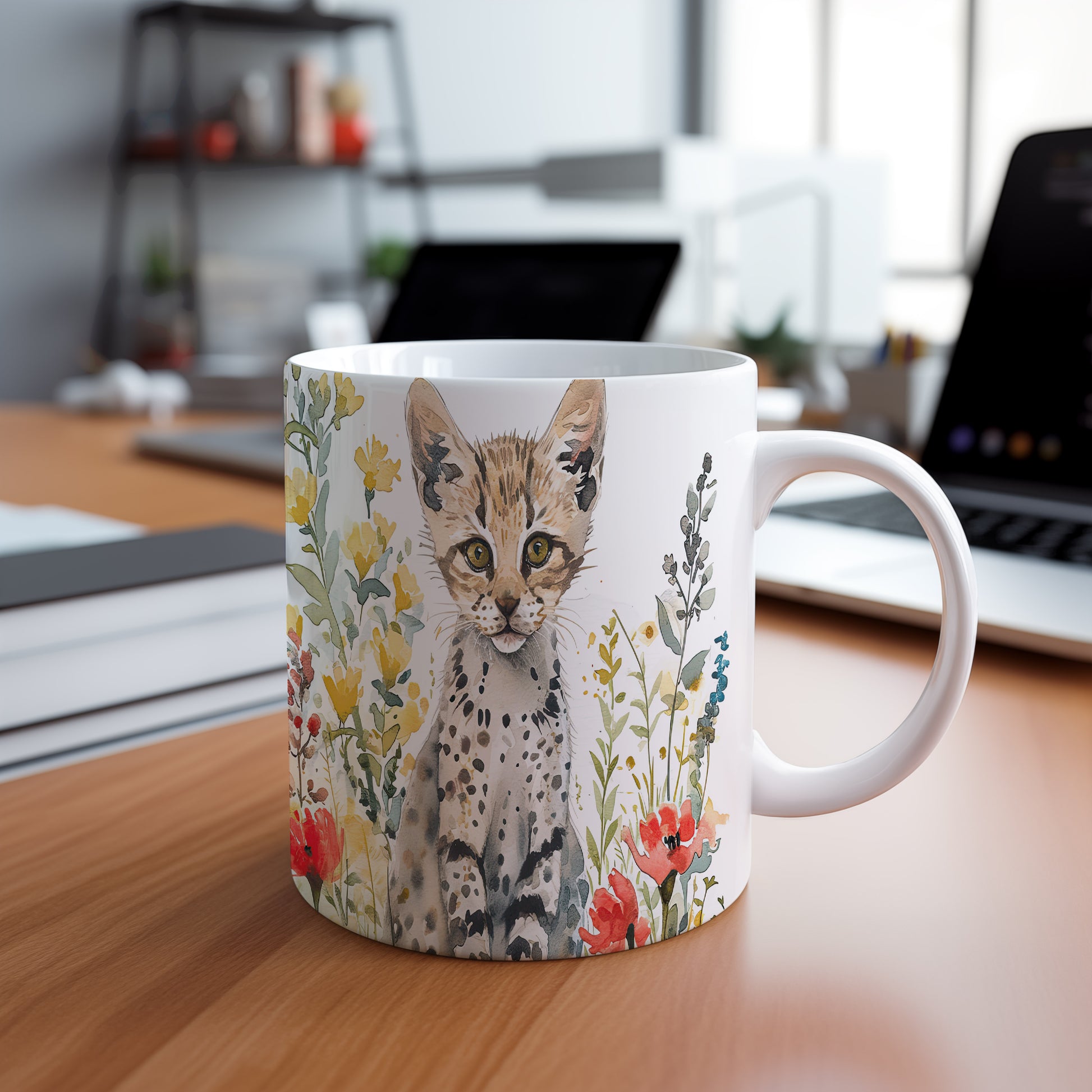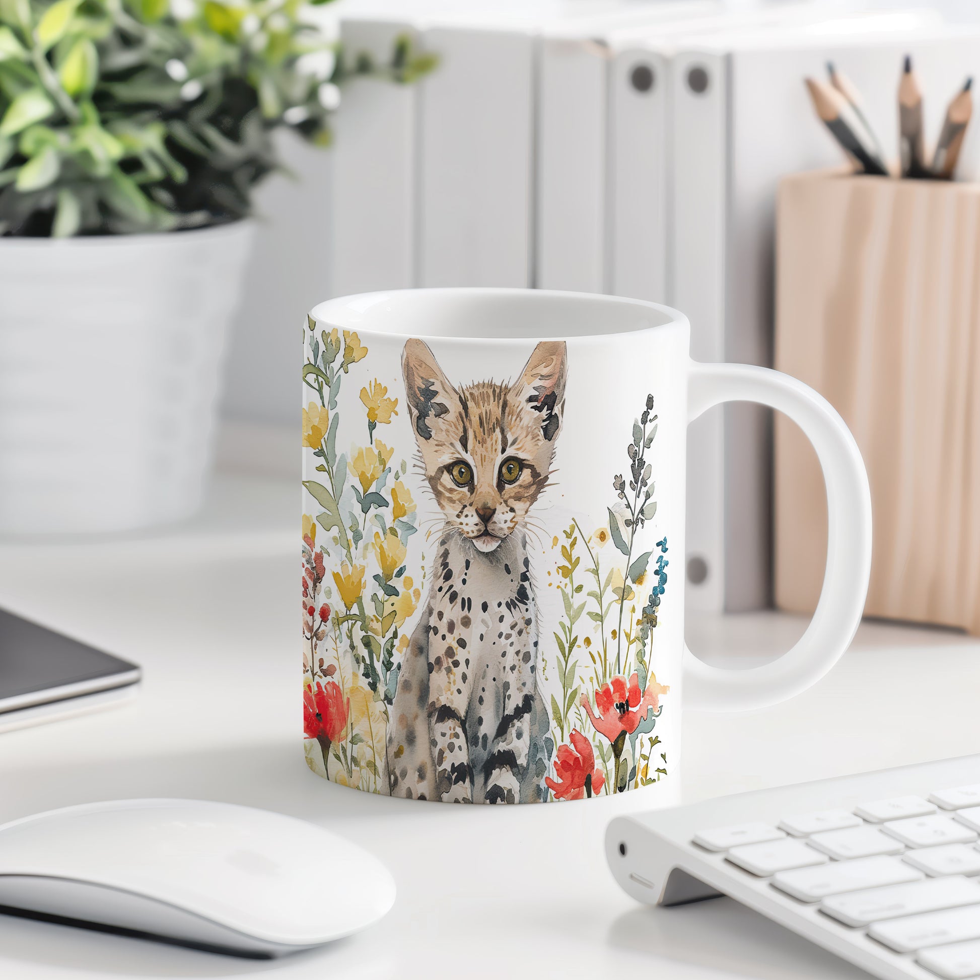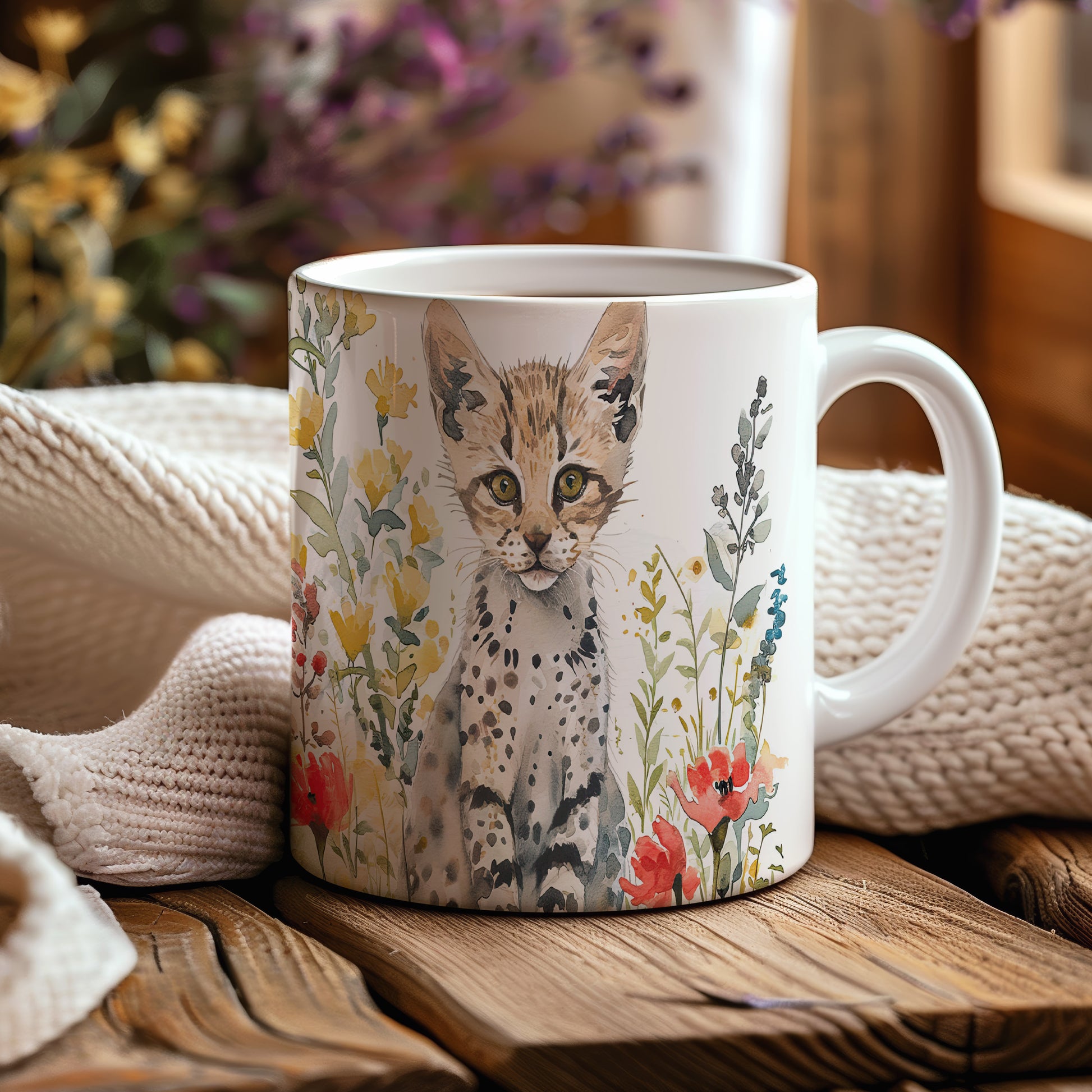 Tento keramický hrnek s motivem malé divoké kočky a barevných květin přináší do vašeho dne radost a svěžest. Je ideální pro milovníky zvířat a skvělým dárkem pro přátele či rodinu. Materiál: keramika. Objem: 330 ml. Vhodné do myčky i mikrovlnky. Užijte si kávu nebo čaj s tímto jedinečným designem, který potěší každého.