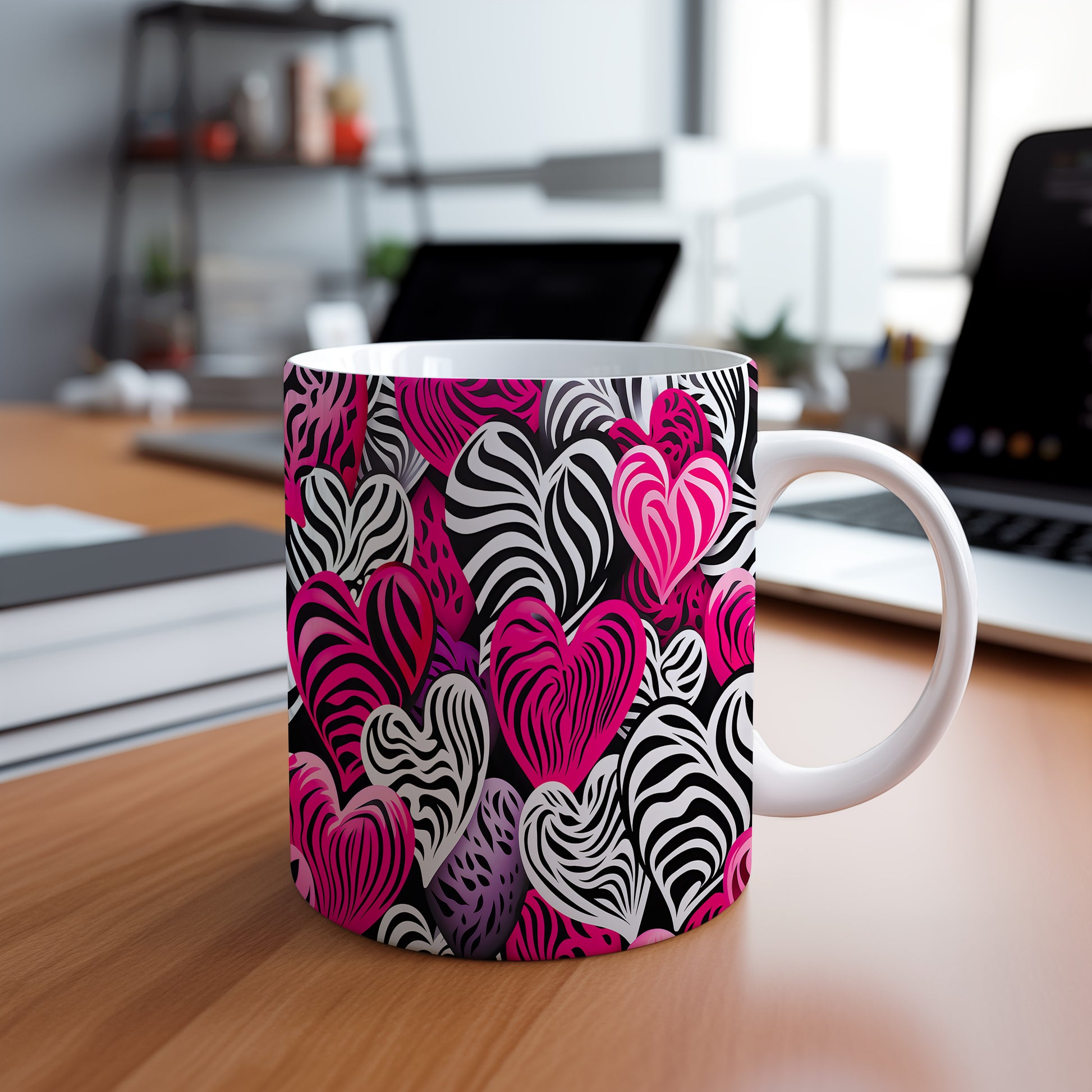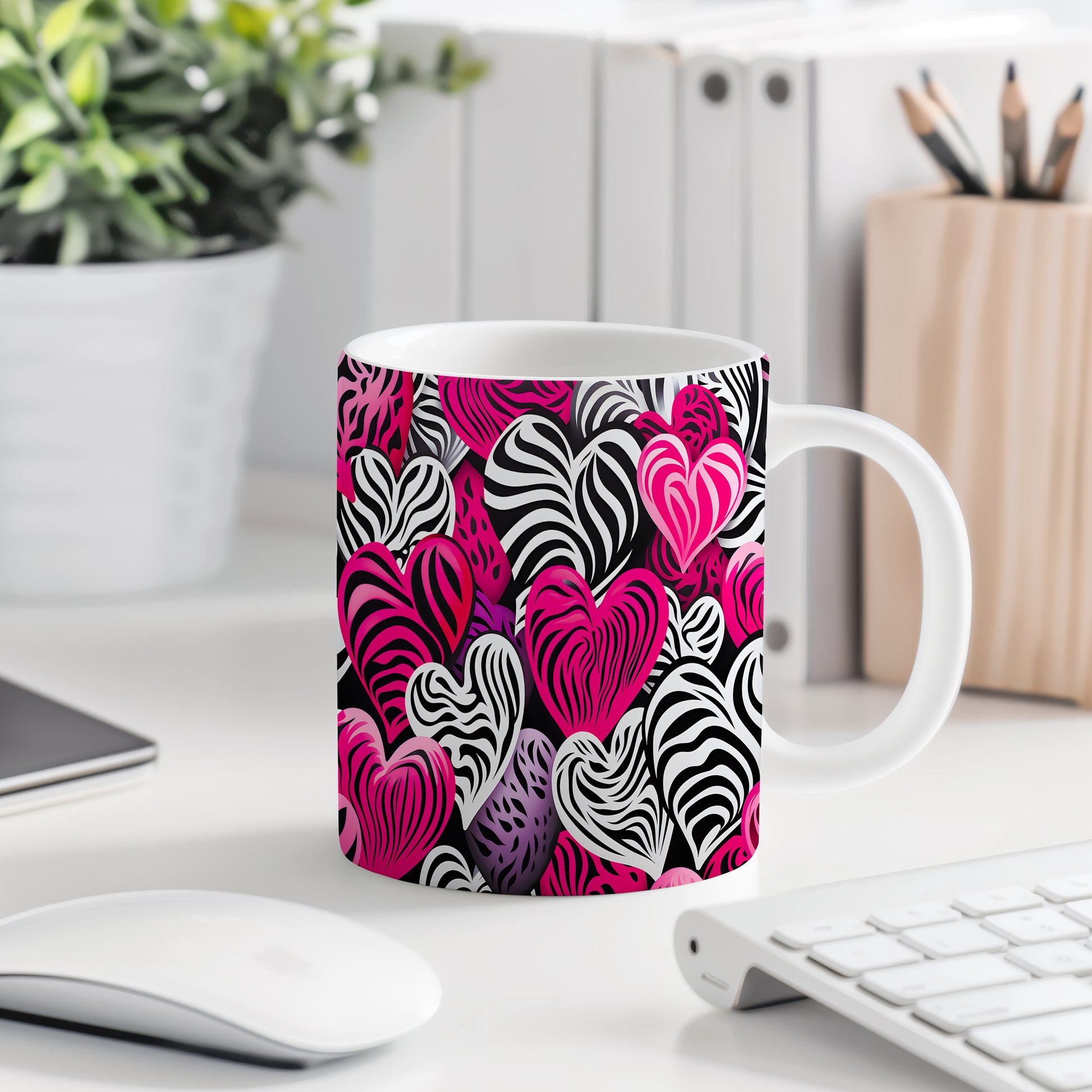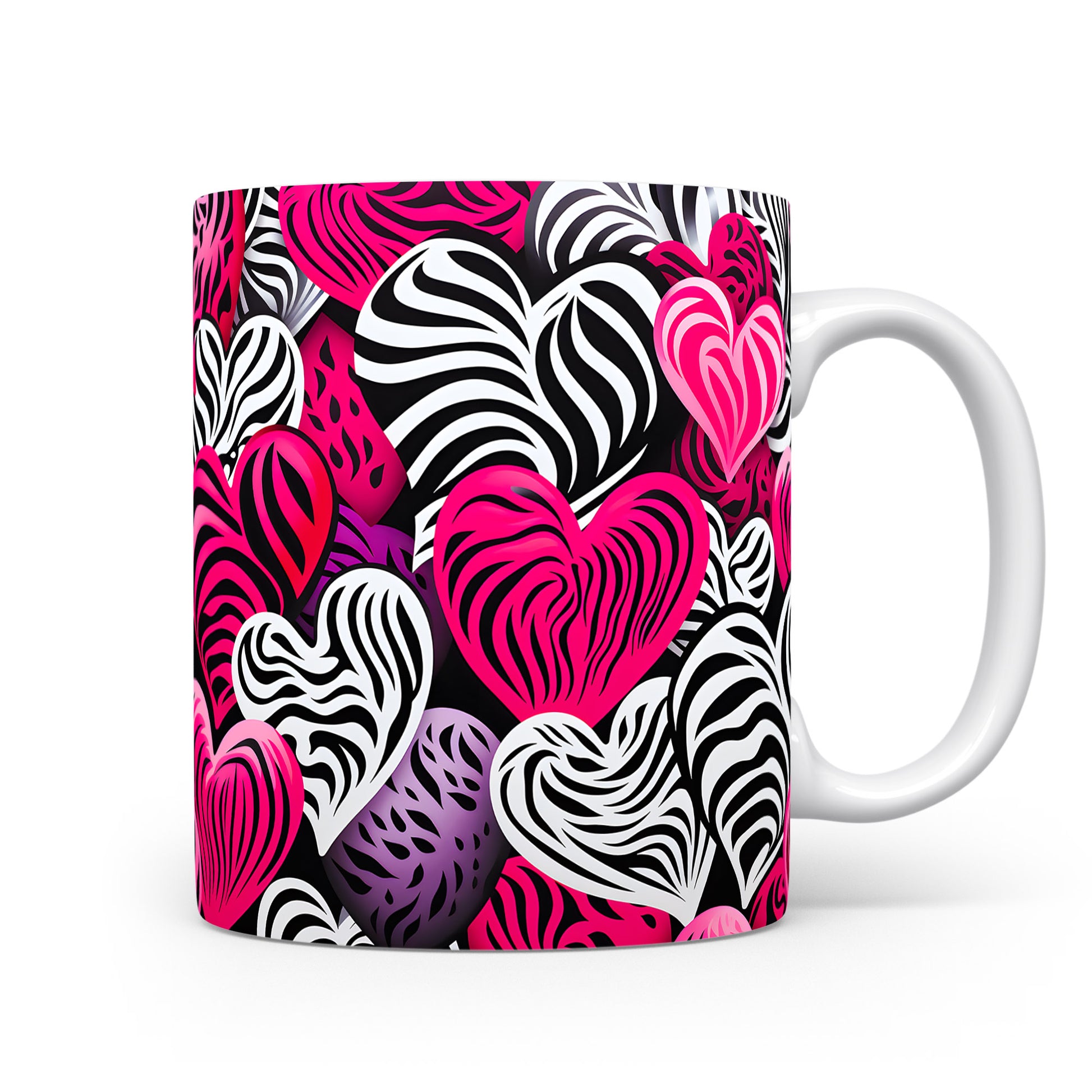 Objevte kouzlo lásky s naším hrnkem plným srdcí v zebrovém designu. Tento hrnek přináší jedinečnou kombinaci černobílého vzoru s výraznými růžovými tóny, která zaujme každého. Ideální pro romantické chvíle nebo jako dárek pro milovanou osobu.