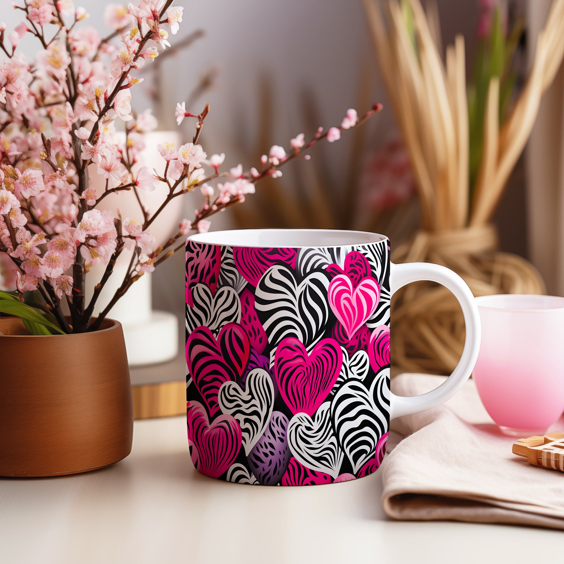 Hrnek se srdci v zebrovém stylu v růžových tónech