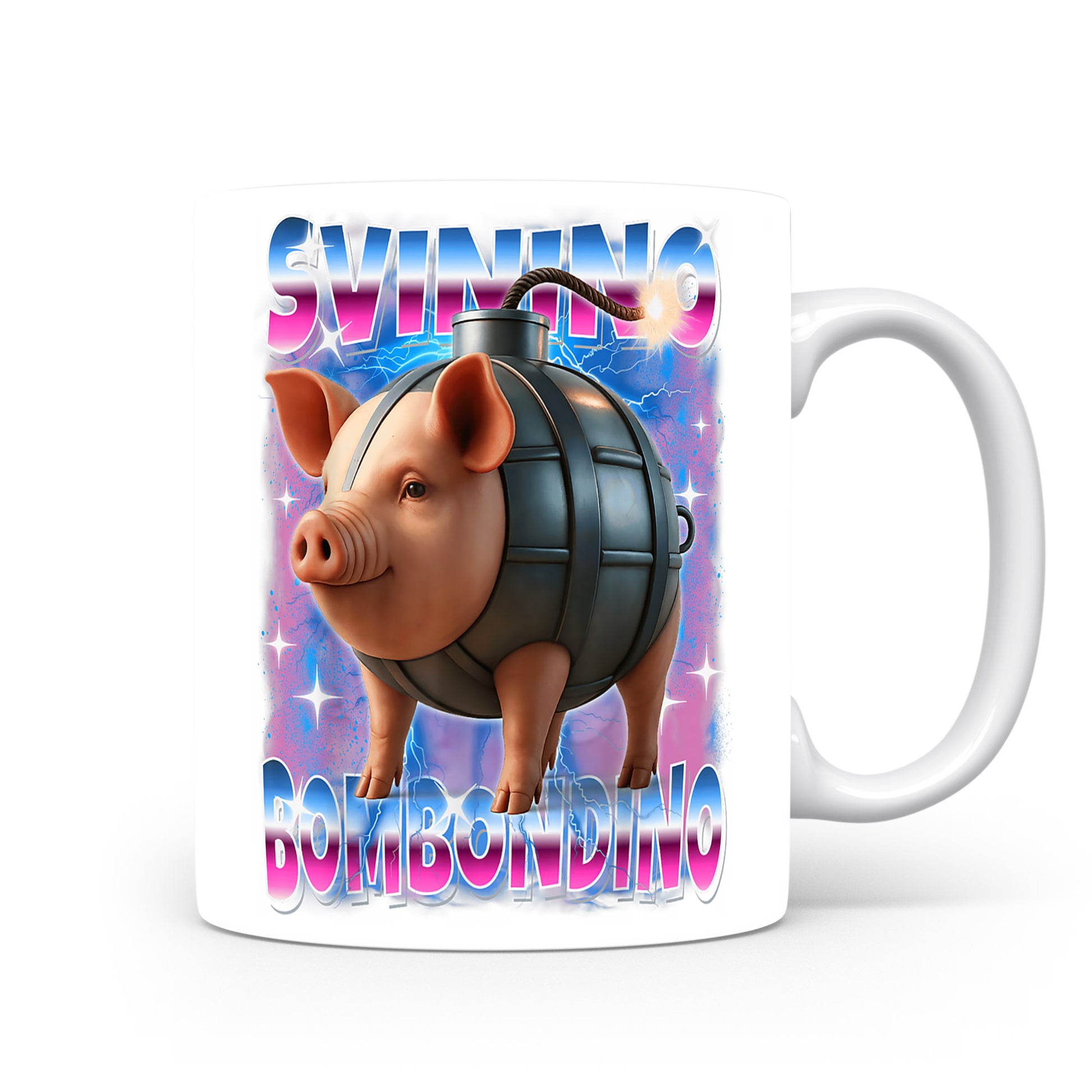 Design inspirovaný italským brainrotem: Surpriso Bombardino — prasátko s bombou. Lesklý keramický hrnek 330 ml.