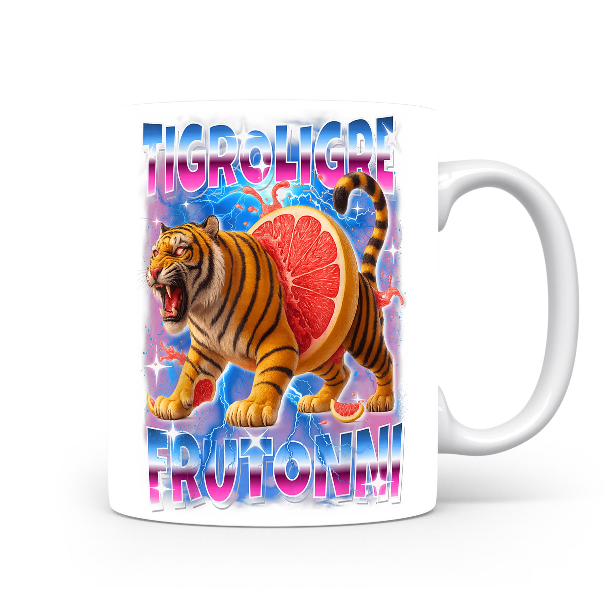Design inspirovaný italským brainrotem: Tiger Grapefruit — tygr s grepem. Lesklý keramický hrnek 330 ml.