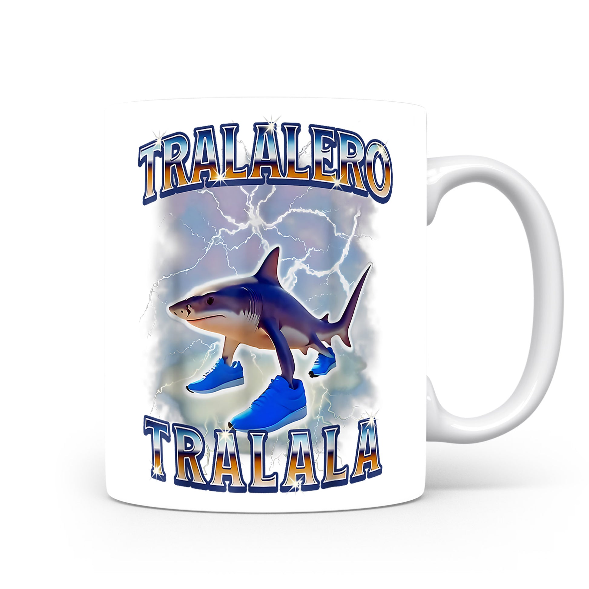 Design inspirovaný italským brainrotem: Tralalero Tralala — žralok bouřka. Lesklý keramický hrnek 330 ml.