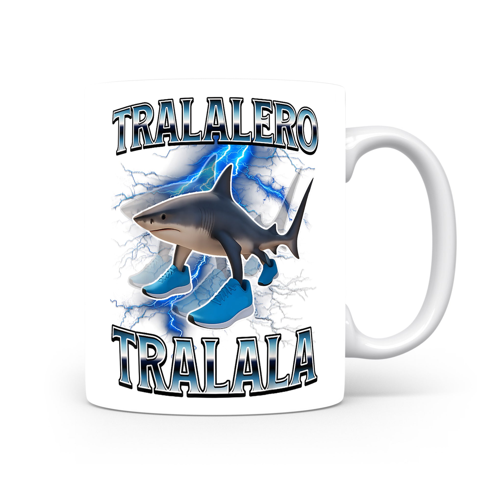 Design inspirovaný italským brainrotem: Tralalero Tralala — žralok modrá pěna. Lesklý keramický hrnek 330 ml.