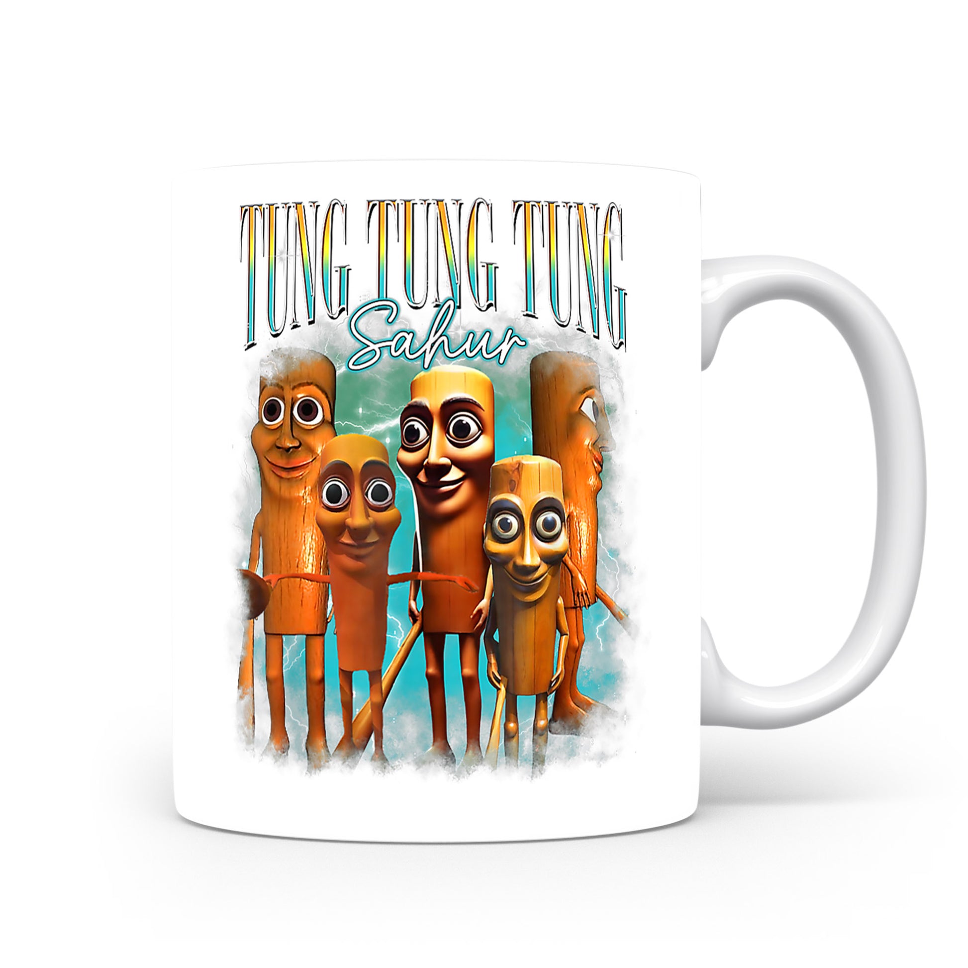 Design inspirovaný italským brainrotem: Tung Tung Tung Sahur — parta (tyrkys). Lesklý keramický hrnek 330 ml.