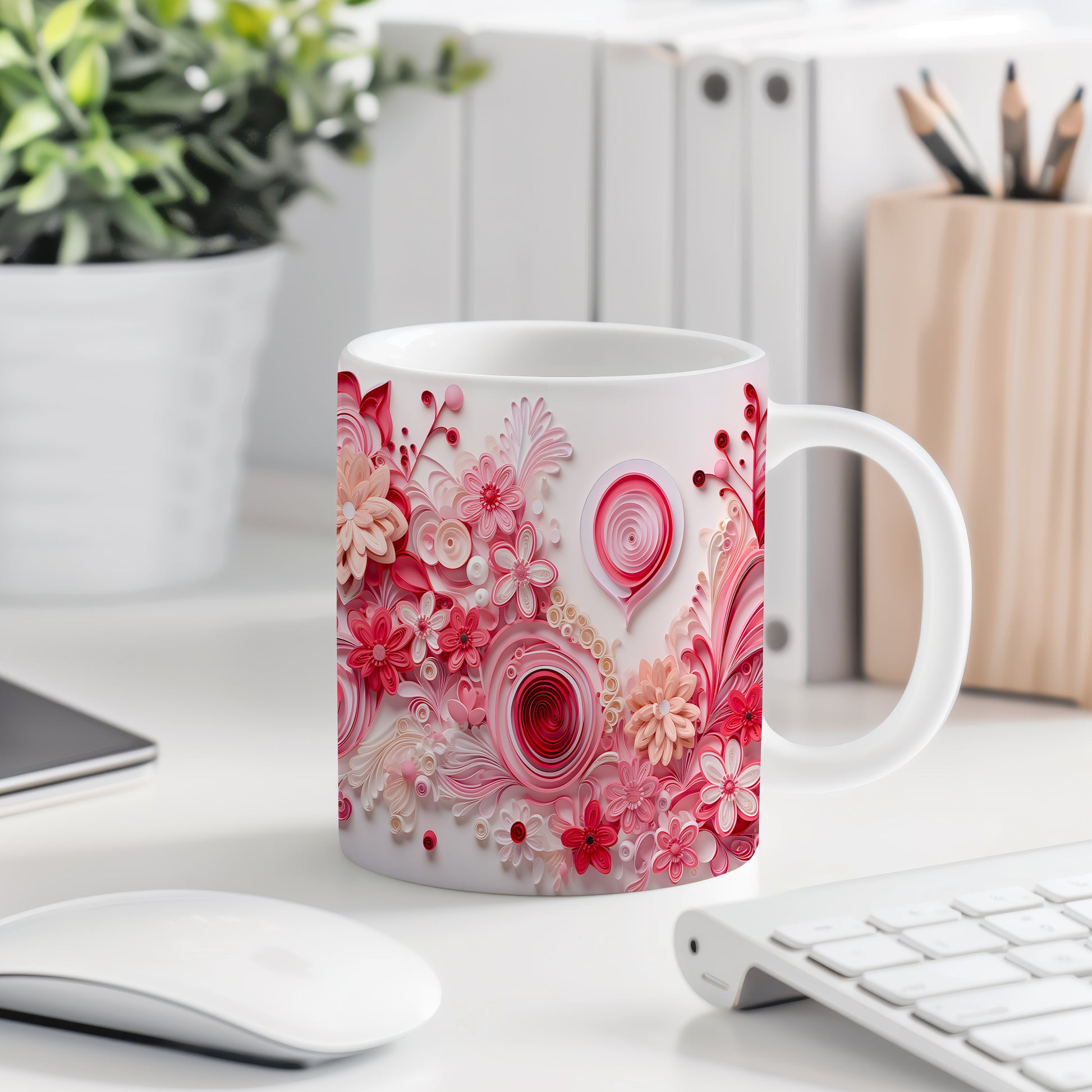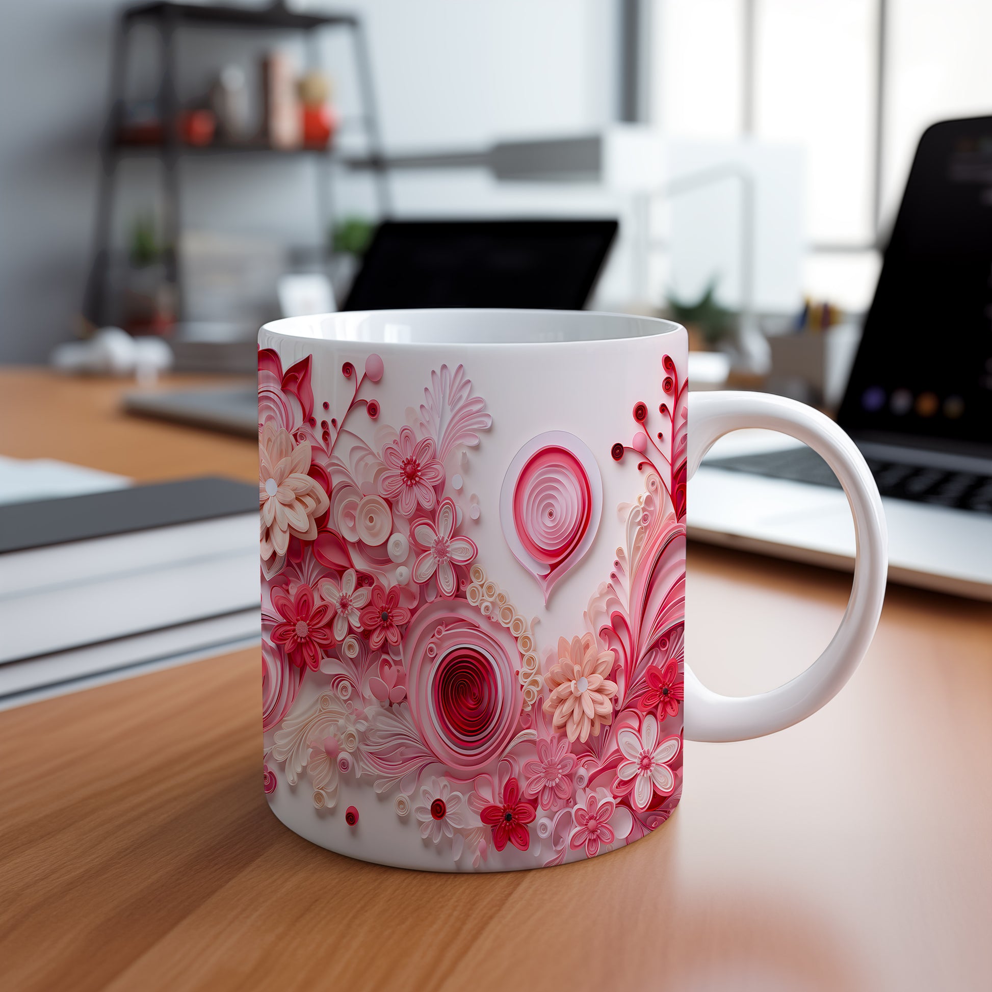 Objevte kouzlo květinového dekoru na tomto jedinečném hrnku. Růžové odstíny v kombinaci s jemnými detaily přinášejí pocit elegance a krásy. Ideální pro chvíle pohody.