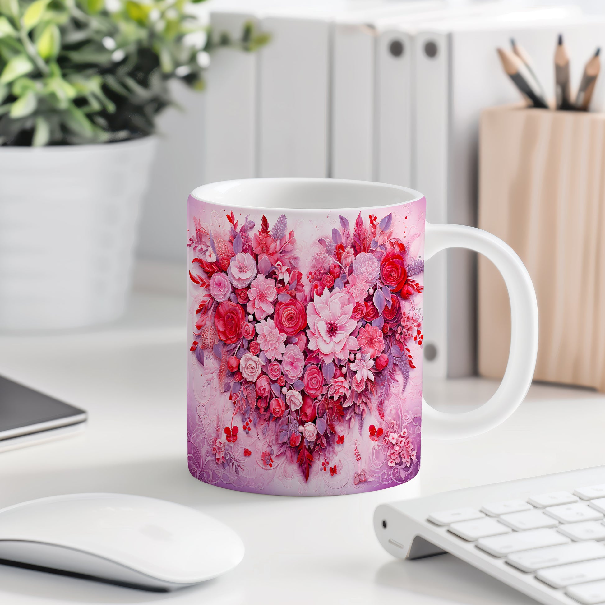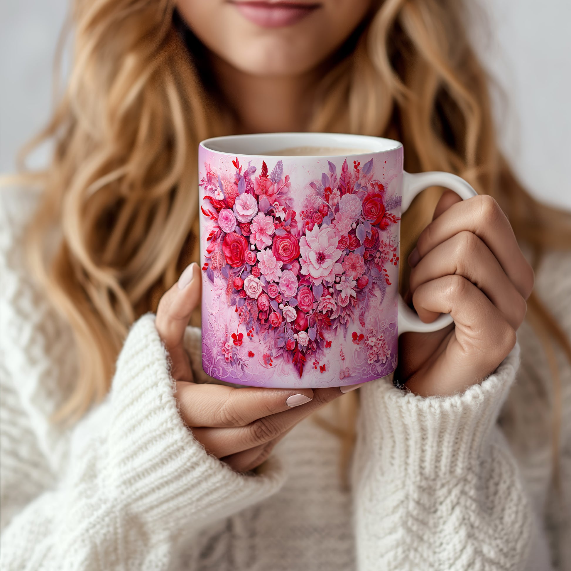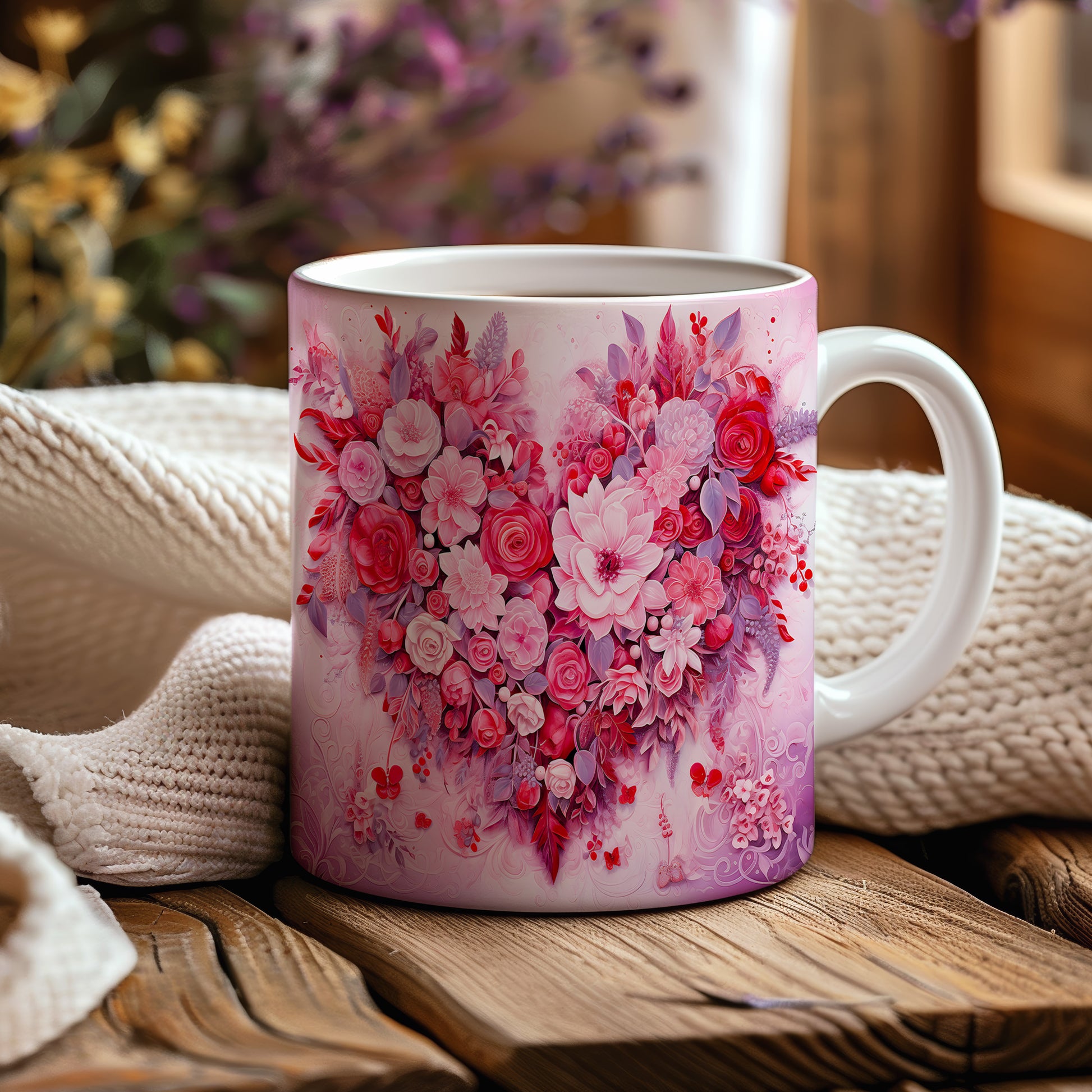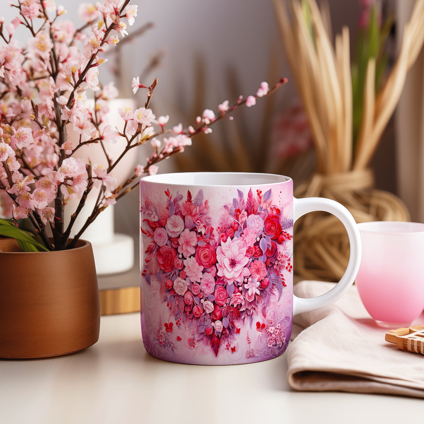 Objevte kouzlo romantiky s naším hrnkem, který zdobí srdce tvořené květinami v jemných růžových odstínech. Ideální pro zamilované chvíle a každodenní radost.