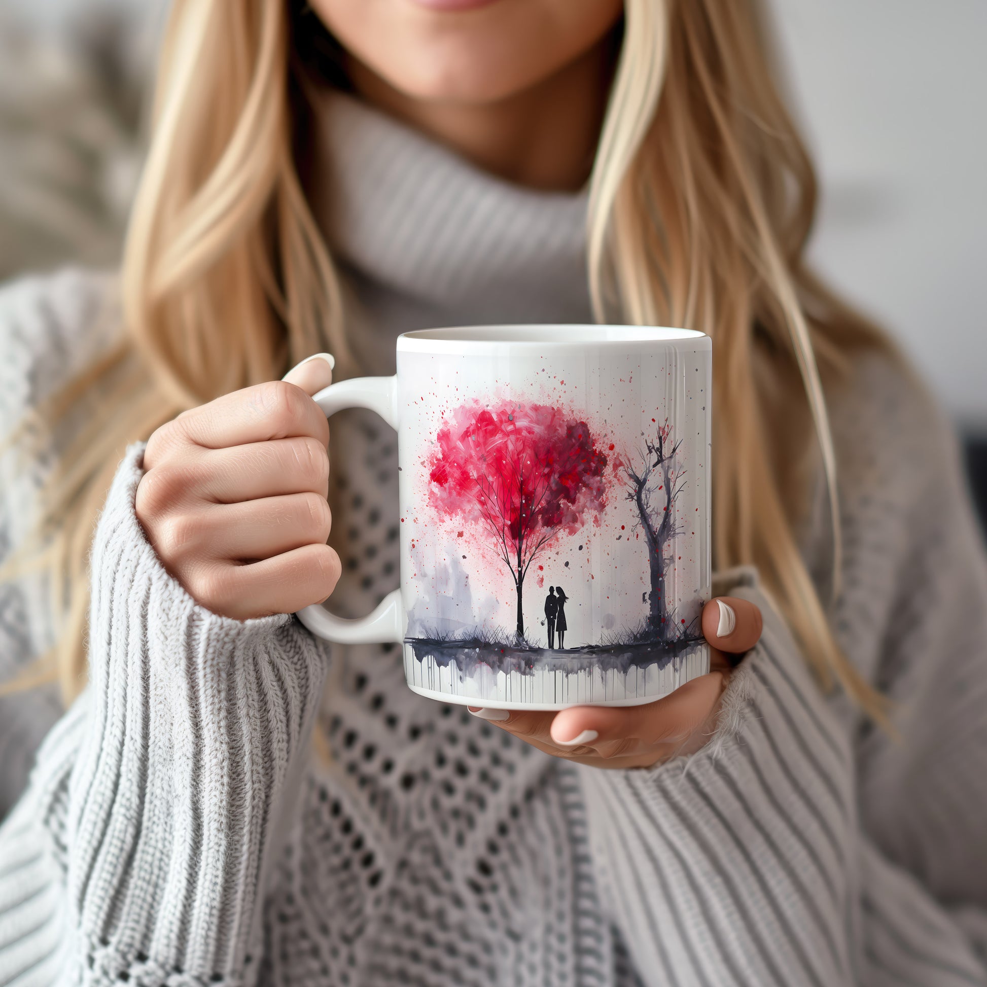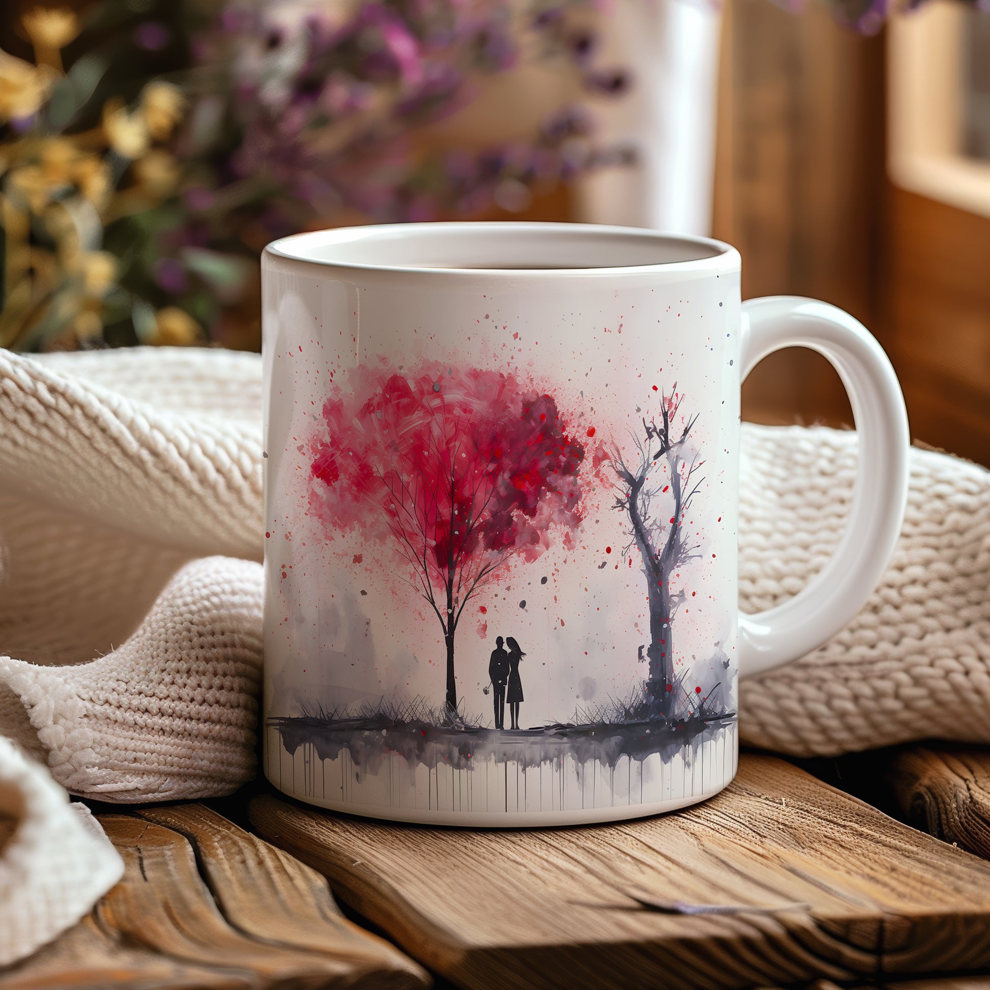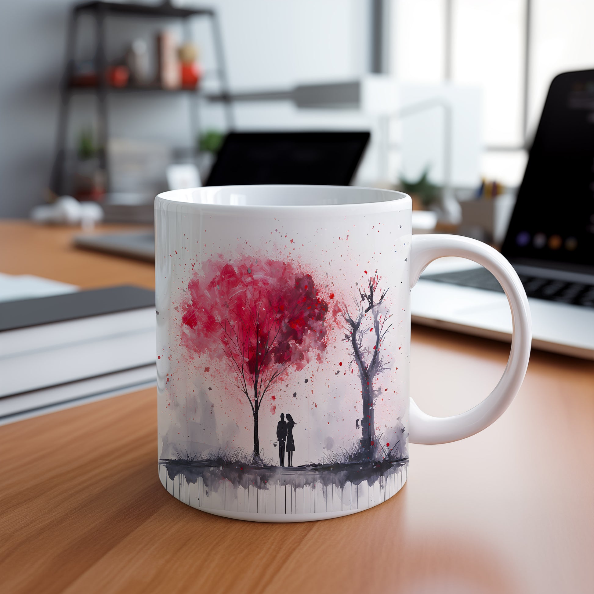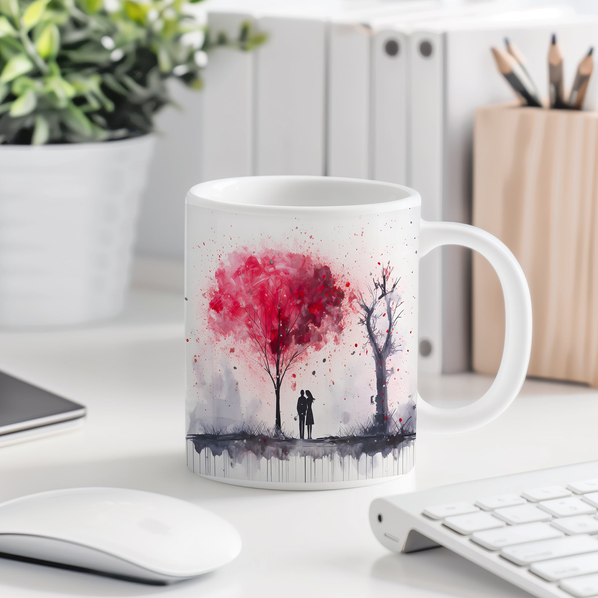 Objevte romantiku každého dne s hrnkem, který zachycuje nádherný červený strom a siluetu dvojice. Perfektní pro chvíle, kdy chcete snít a relaxovat.