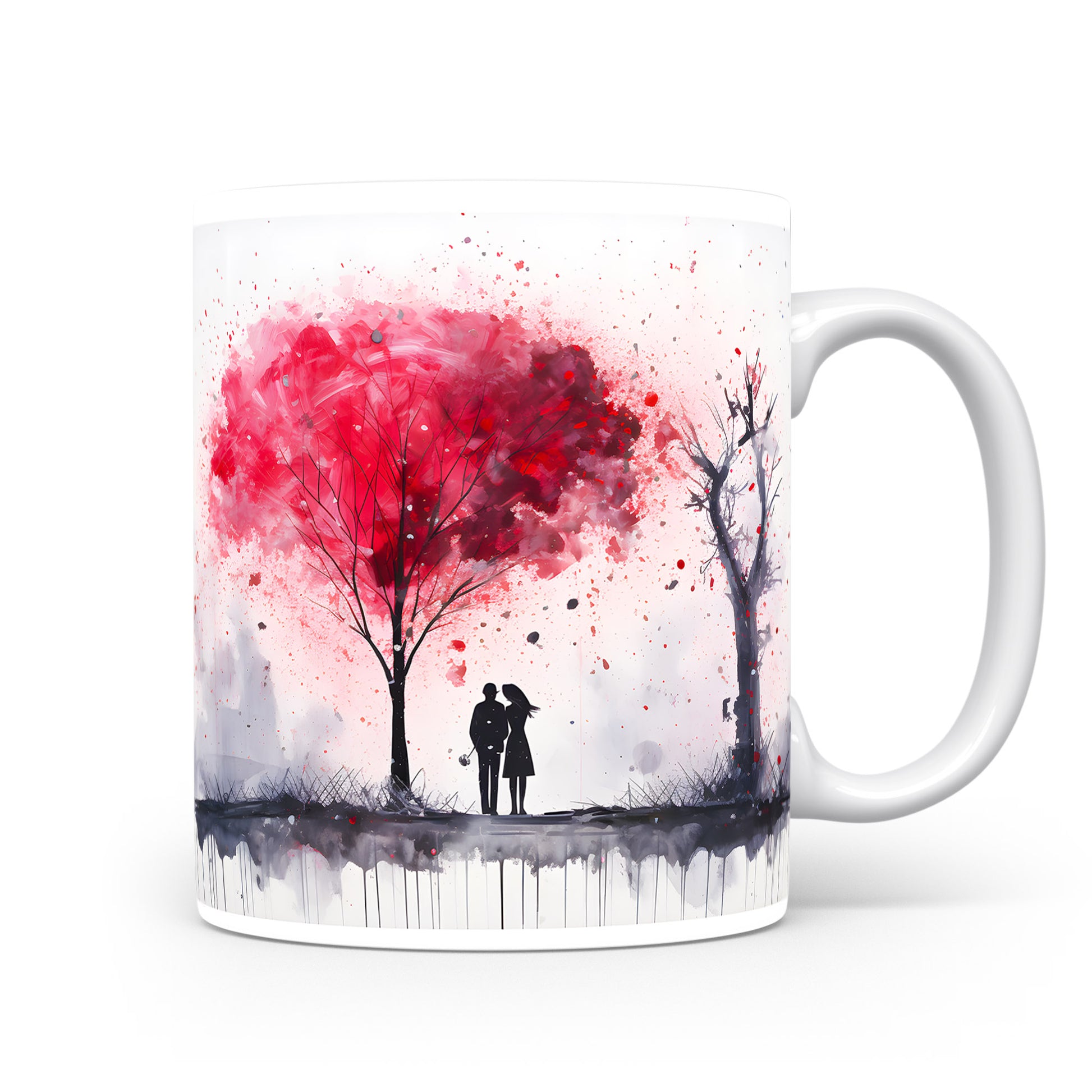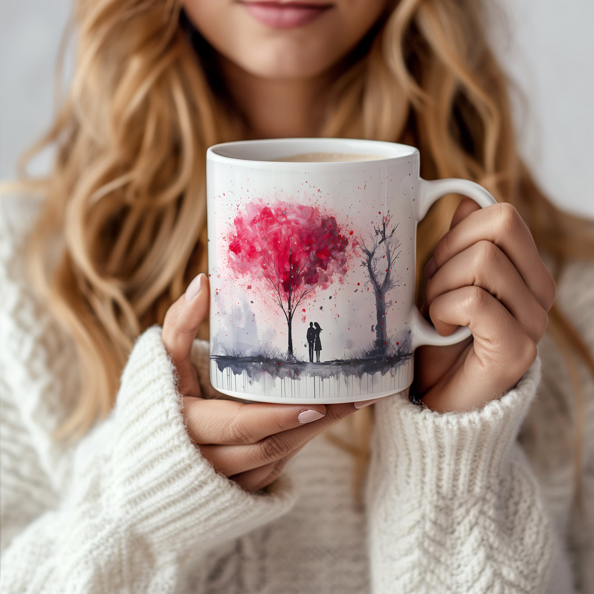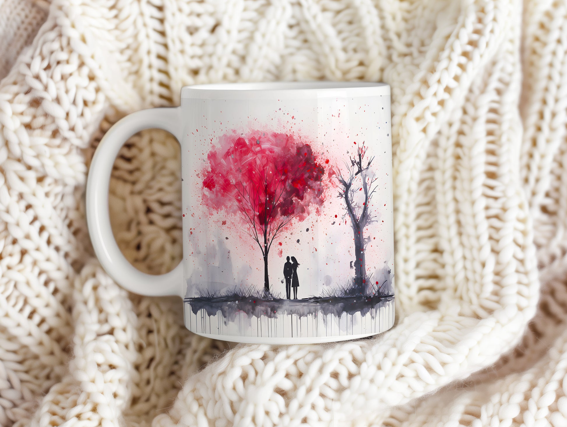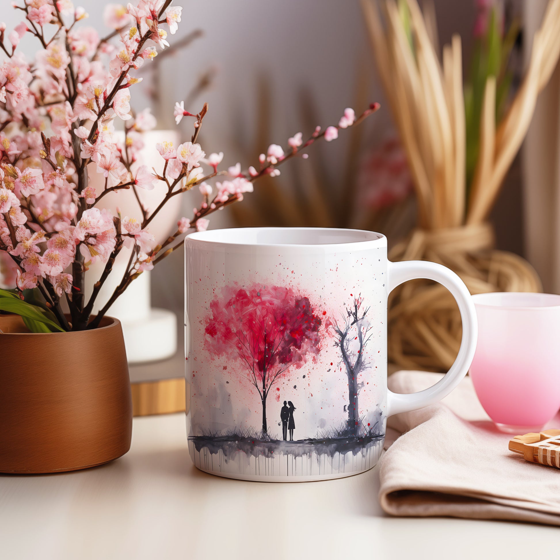 Objevte romantiku každého dne s hrnkem, který zachycuje nádherný červený strom a siluetu dvojice. Perfektní pro chvíle, kdy chcete snít a relaxovat.