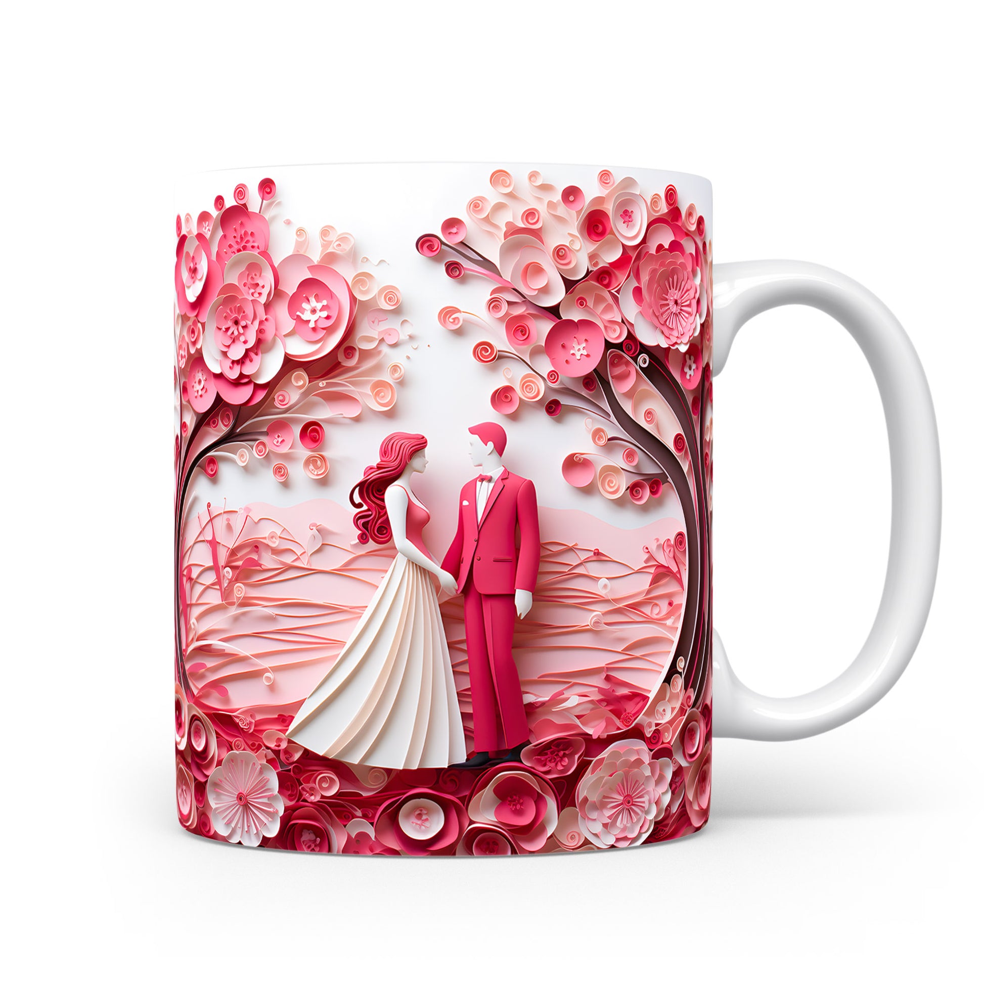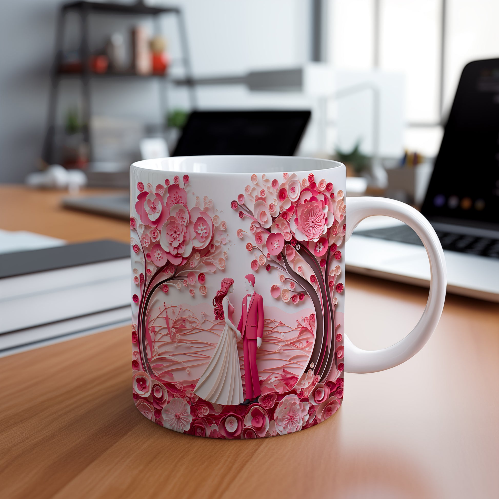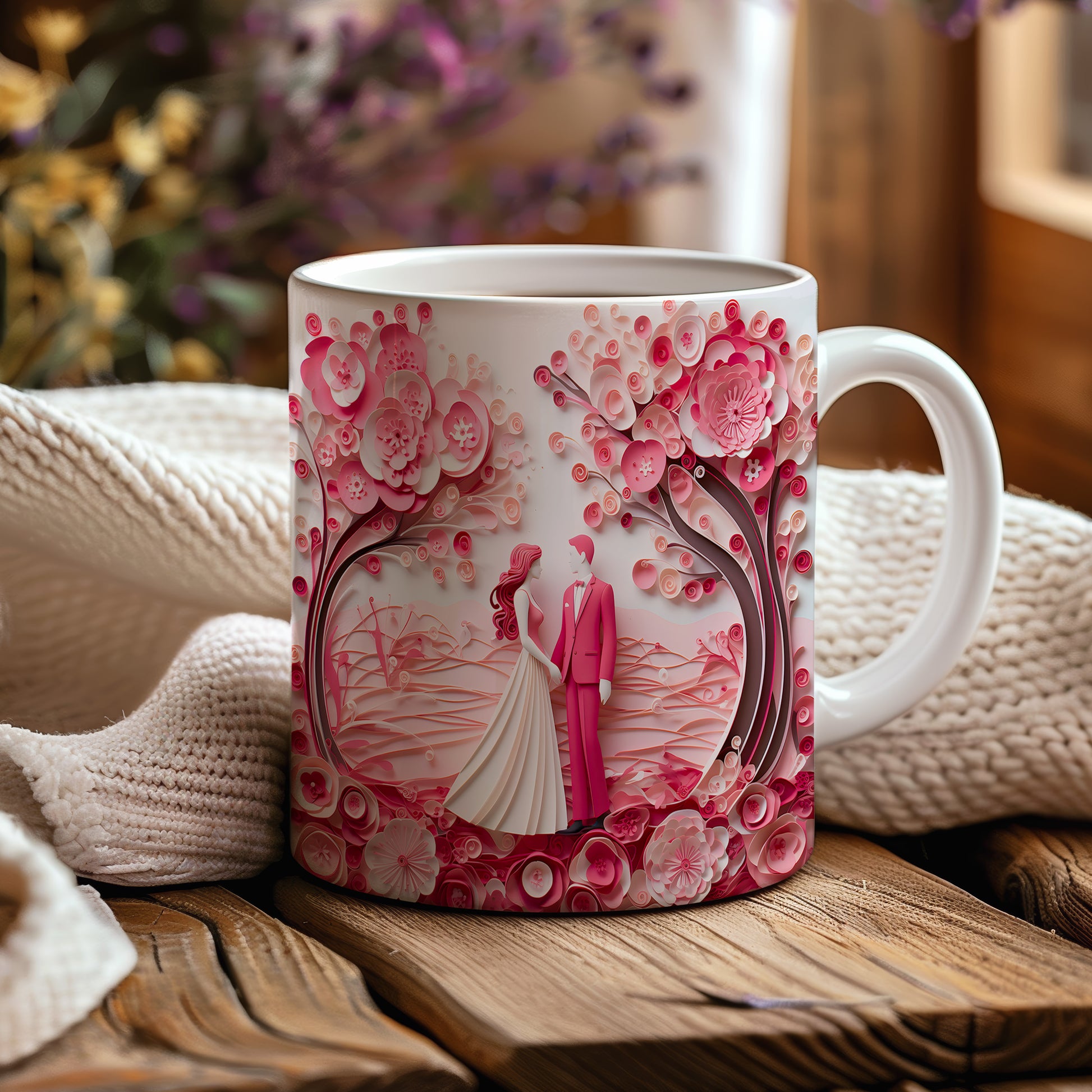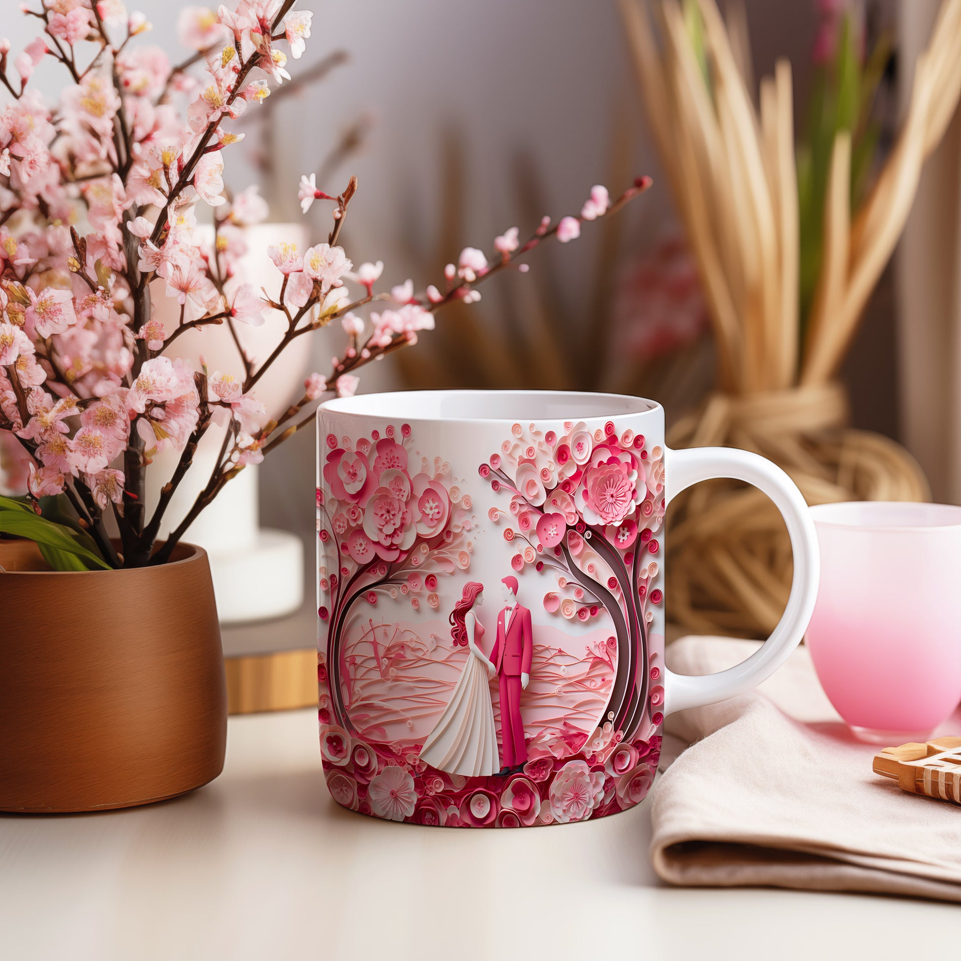 Objevte kouzlo romantiky s naším hrnkem, který zobrazuje pár pod rozkvetlými růžovými stromy. Ideální dárek pro zamilované, který každé ráno přinese vzpomínku na krásné chvíle.