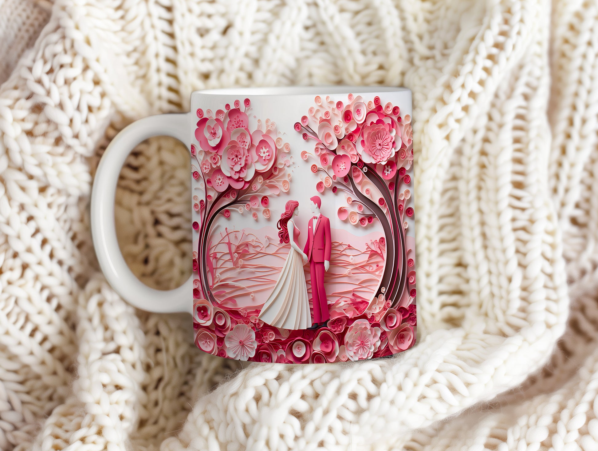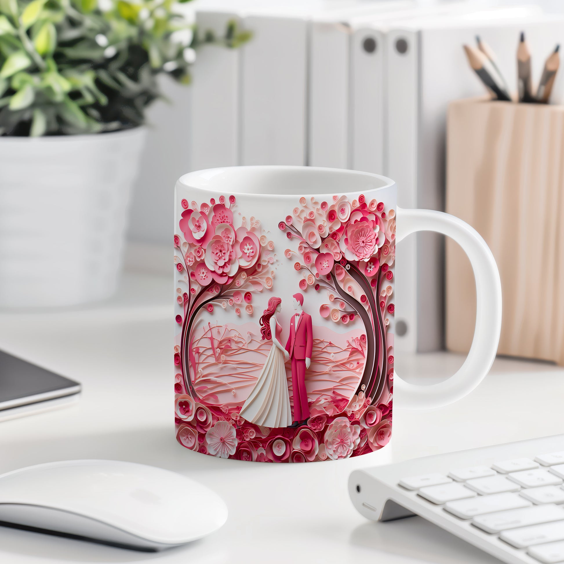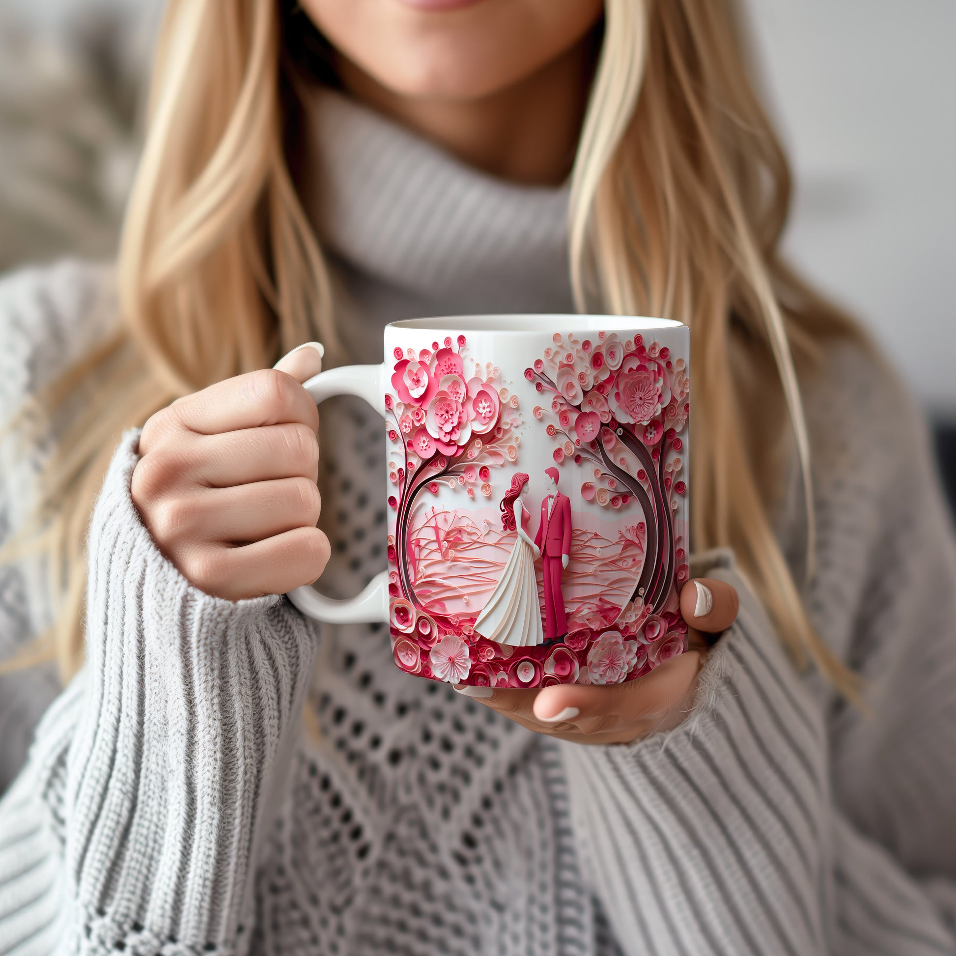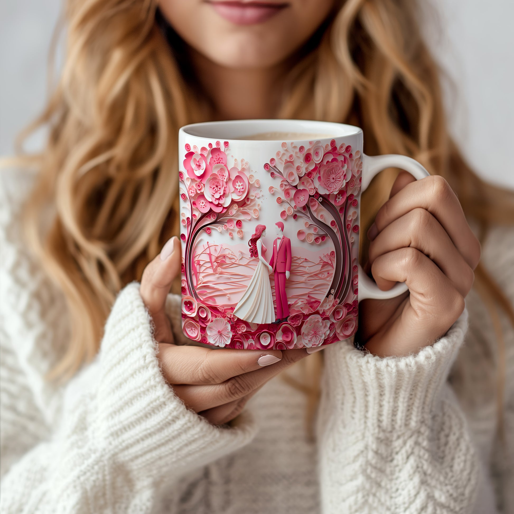 Objevte kouzlo romantiky s naším hrnkem, který zobrazuje pár pod rozkvetlými růžovými stromy. Ideální dárek pro zamilované, který každé ráno přinese vzpomínku na krásné chvíle.