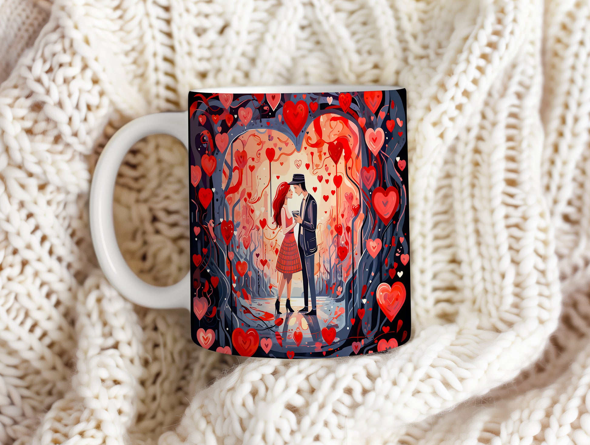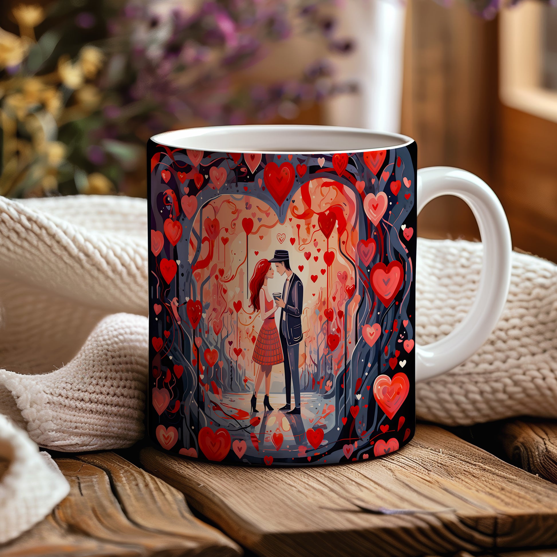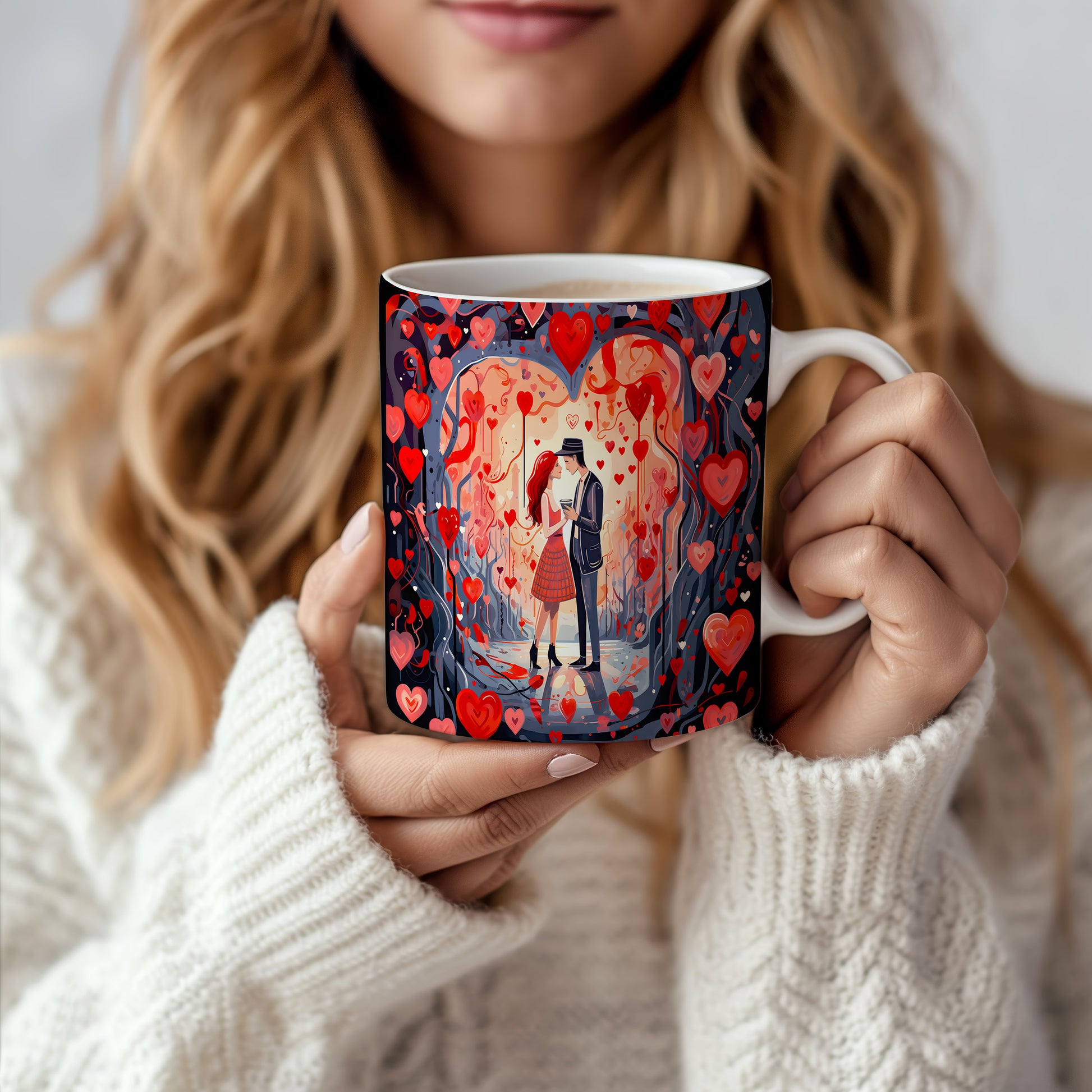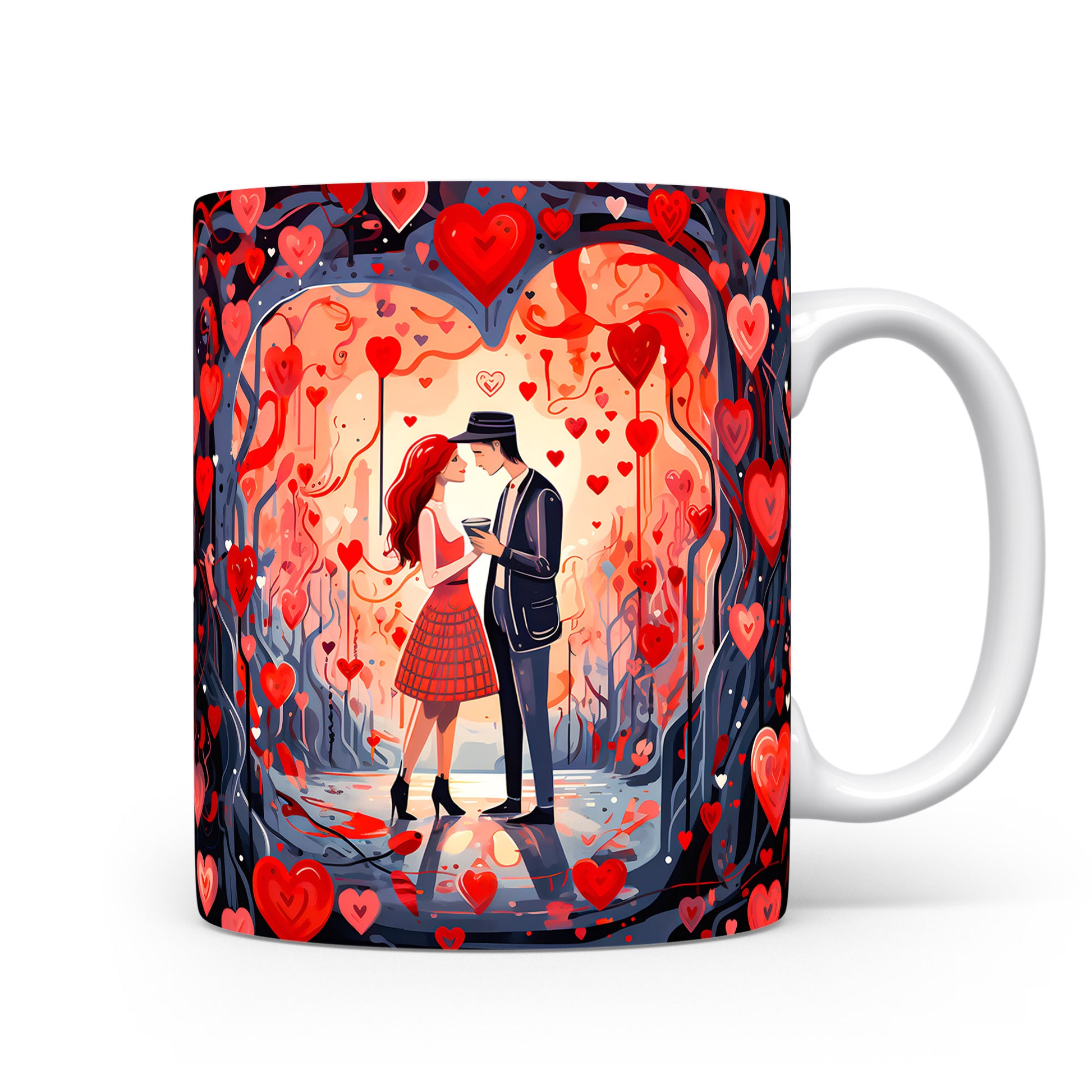 Objevte kouzlo lásky s naším hrnkem, který zobrazuje romantický pár obklopený srdíčky. Ideální dárek pro zamilované!