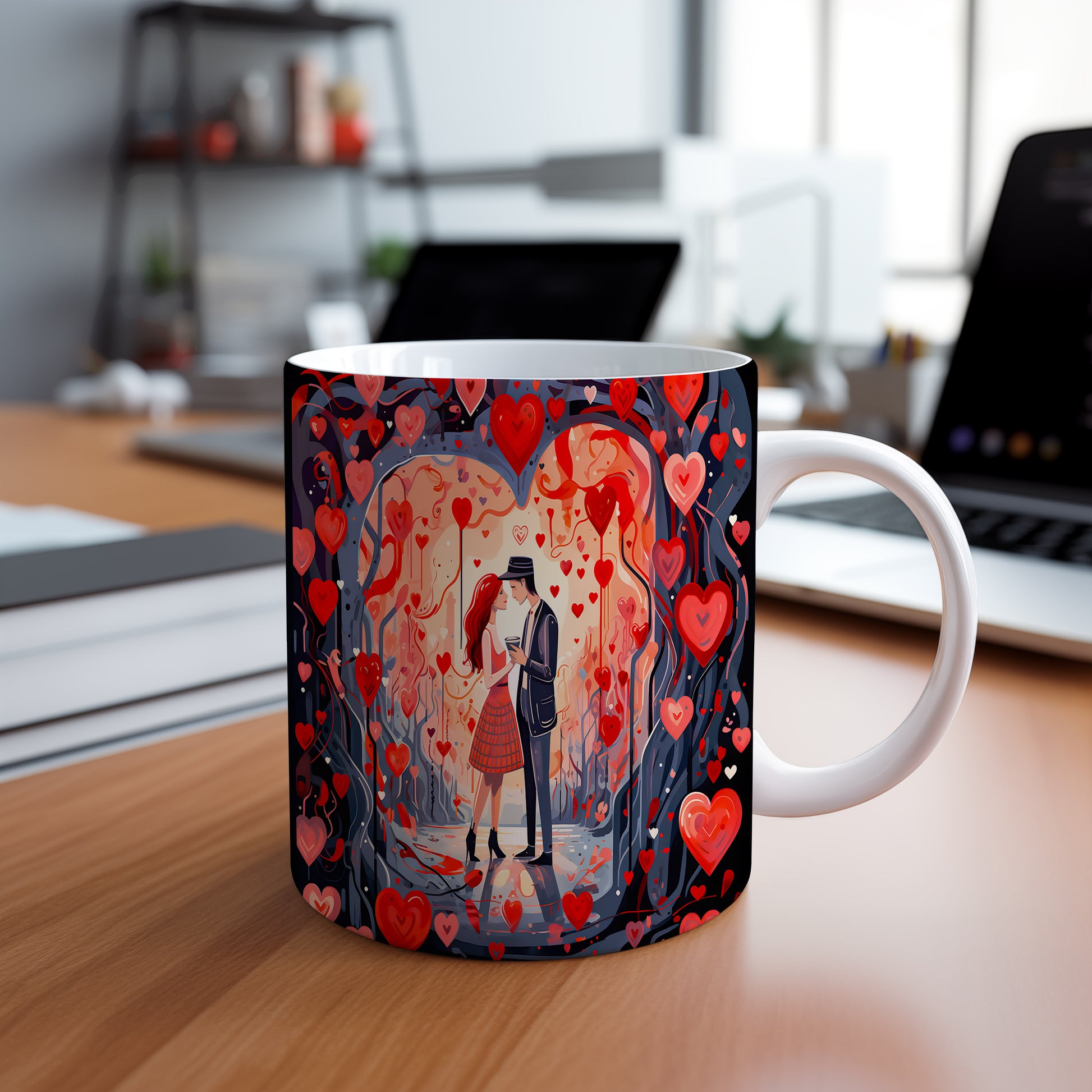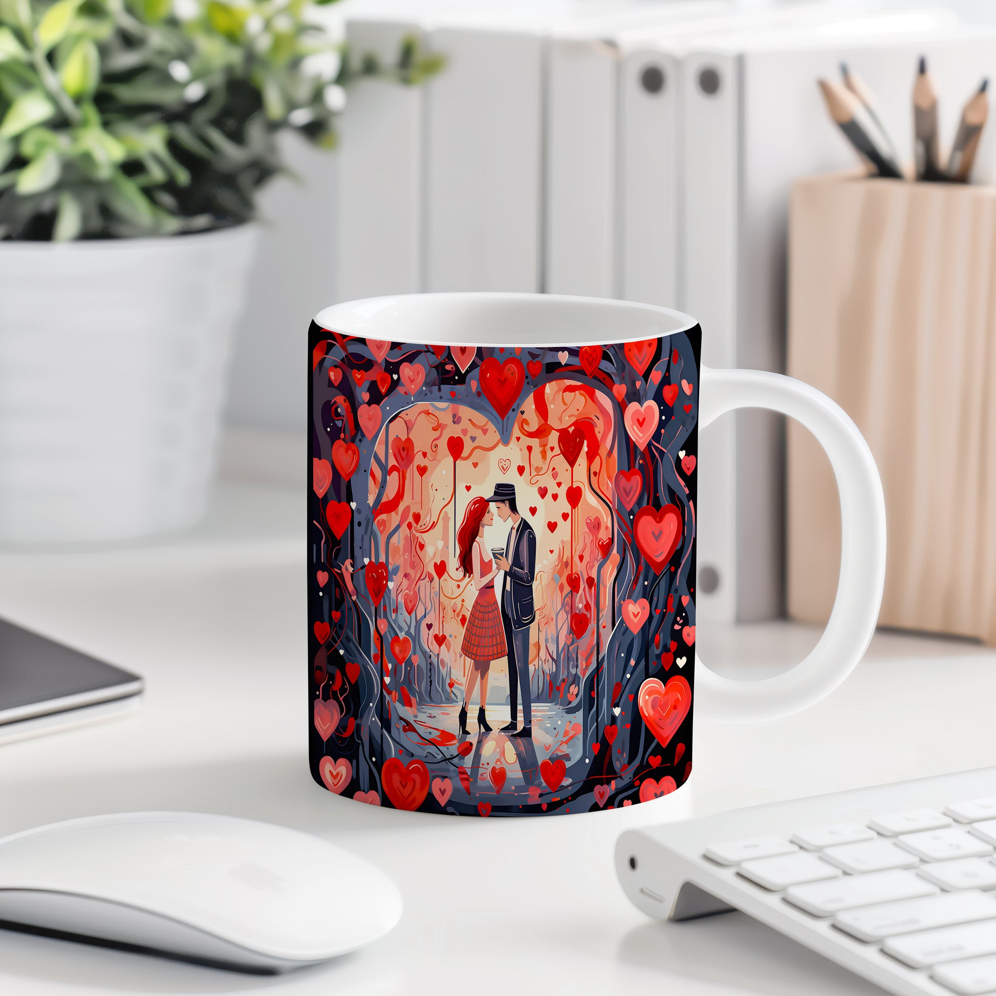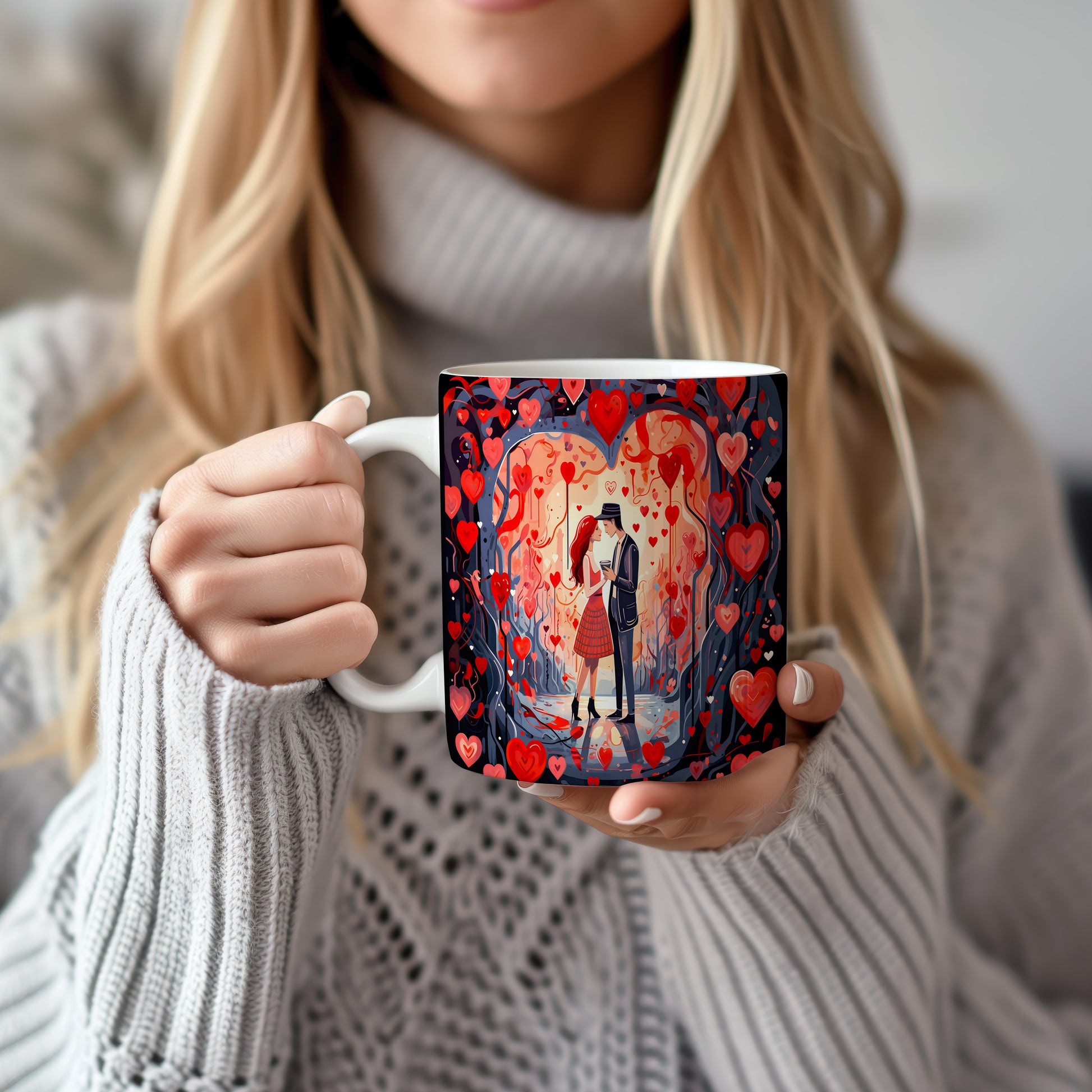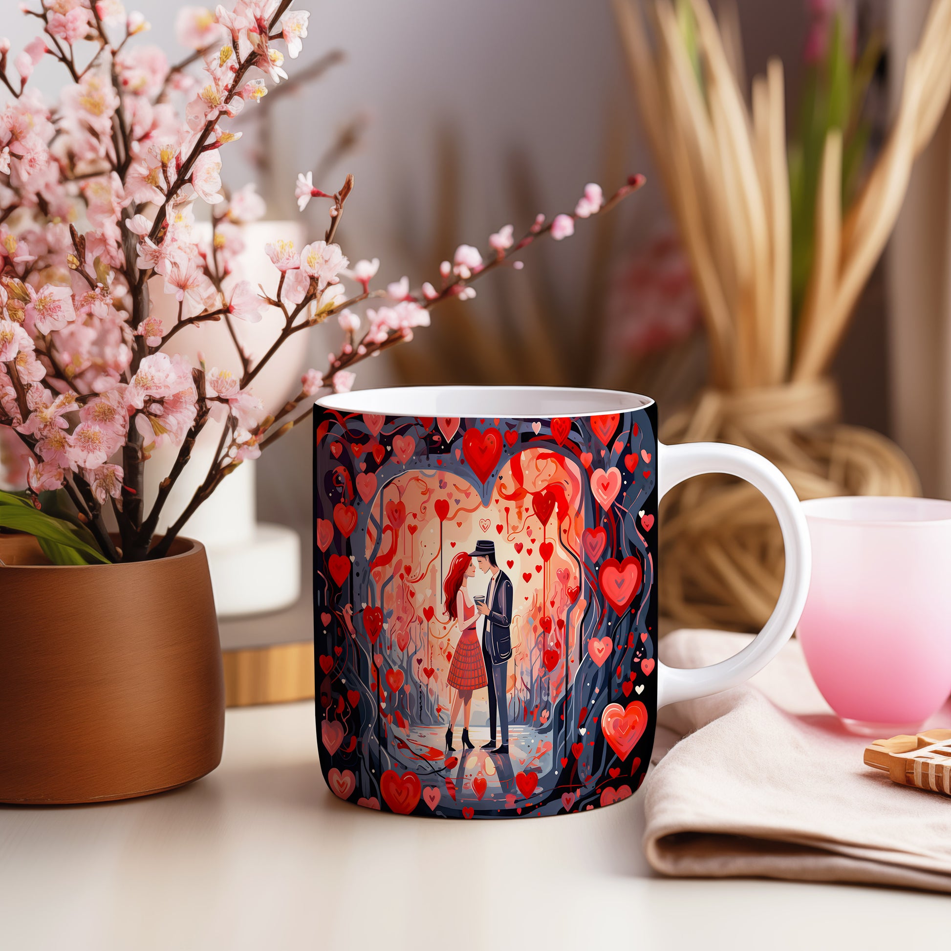 Objevte kouzlo lásky s naším hrnkem, který zobrazuje romantický pár obklopený srdíčky. Ideální dárek pro zamilované!