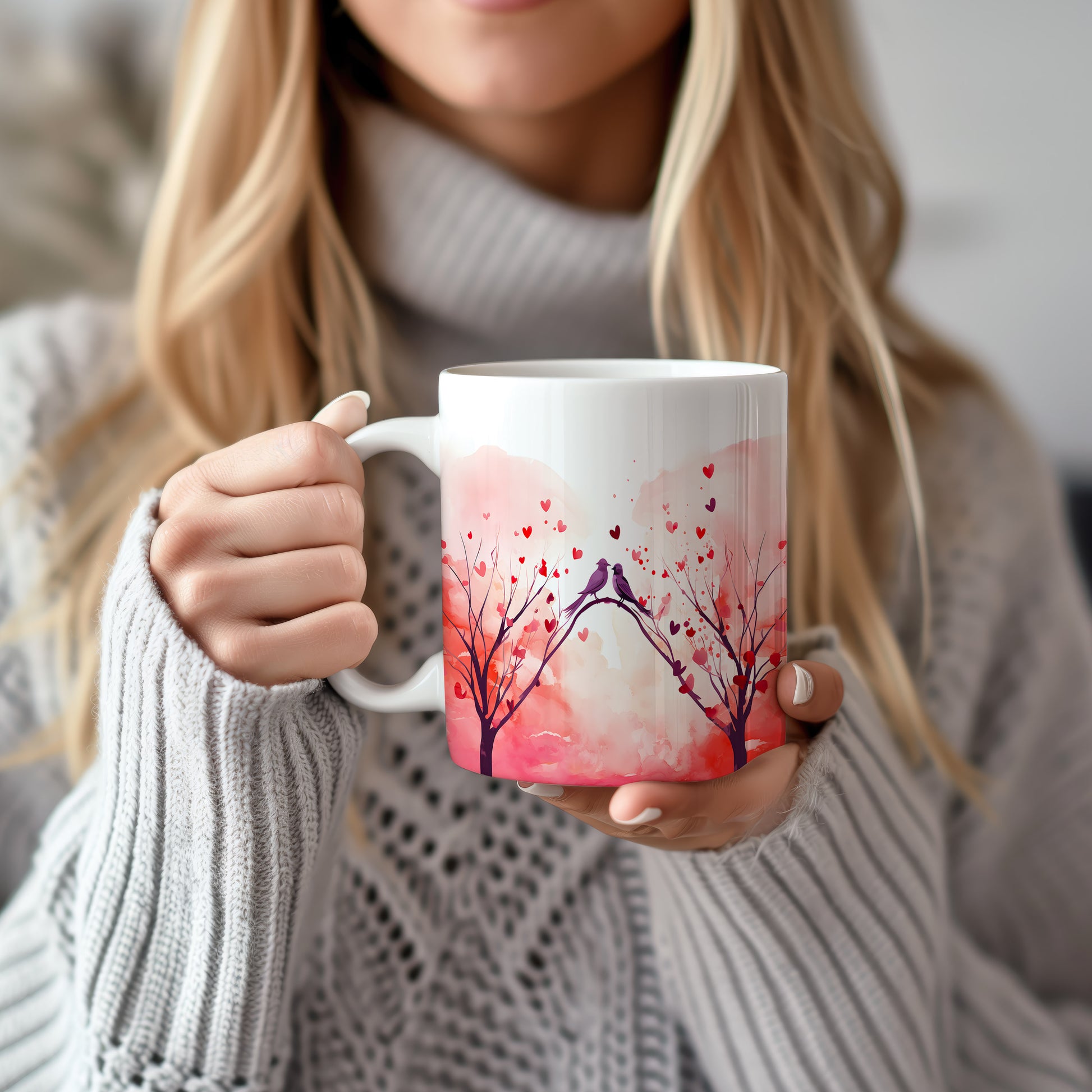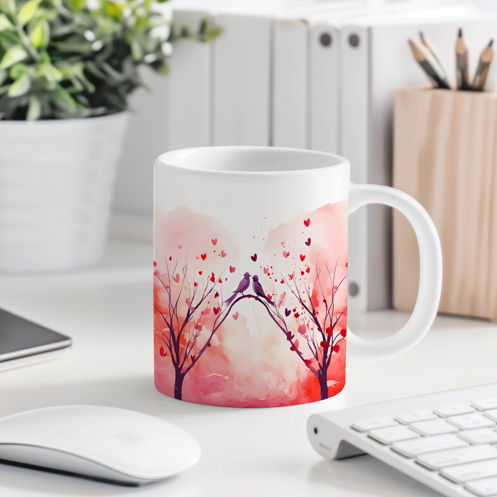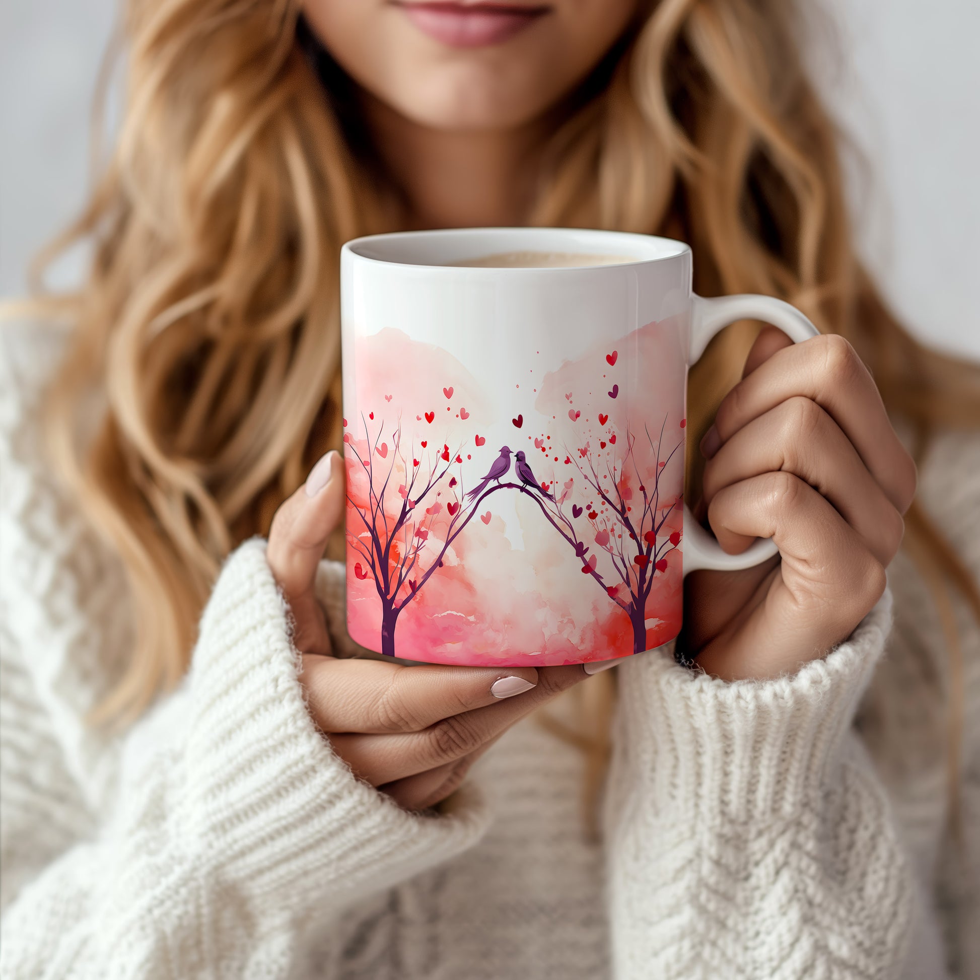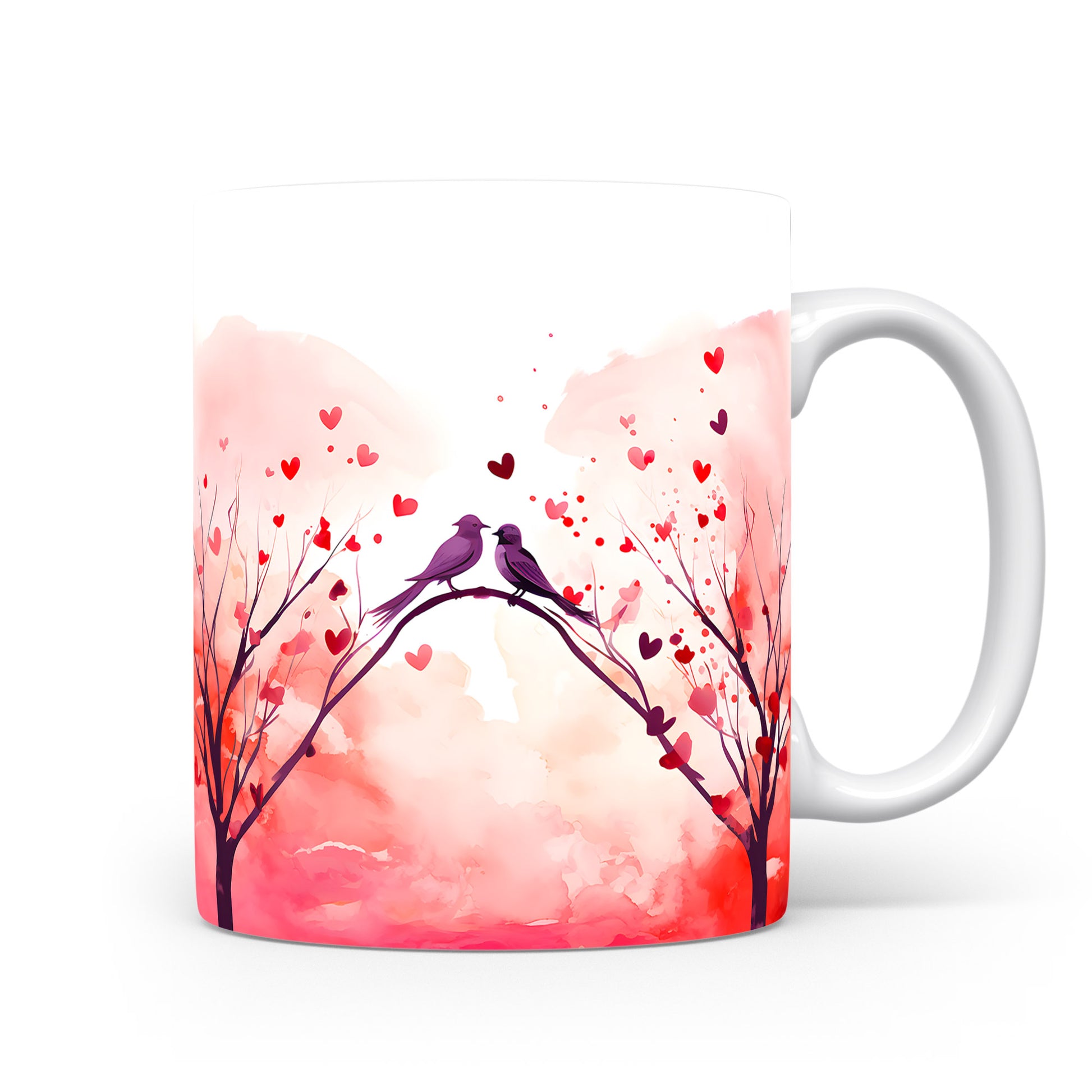 Vychutnejte si svůj oblíbený nápoj z hrnku, který zahřeje nejen ruce, ale i srdce. Romantický motiv ptáčků na větvičkách s červenými srdíčky přinese do vašeho dne lásku a pohodu.