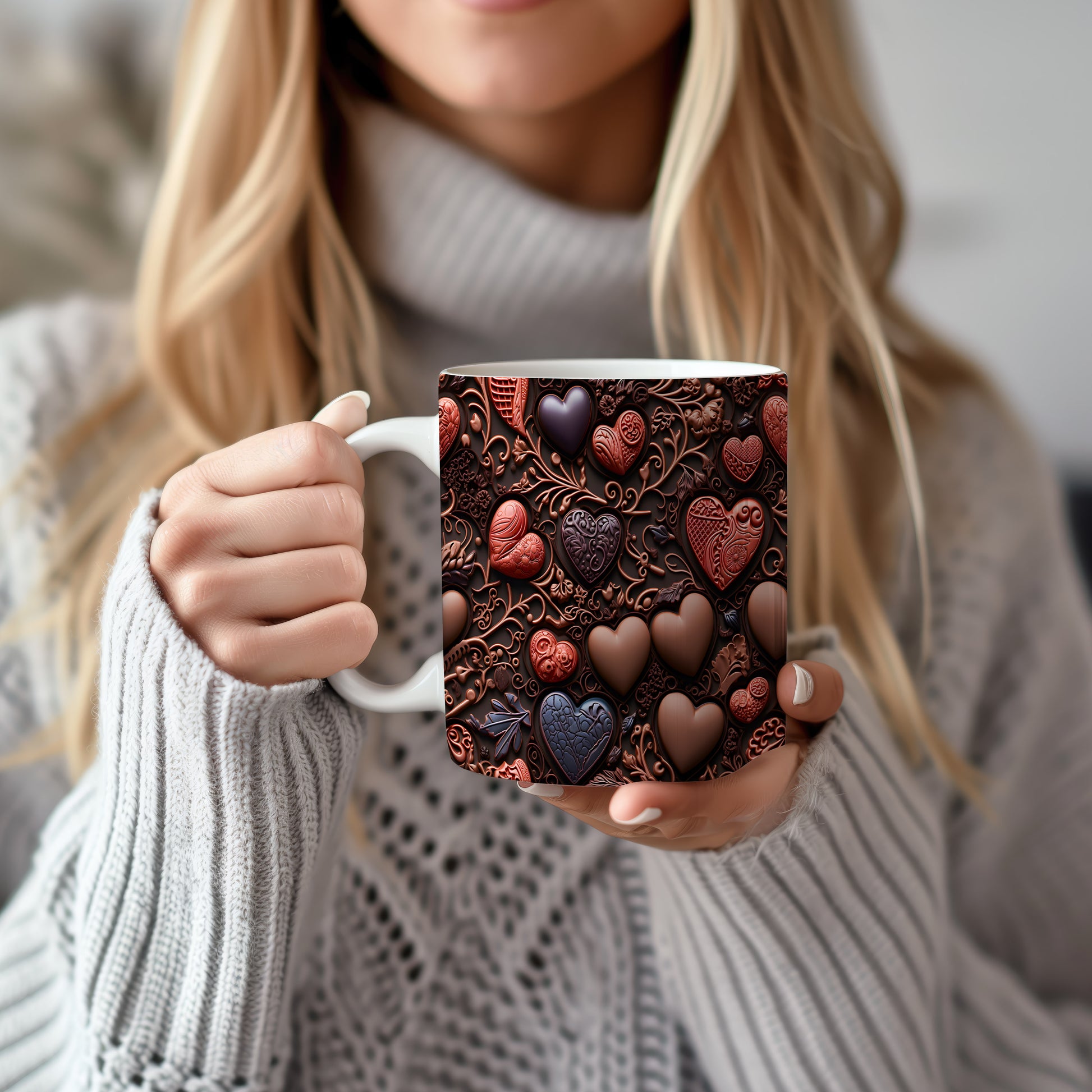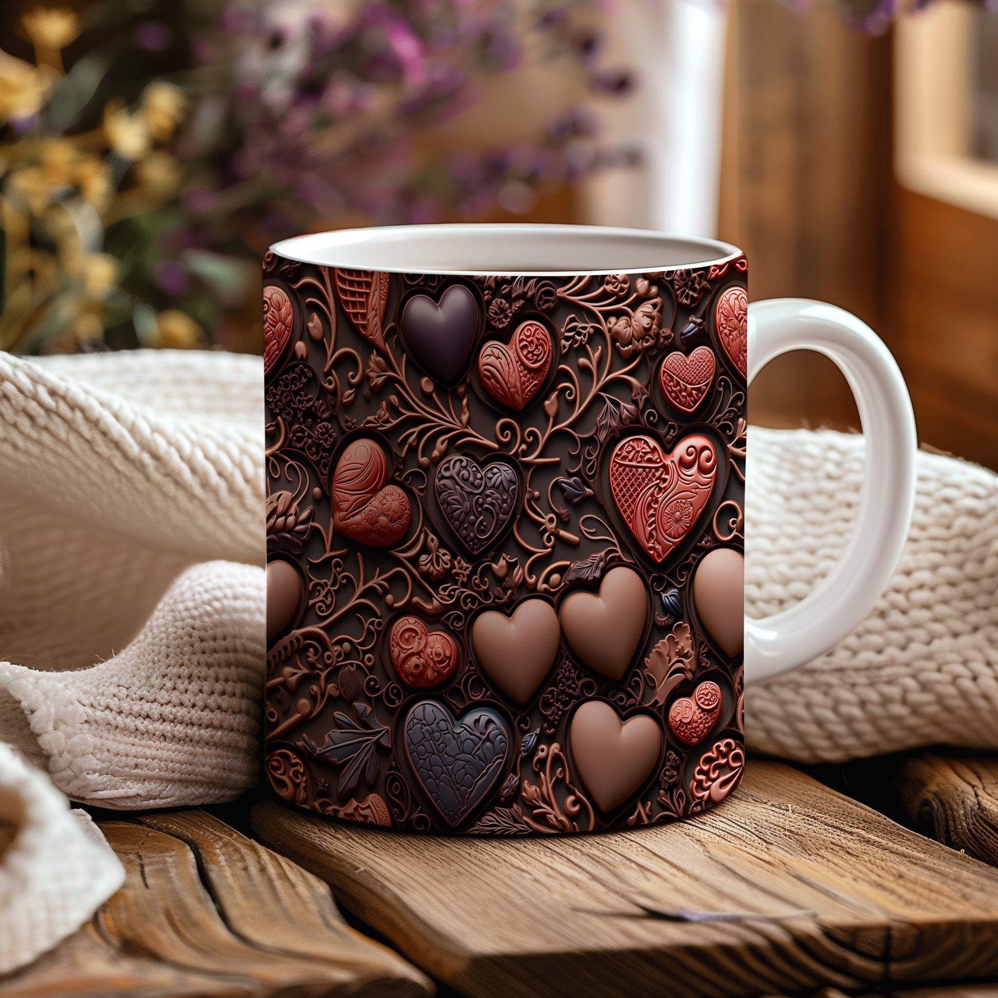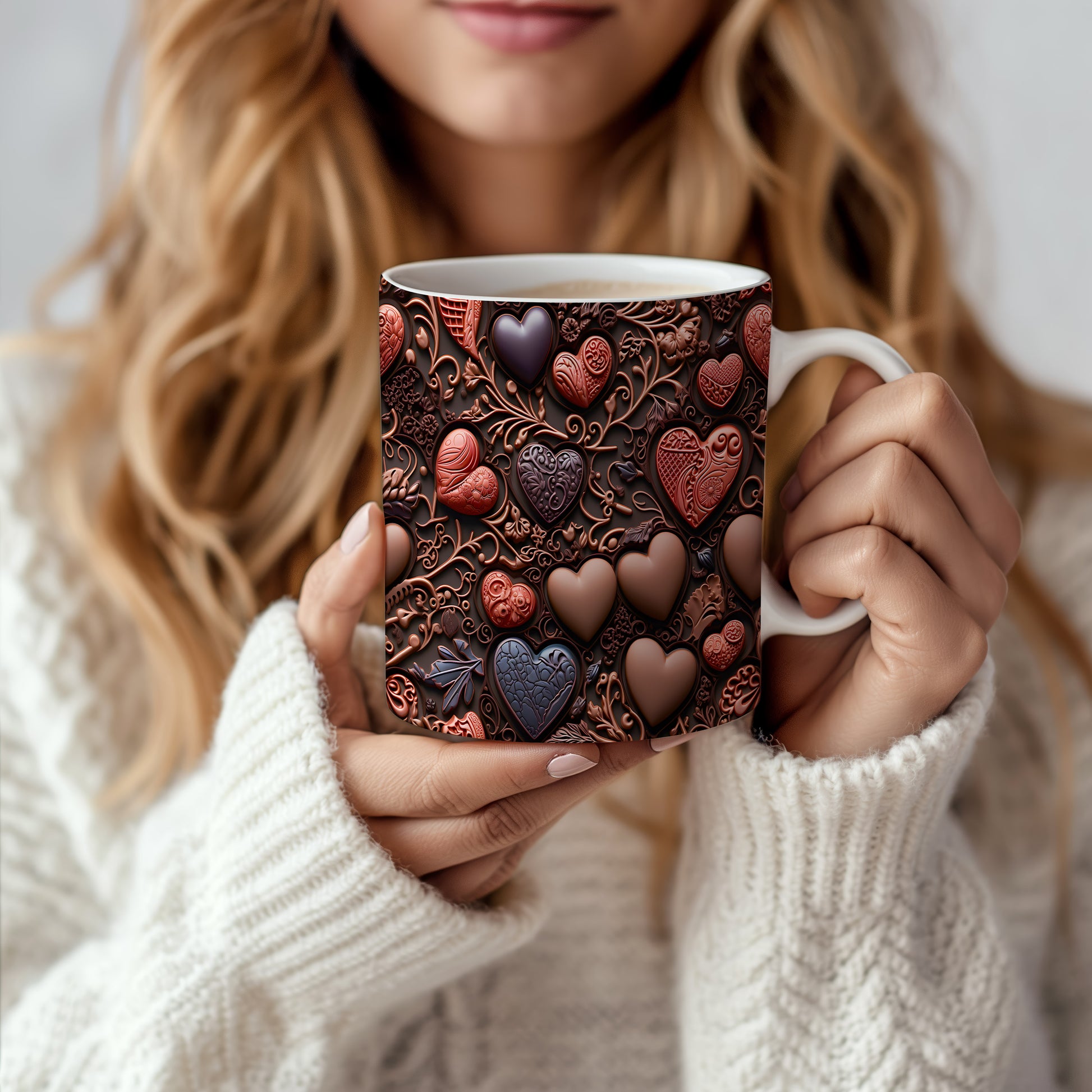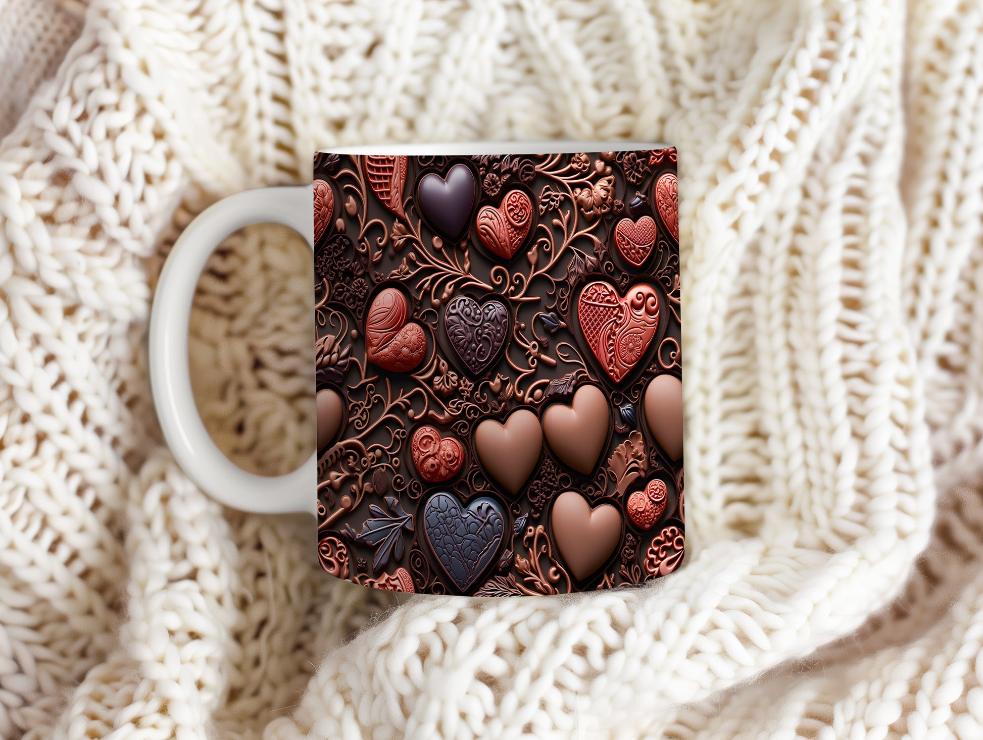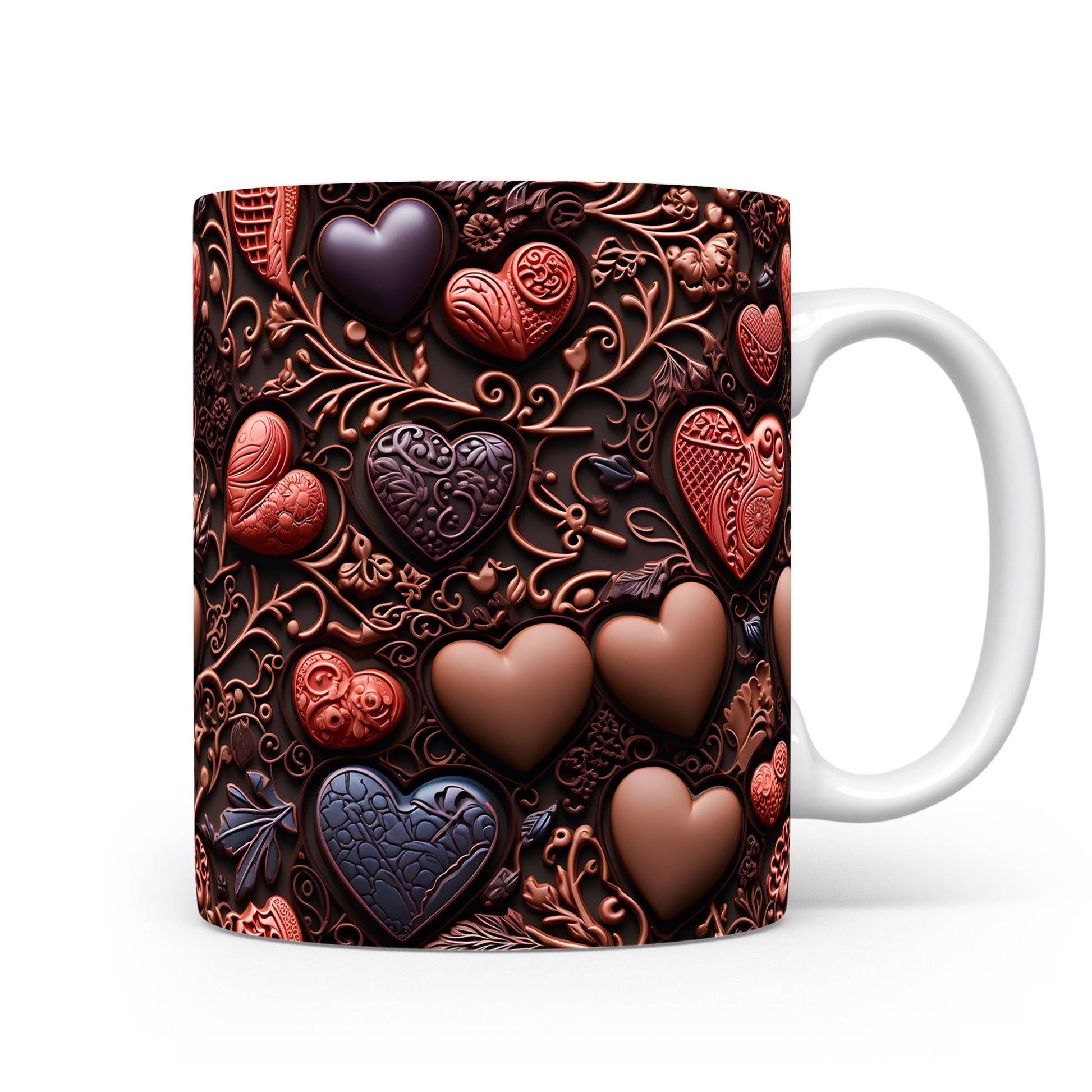 Objevte kouzlo romantiky s naším hrnkem, který je zdobený nádhernými srdci v čokoládových a rudých odstínech. Perfektní pro chvíle klidu a láskyplné okamžiky.