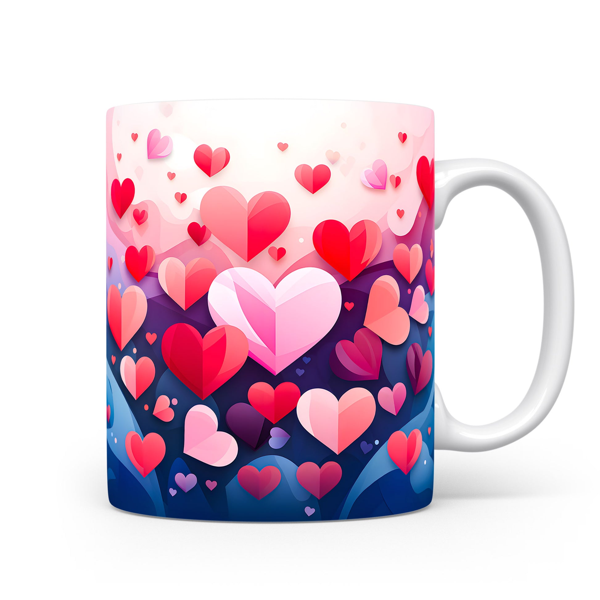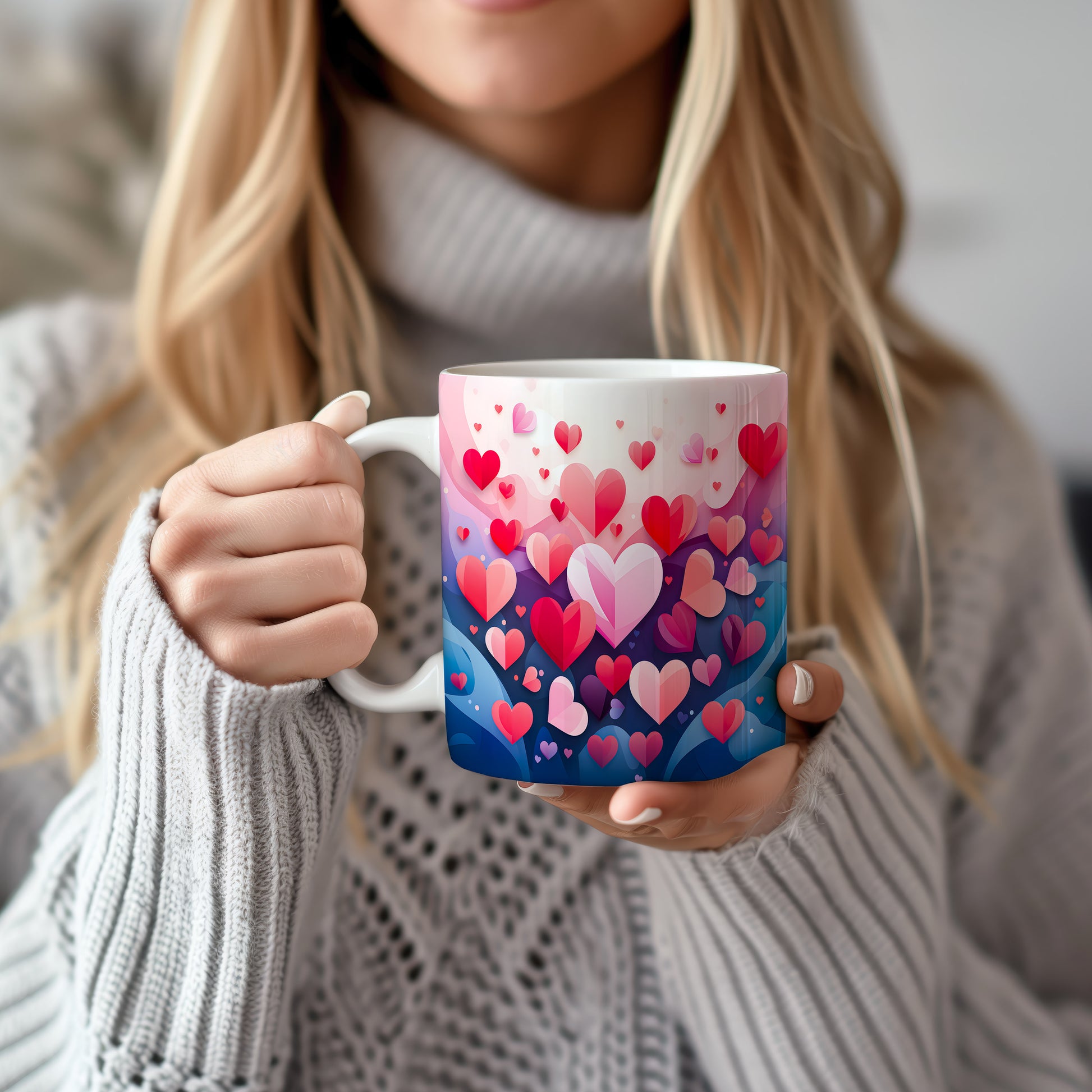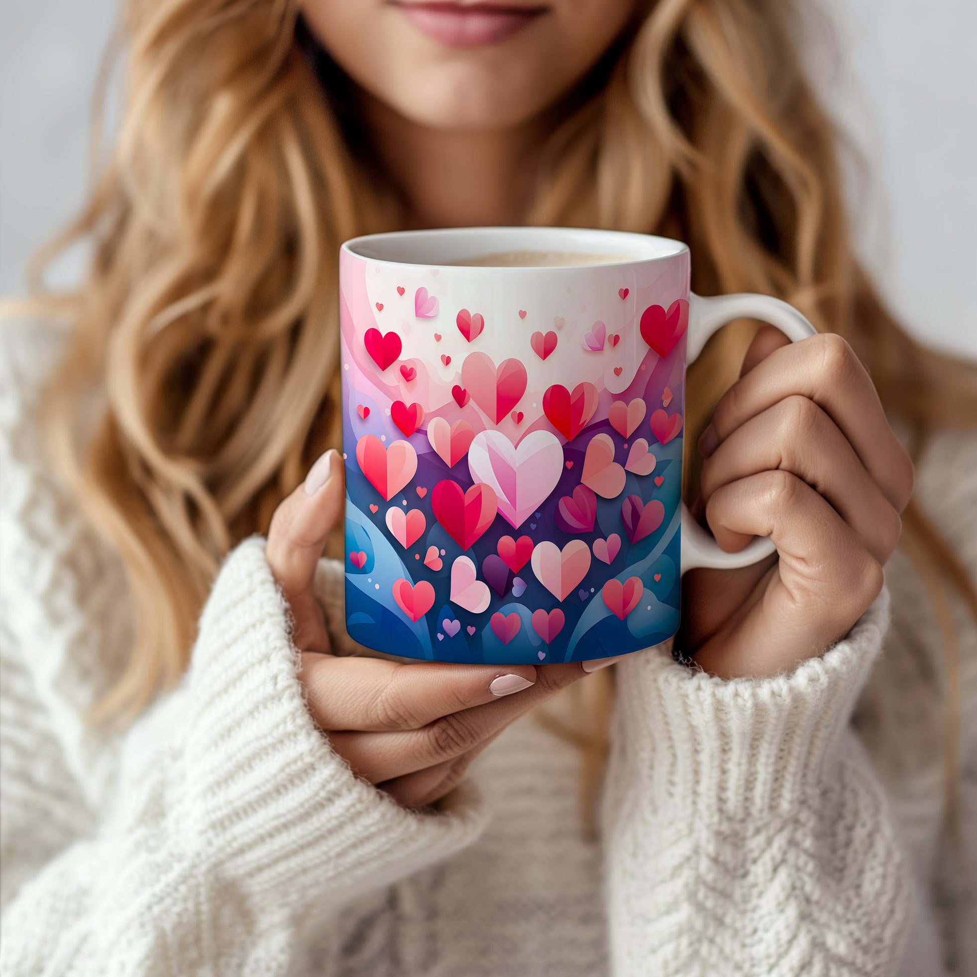 Hrnek s romantickým motivem srdcí v pastelových barvách