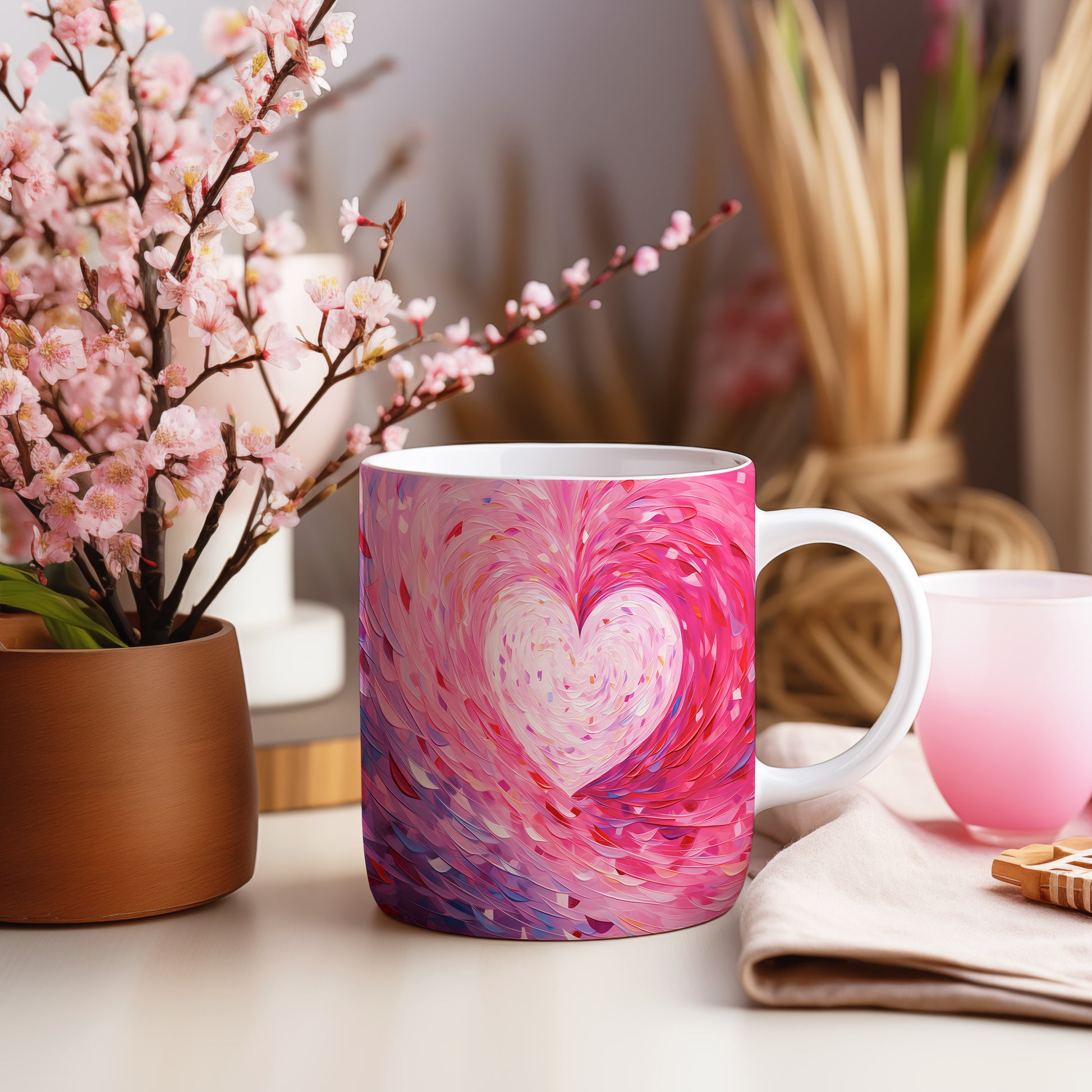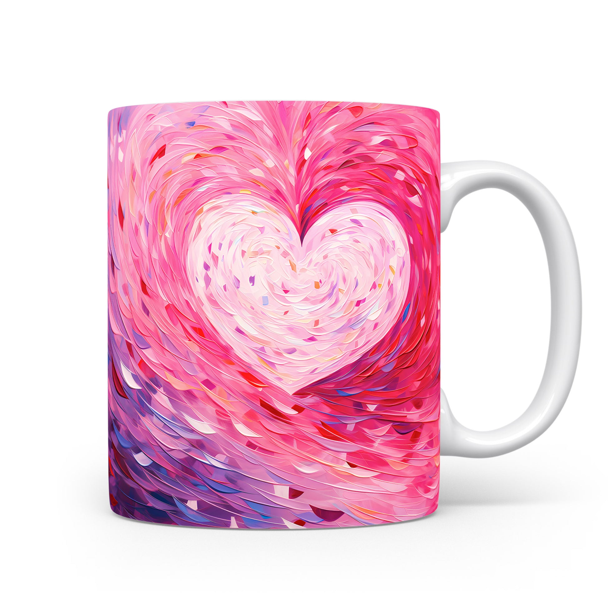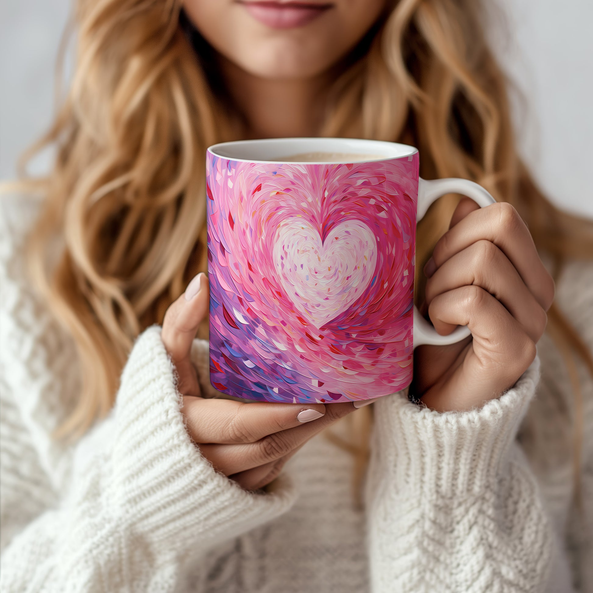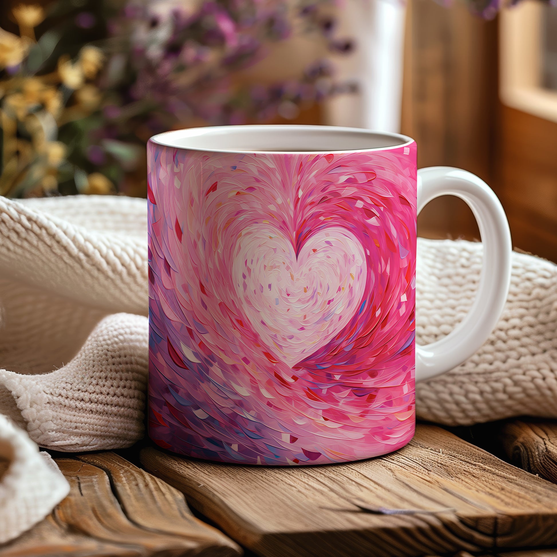 Objevte kouzlo romantiky s tímto hrnkem, který zdobí nádherné srdce v pestrých růžových odstínech. Ideální pro chvíle pohody a láskyplné okamžiky.