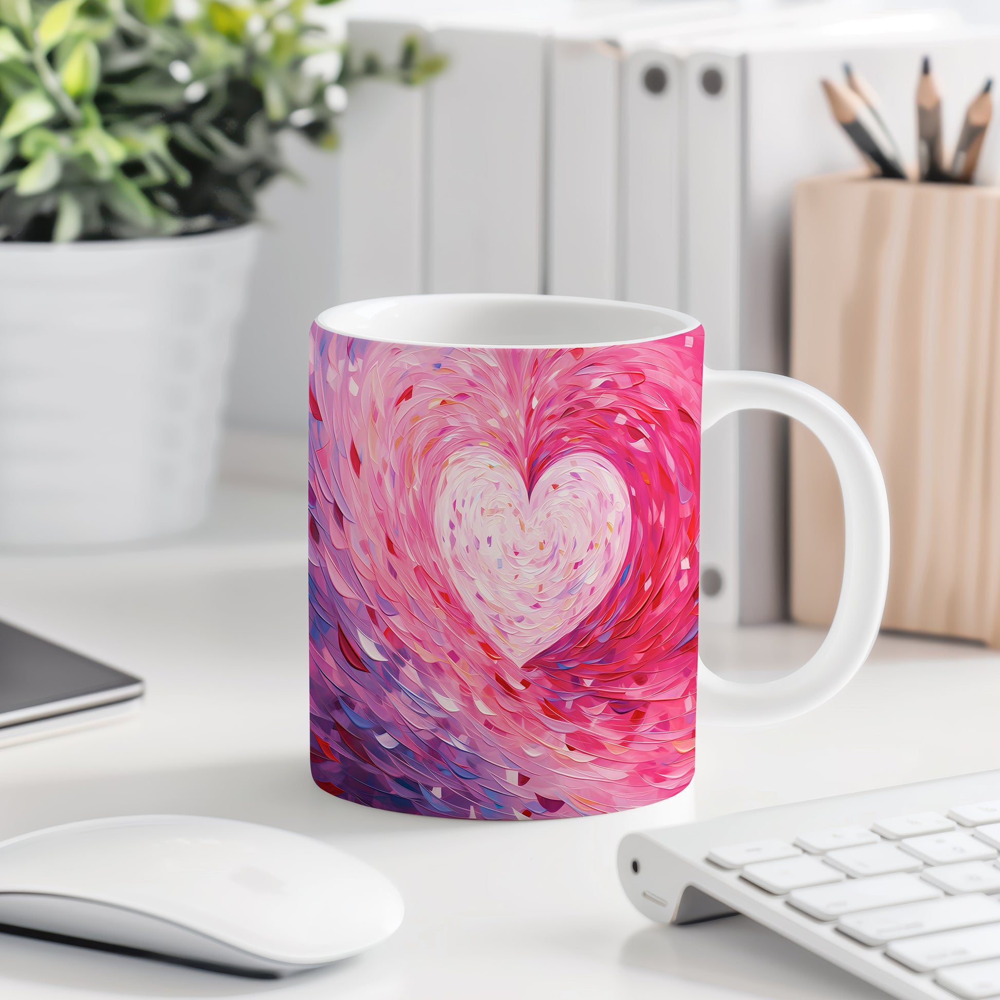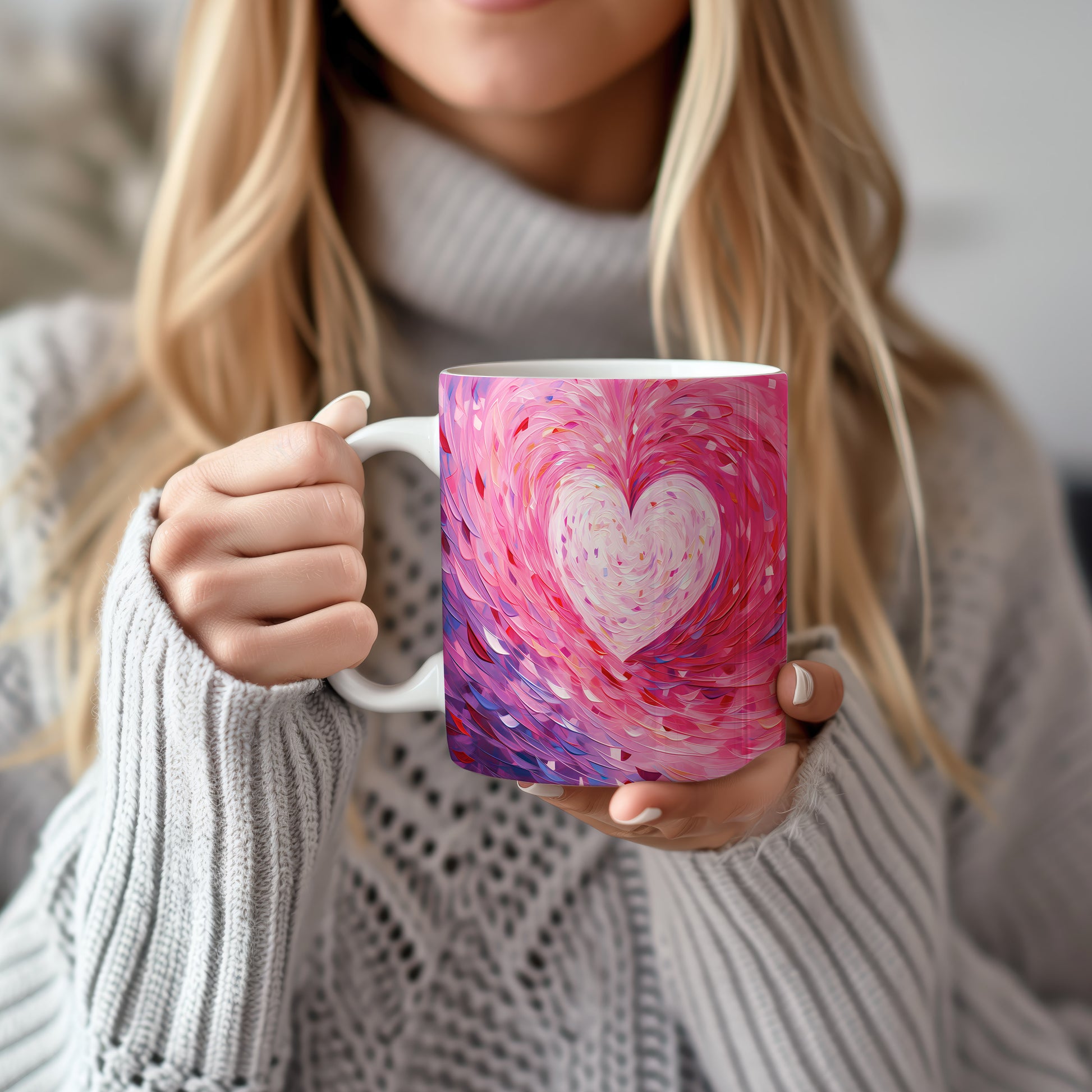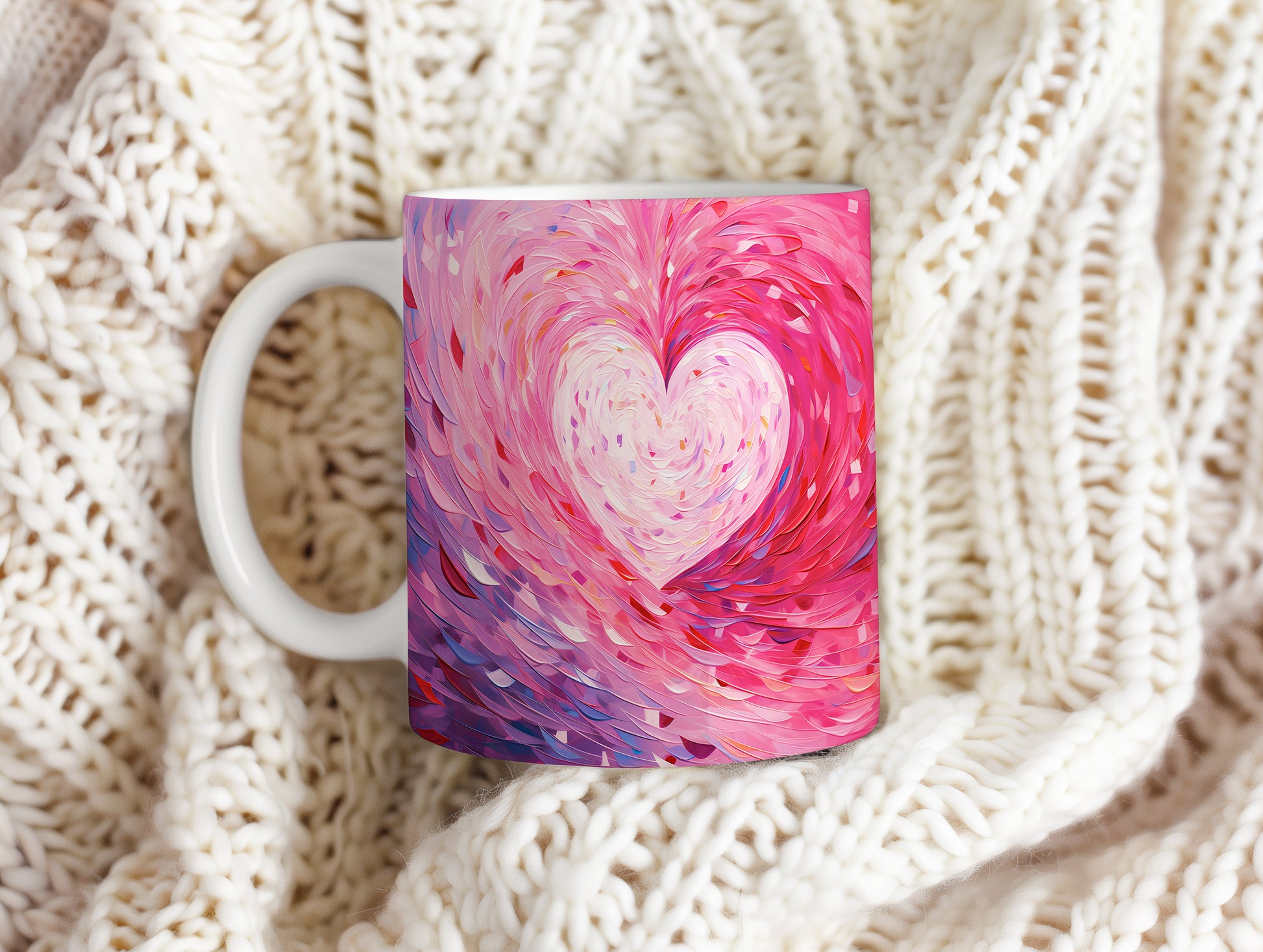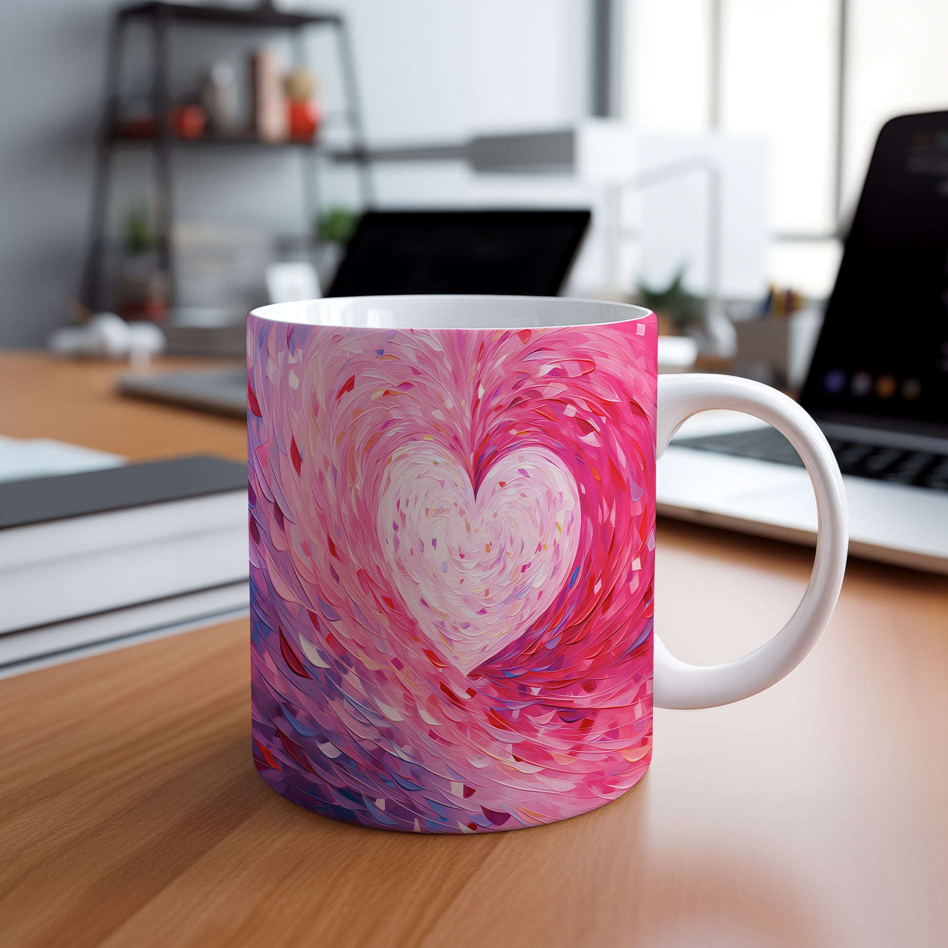 Objevte kouzlo romantiky s tímto hrnkem, který zdobí nádherné srdce v pestrých růžových odstínech. Ideální pro chvíle pohody a láskyplné okamžiky.