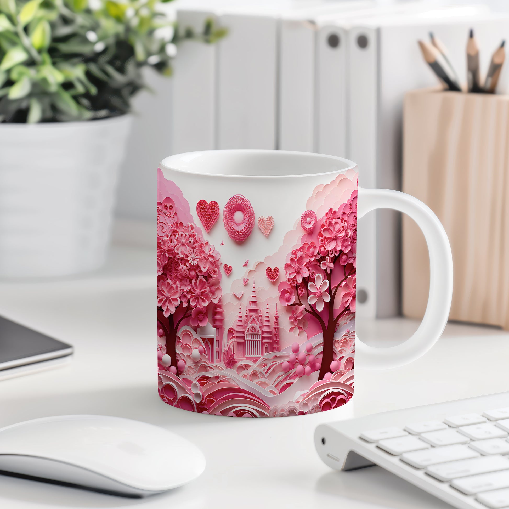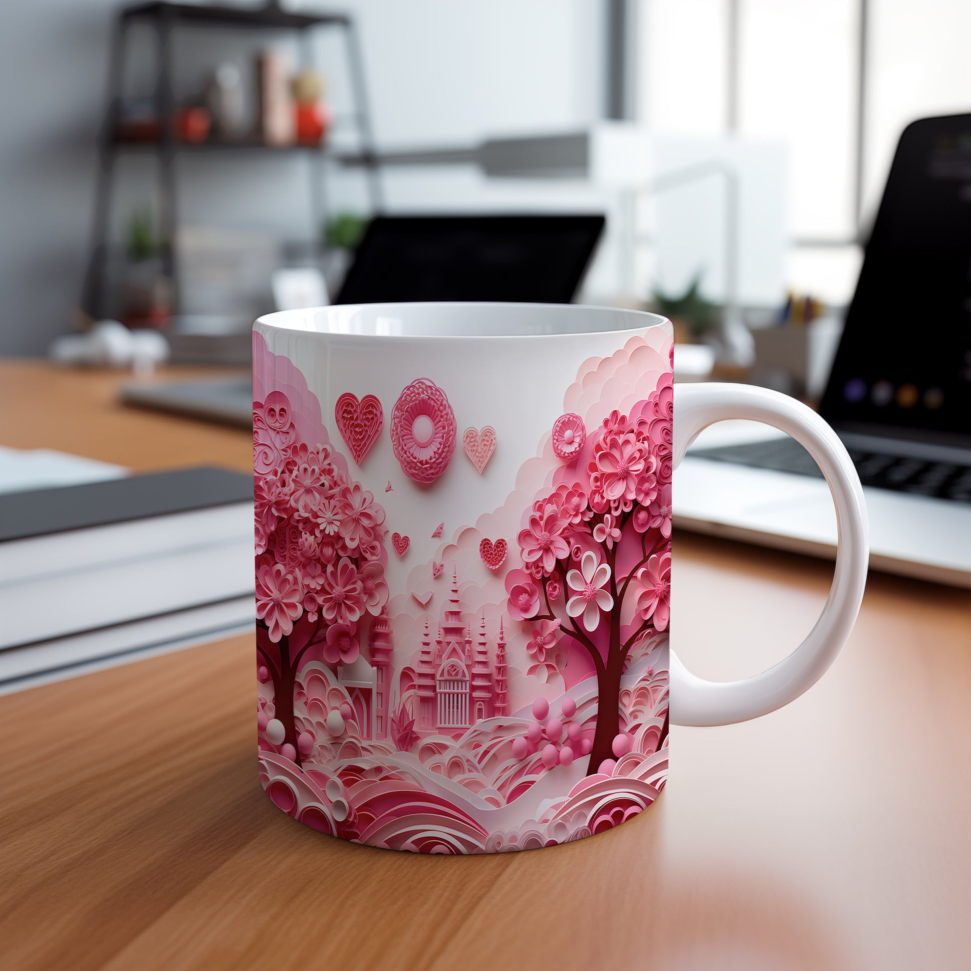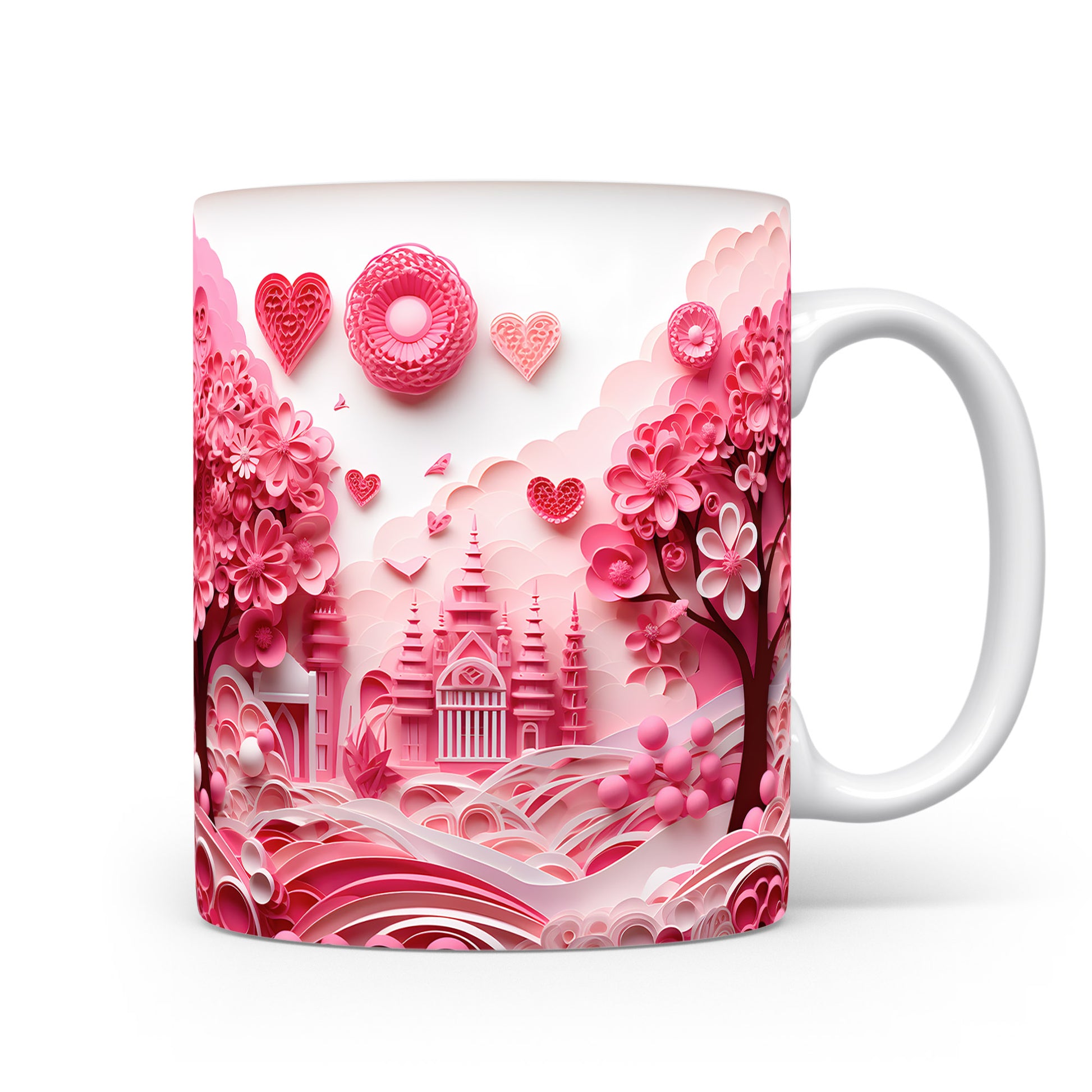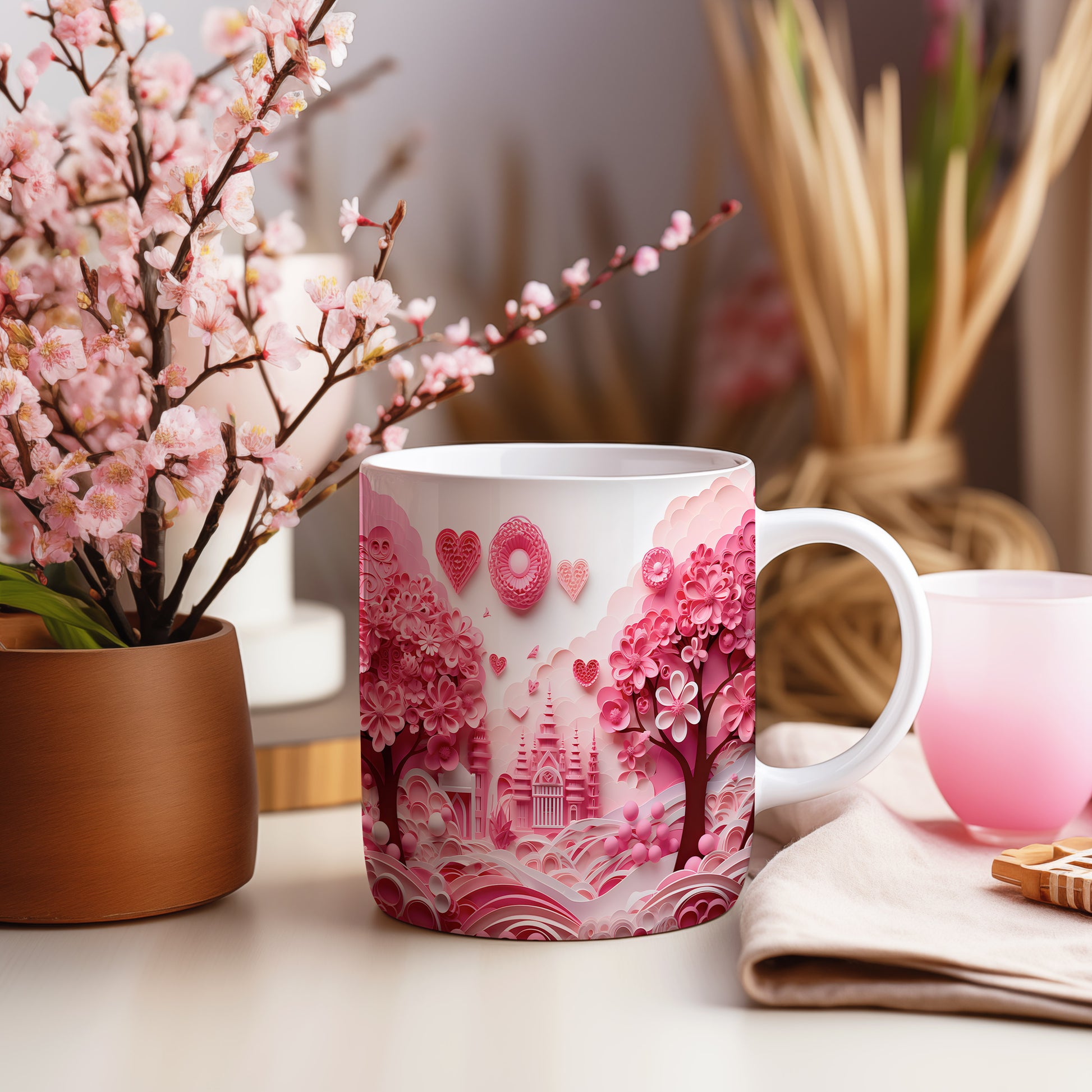 Hrnek s růžovým romantickým motivem a srdíčky