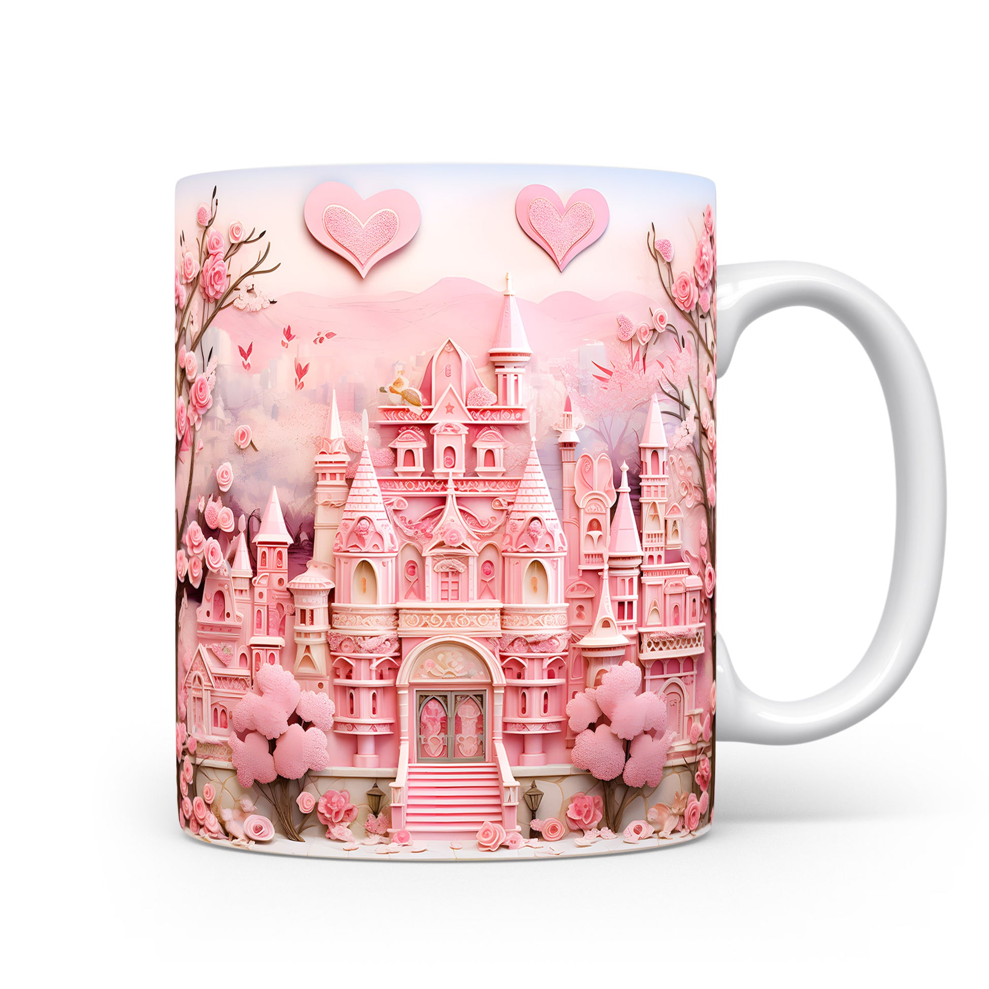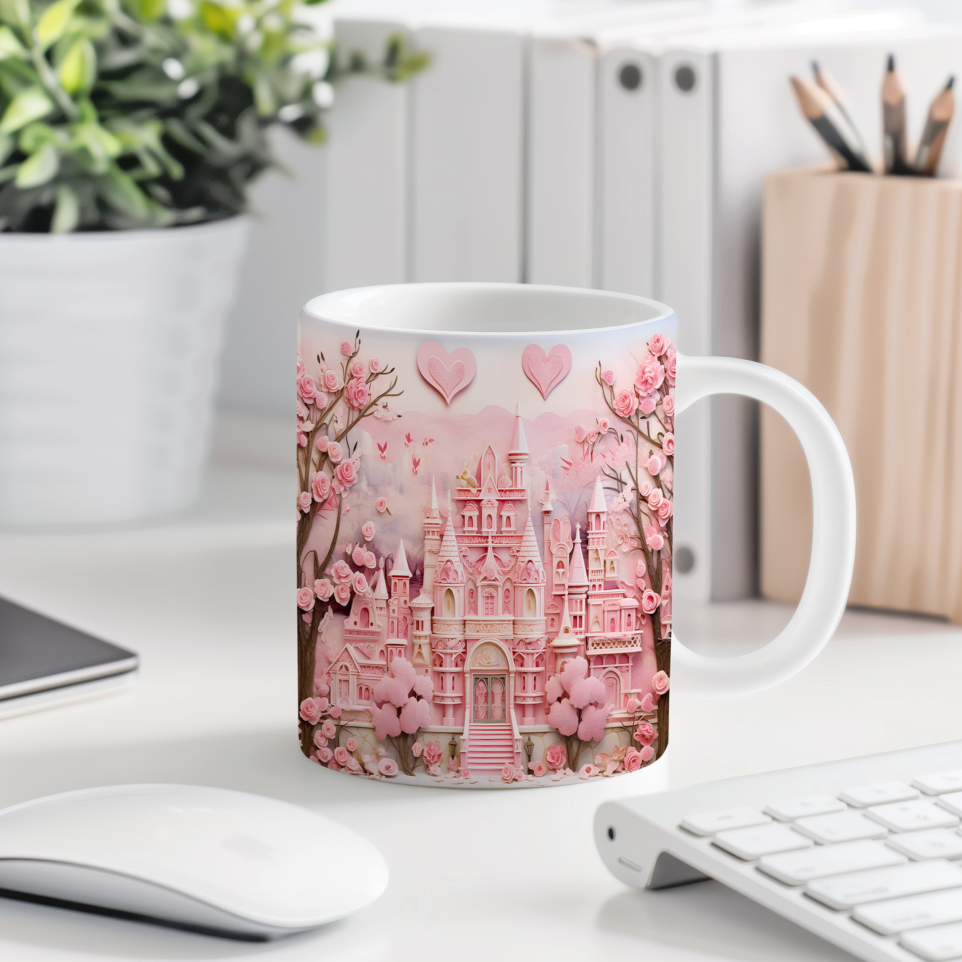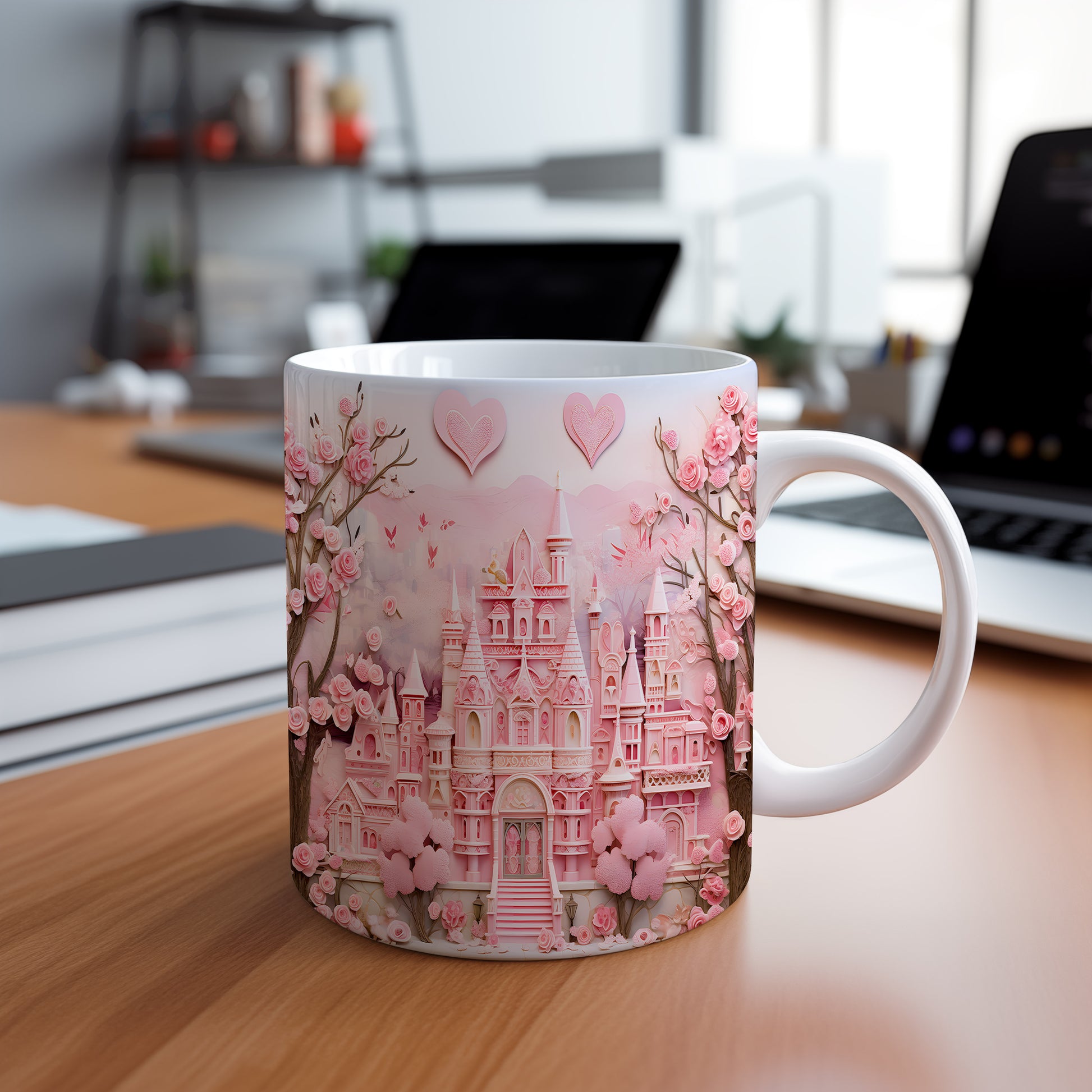 Objevte kouzlo pohádkového světa s tímto nádherným hrnkem. Růžový zámek obklopený květinami dodá každému dni kapku romantiky. Ideální pro snílky a milovníky pohádek.