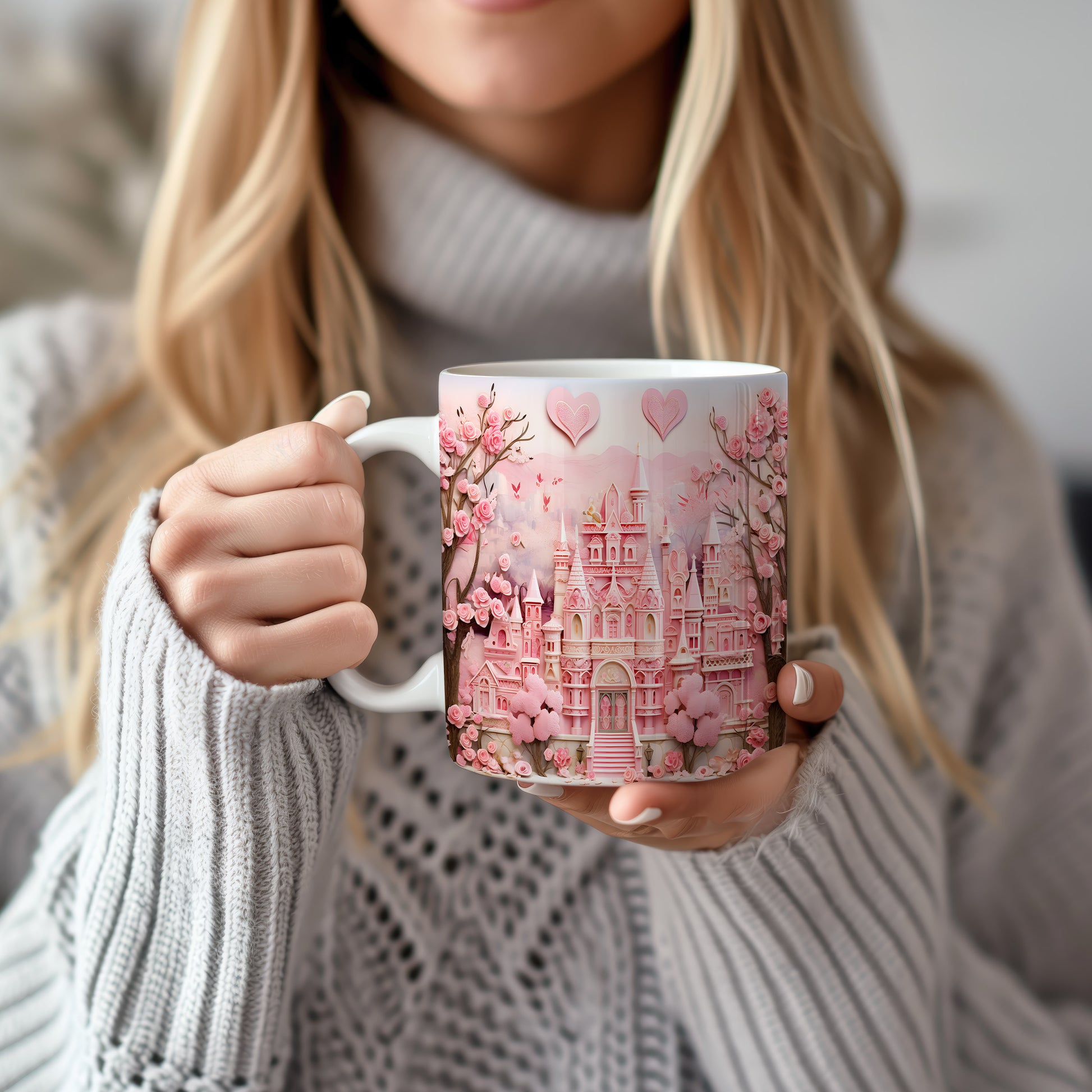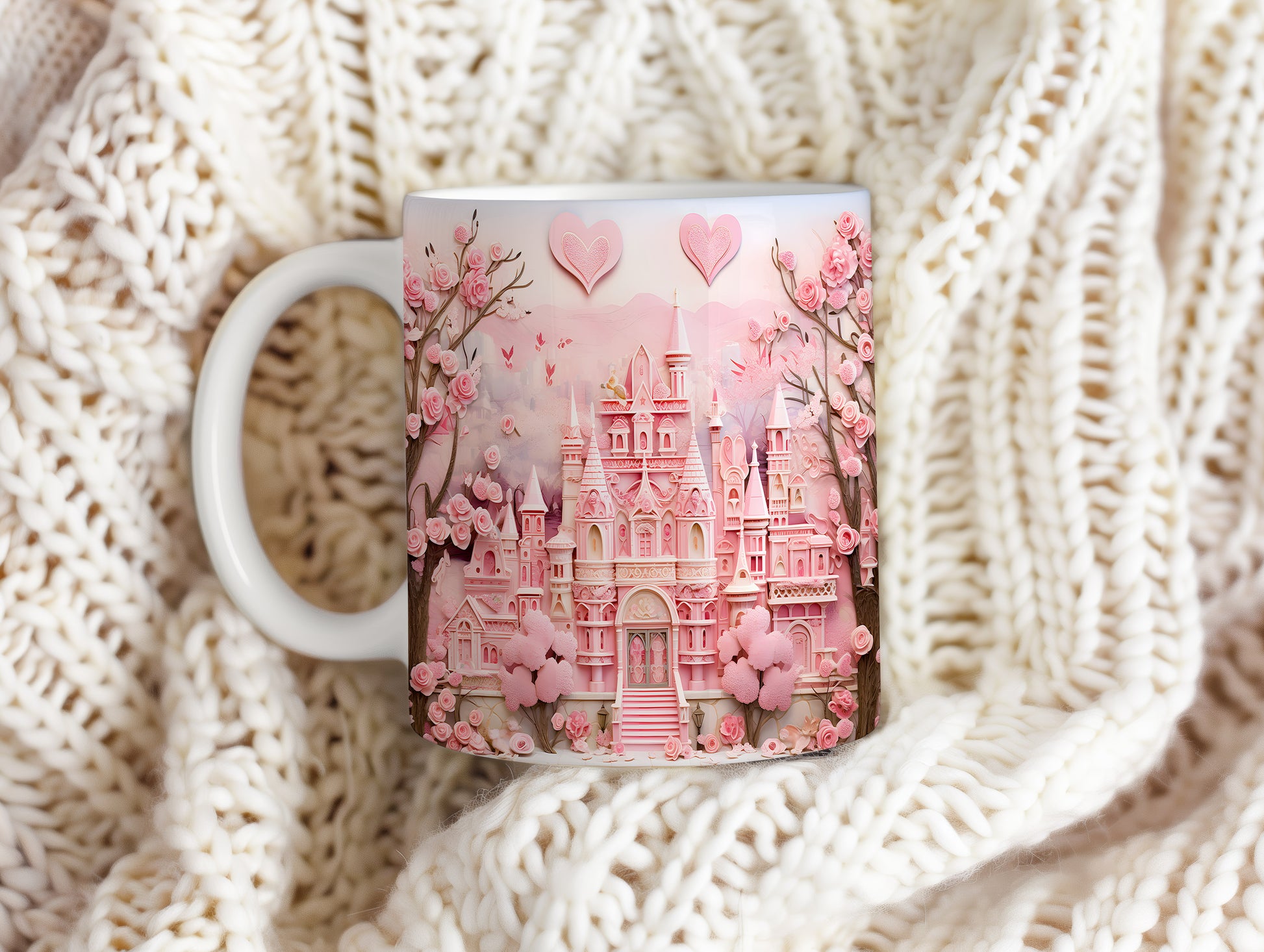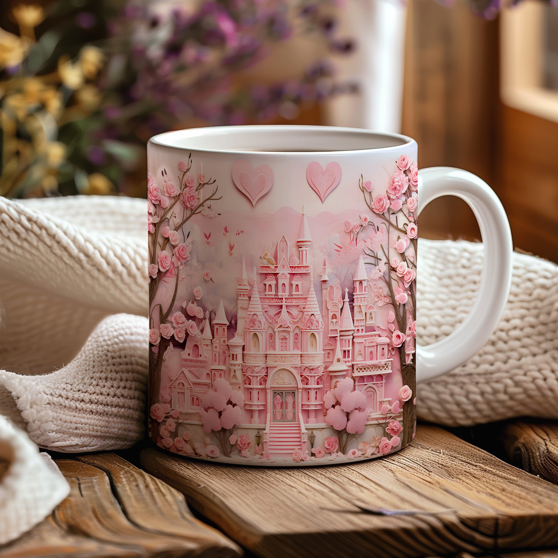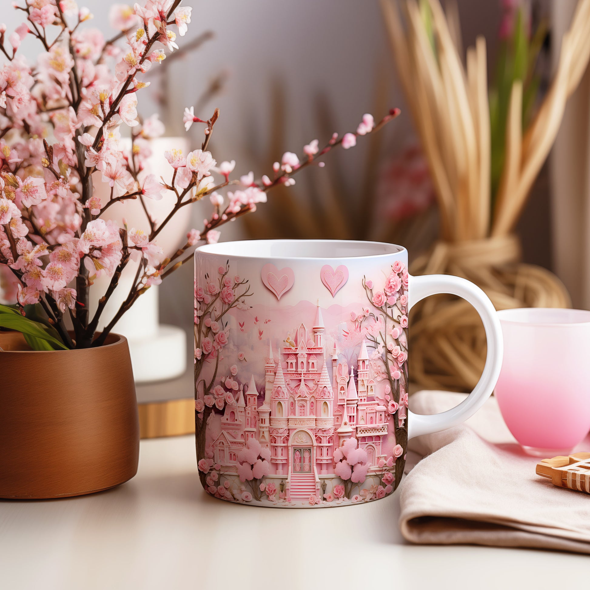 Objevte kouzlo pohádkového světa s tímto nádherným hrnkem. Růžový zámek obklopený květinami dodá každému dni kapku romantiky. Ideální pro snílky a milovníky pohádek.