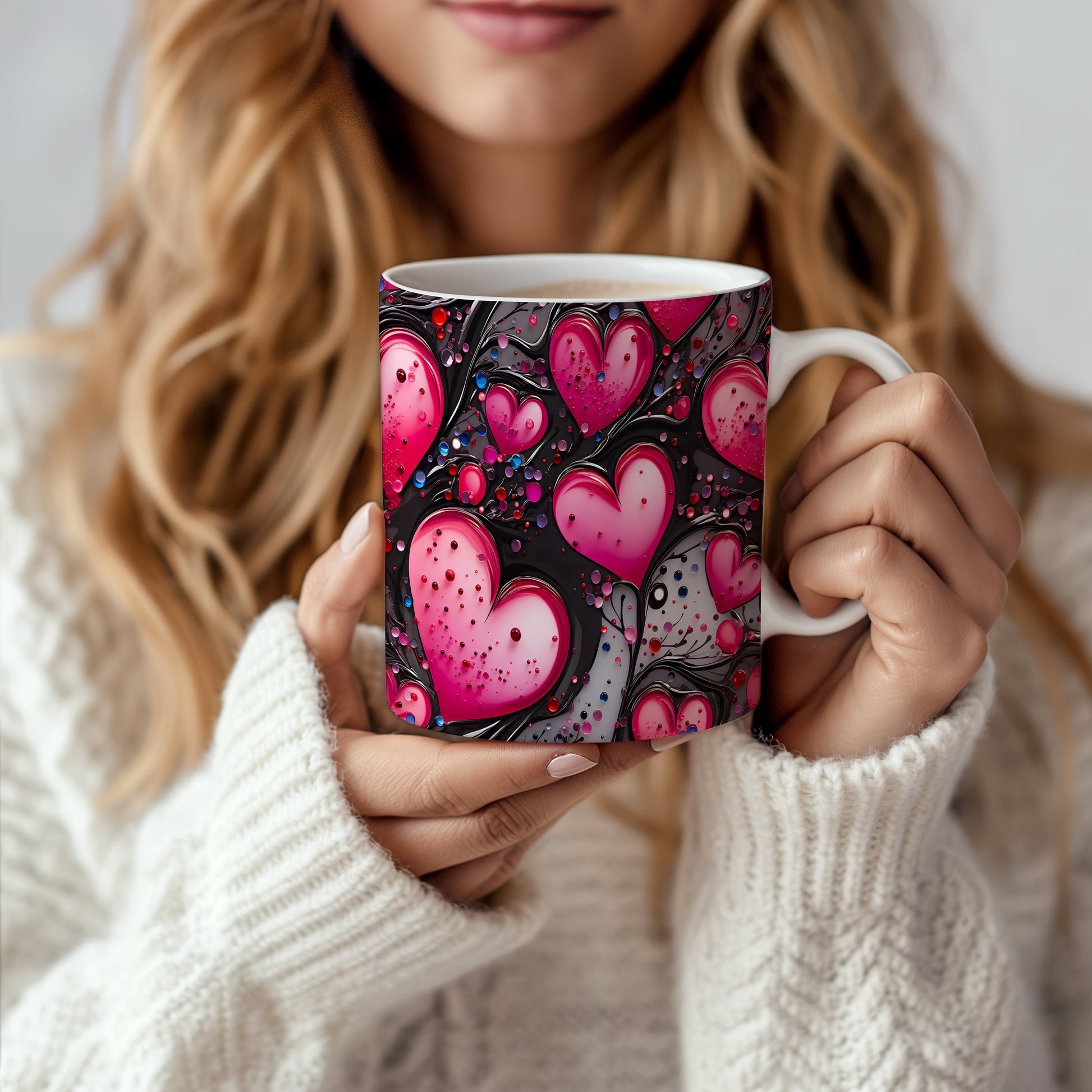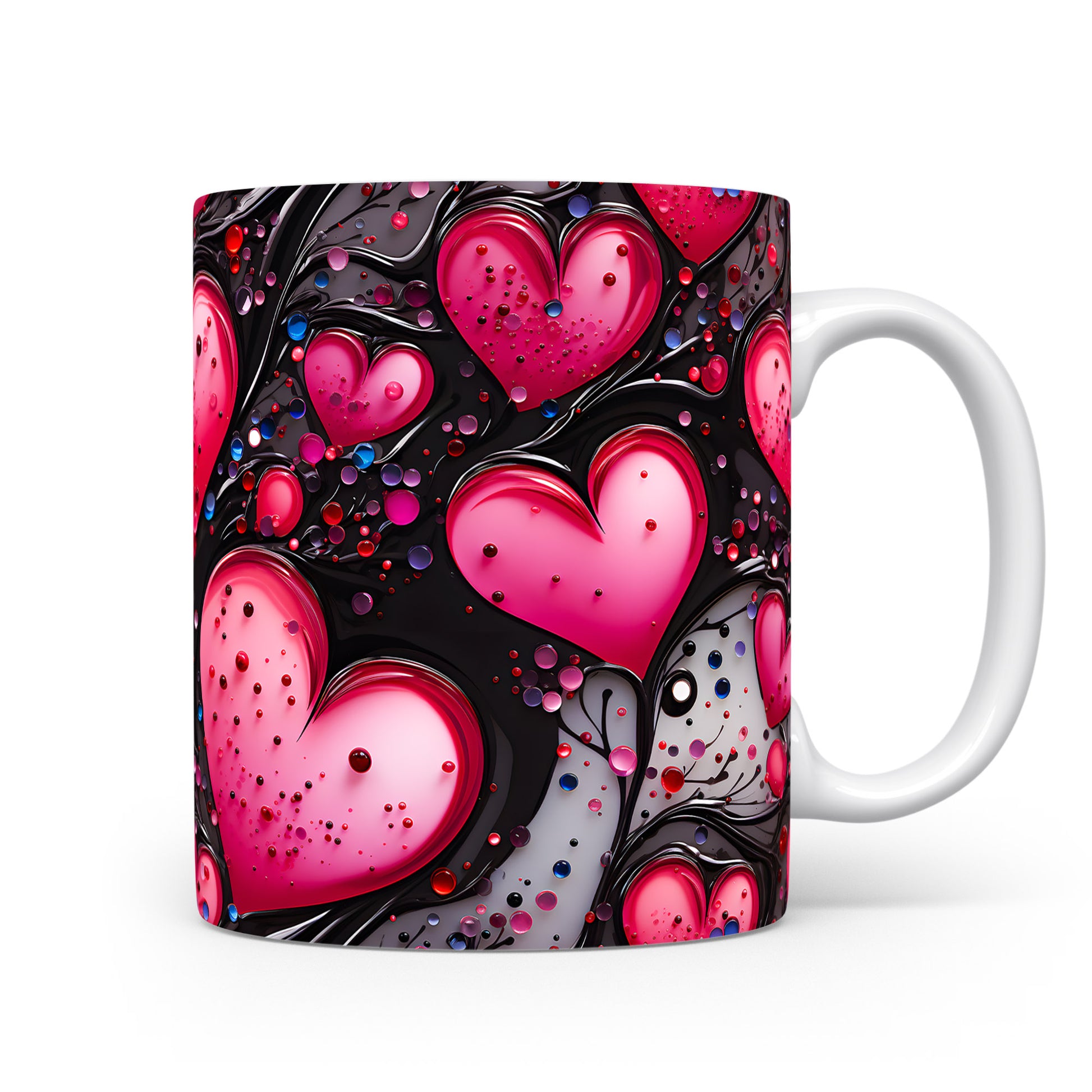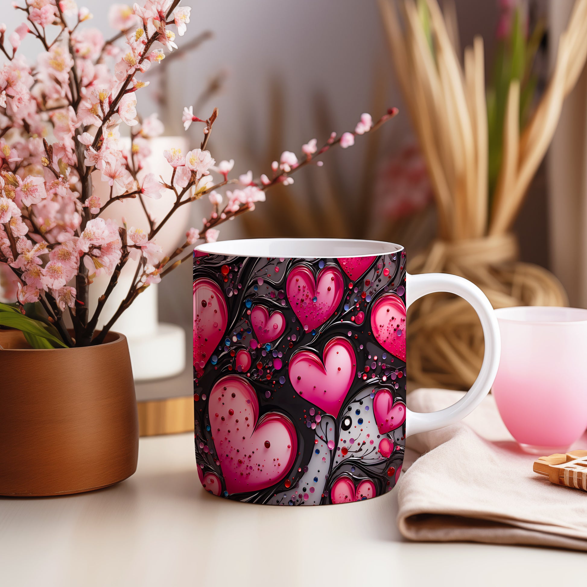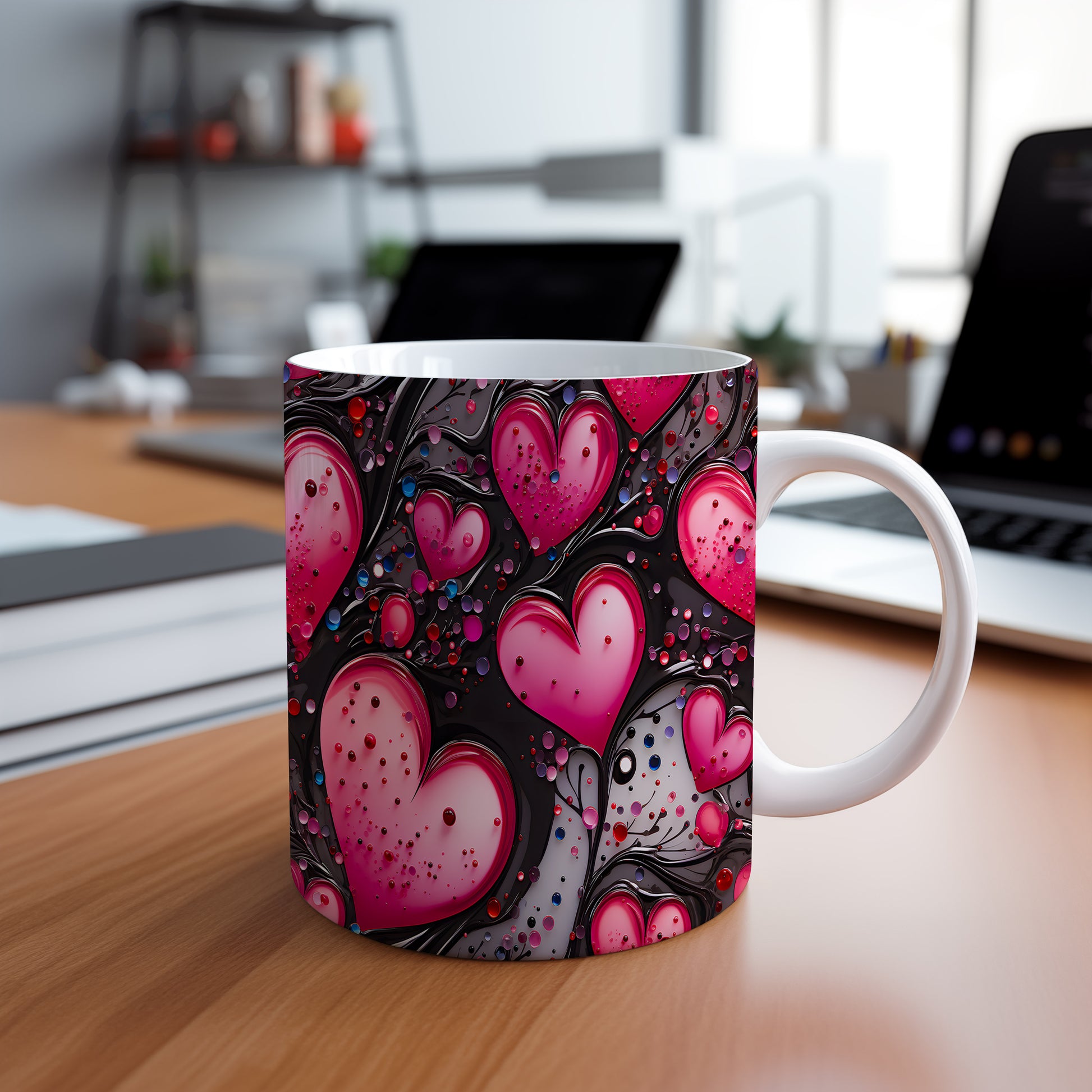 Vychutnejte si svůj oblíbený nápoj s hrnkem, který vyjadřuje lásku a vášeň. Růžová srdce na černém pozadí dodávají eleganci a romantiku každému okamžiku. Ideální dárek pro ty, které milujete.
