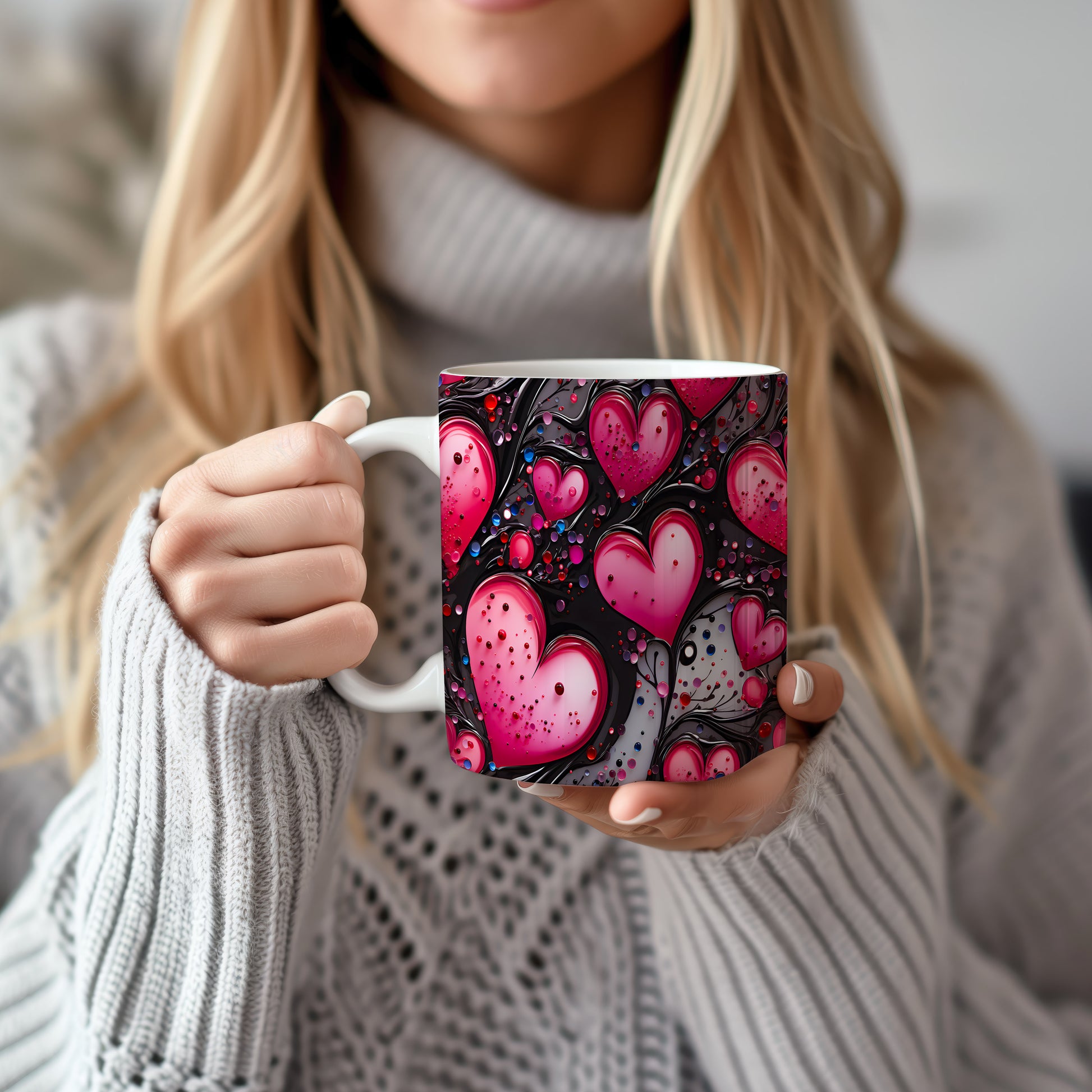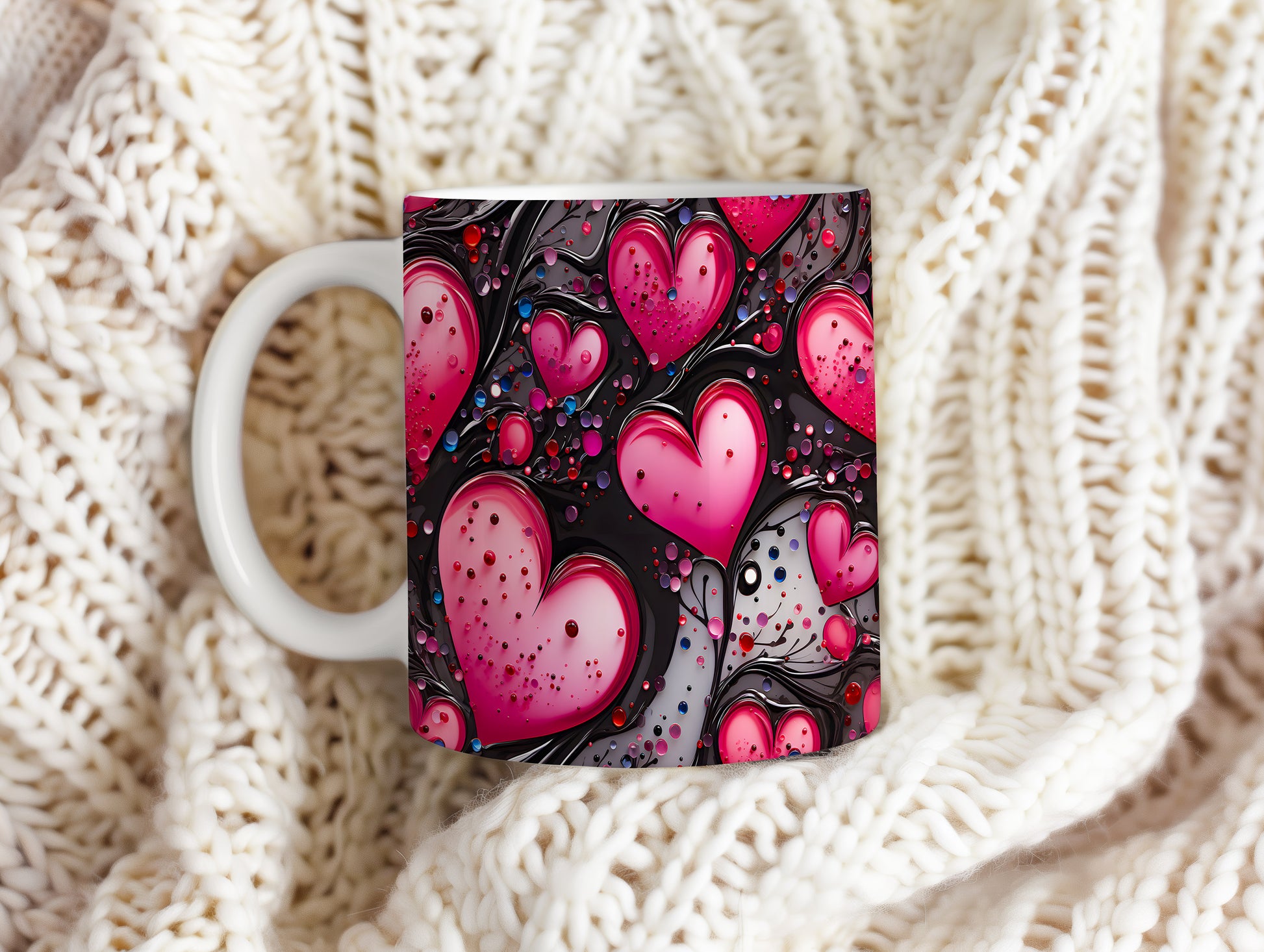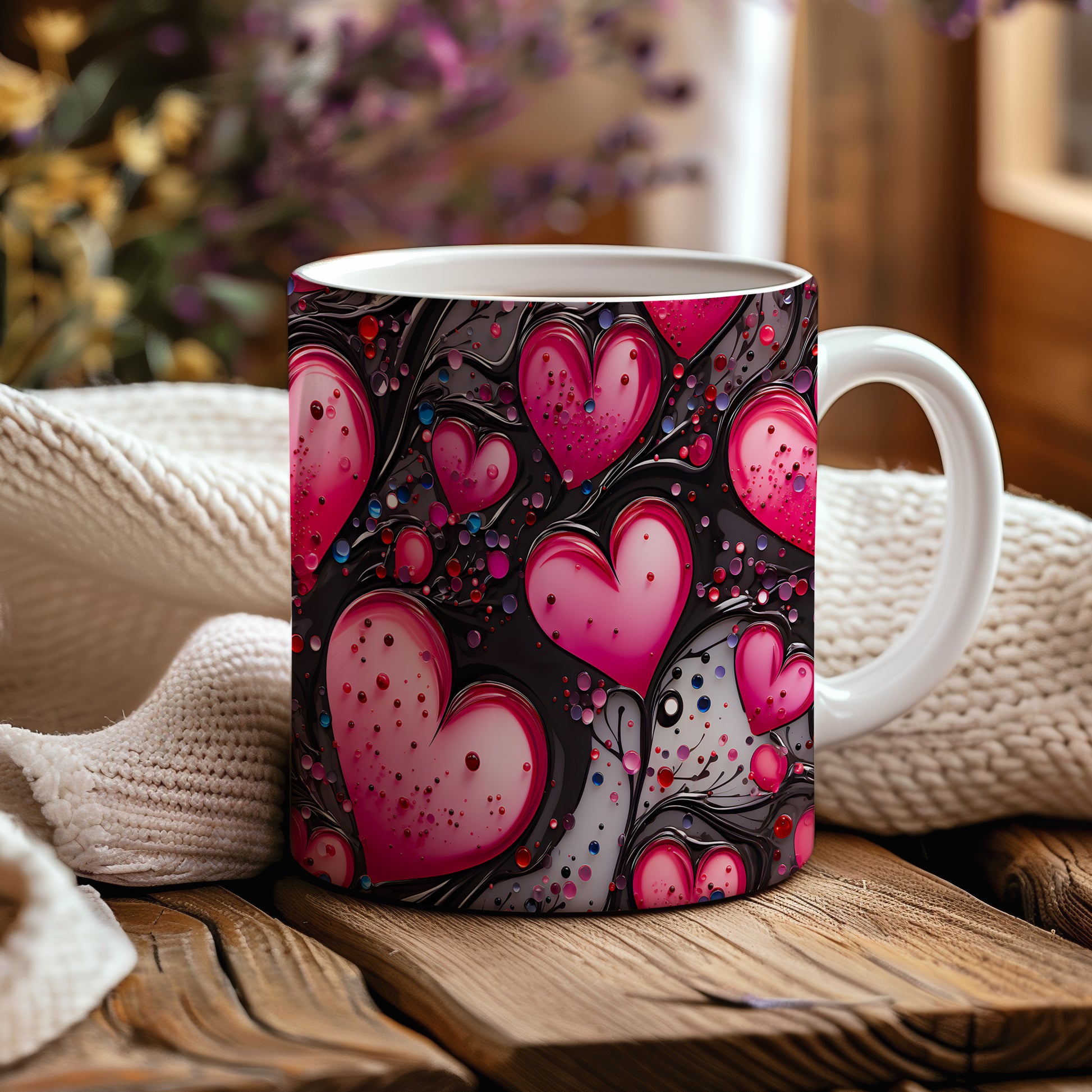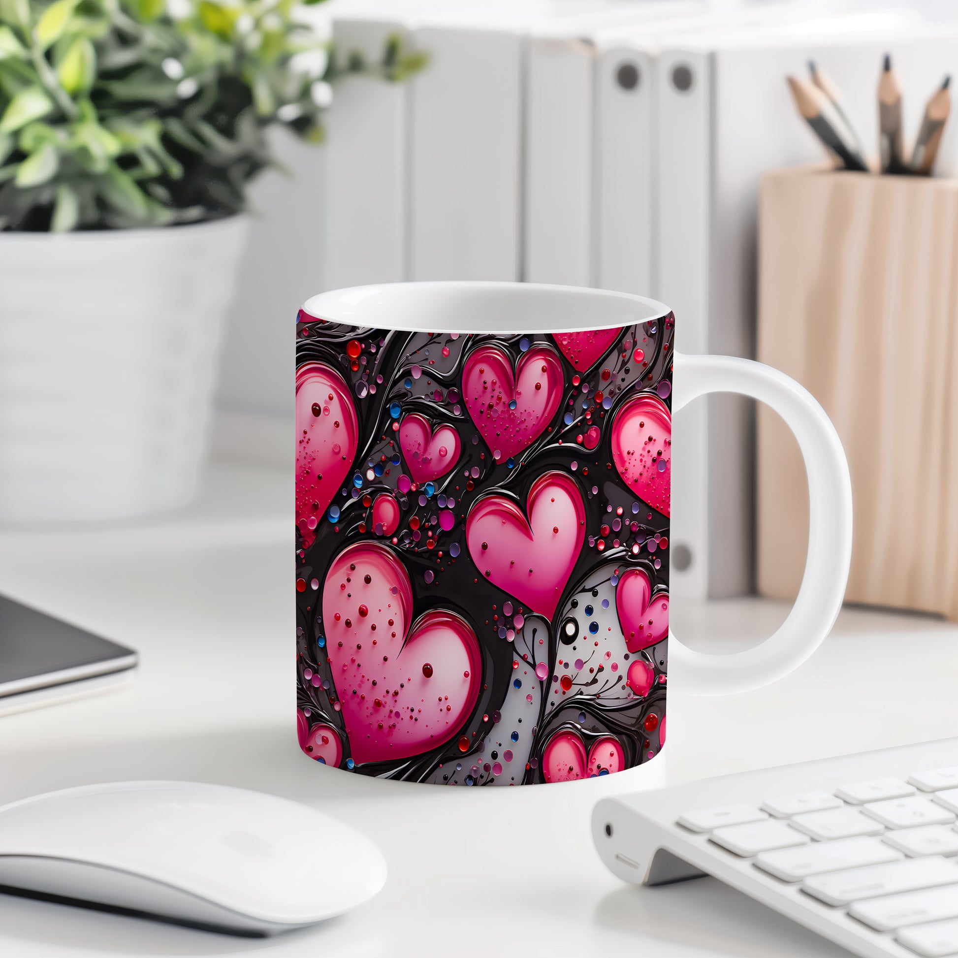Vychutnejte si svůj oblíbený nápoj s hrnkem, který vyjadřuje lásku a vášeň. Růžová srdce na černém pozadí dodávají eleganci a romantiku každému okamžiku. Ideální dárek pro ty, které milujete.